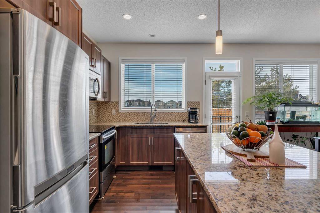 BACKING GREEN SPACE!! Welcome to this exceptional family home in the highly sought-after lake community of Auburn Bay. Ideally located on a quiet, family-friendly street, this beautifully finished home offers over 2,250 sq. ft. of thoughtfully designed living space and is just steps from schools, parks, restaurants, the lake, and all the amenities that make Auburn Bay such a vibrant place to live. Step inside to a spacious front entryway that leads into a bright open-concept main floor featuring rich hardwood flooring throughout. The main level also includes a generous dining area and a timeless kitchen designed for both everyday living and entertaining, complete with granite countertops, stainless steel appliances, and a large island with breakfast bar seating. Upstairs you’ll find a functional three-bedroom layout plus a large bonus room, perfect for movie nights, a play area, or a home office. The primary suite features a walk-in closet and a private 4-piece ensuite, creating a comfortable retreat at the end of the day. The fully developed basement expands the living space even further with a fourth bedroom, recreation area, 3-piece bathroom, and laundry room with ample storage. Step outside to enjoy your fully landscaped backyard, complete with a spacious deck and lush lawn — ideal for summer barbecues, entertaining guests, or relaxing with family while enjoying the peaceful green space behind. Additional highlights include central air conditioning, a single attached garage, and quick access to Stoney Trail and Deerfoot Trail, making commuting throughout Calgary easy and convenient.
