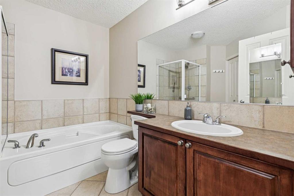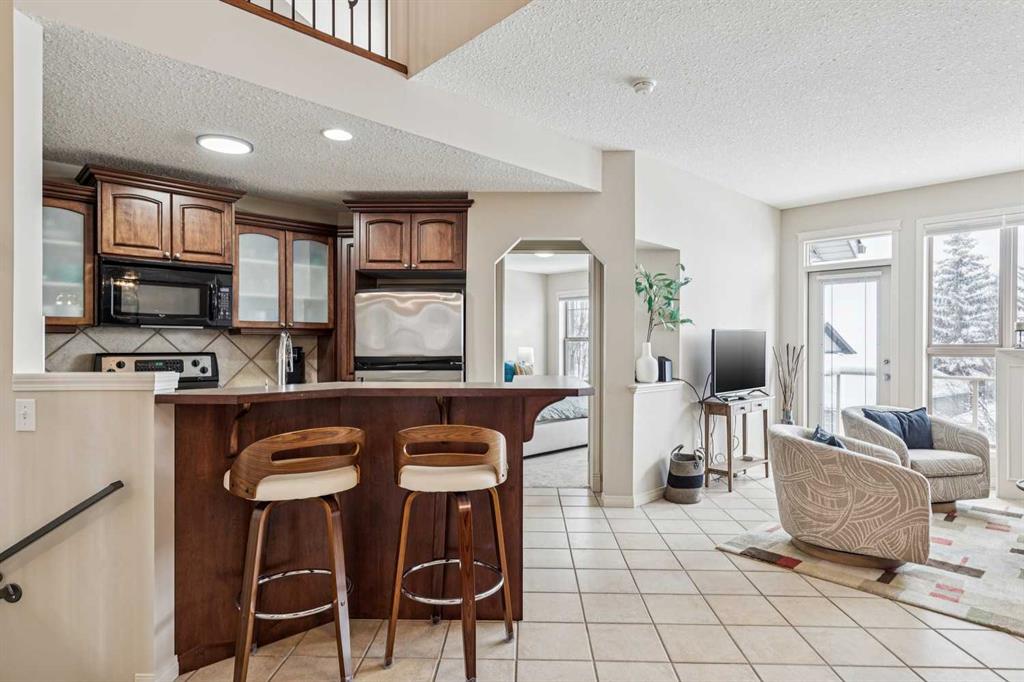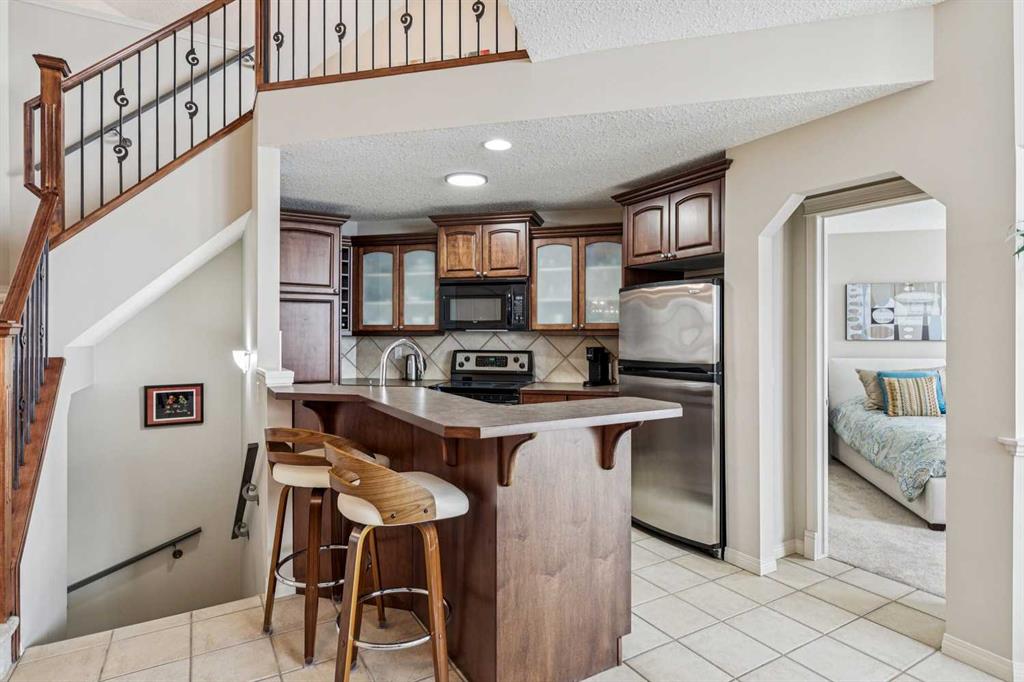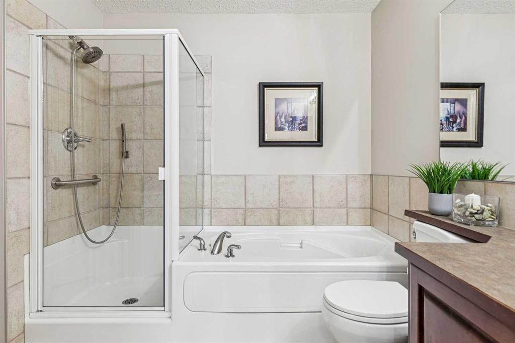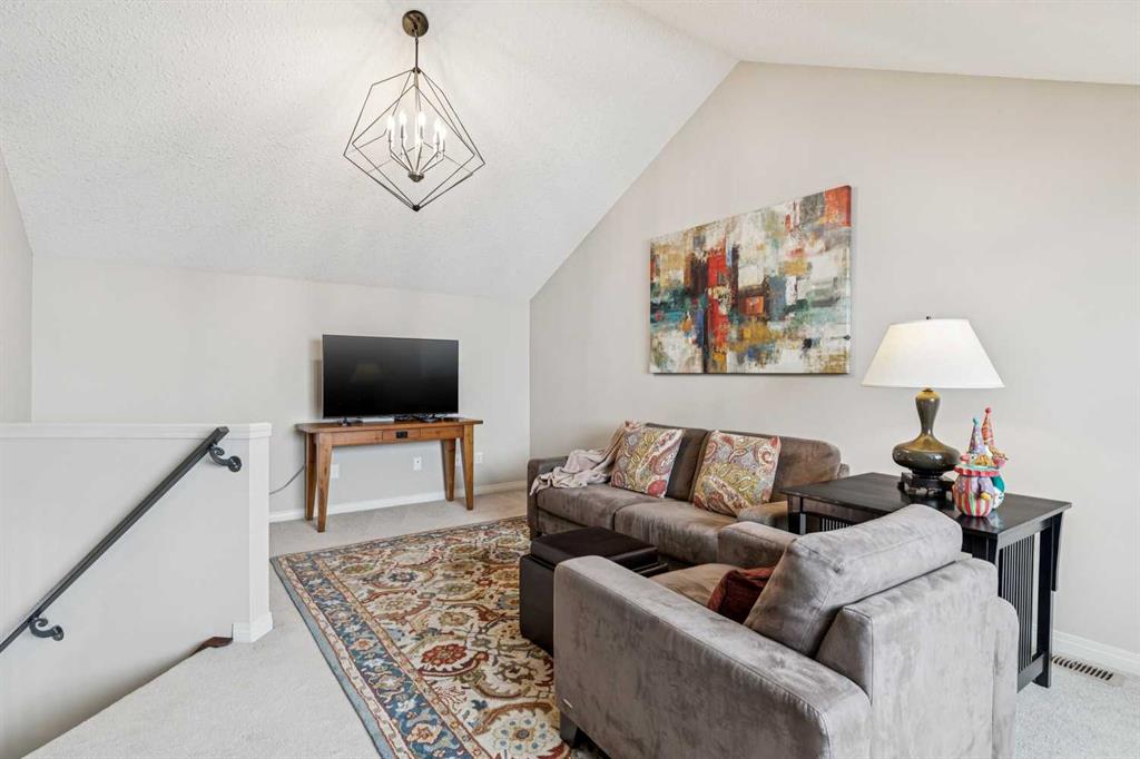 Designed for effortless living and lock-and-leave freedom, this south-facing bungalow villa with mountain views is the perfect next chapter for empty nesters, snowbirds, or anyone ready to downsize without compromise. With a second-floor loft and fully developed walkout basement, this home offers the space you want for guests, hobbies, and entertaining, without the maintenance you don’t. A welcoming foyer sets the tone, with a private home office tucked behind French doors, the ideal spot for part-time work, planning your next getaway, or managing life with ease. The main living area is bright and inviting, where large windows frame the fireplace and fill the space with natural light. An open dining area flows seamlessly into the kitchen, featuring stainless steel appliances, warm wood cabinetry, an efficient layout, and a breakfast bar perfect for casual mornings or wine with friends. The main floor primary suite is bright and comfortable, complete with double closets and a spacious ensuite featuring a soaker tub and rough-in for laundry, offering true single-level living if desired. Upstairs, the vaulted loft overlooks the main floor and adds flexible bonus space for whatever your lifestyle calls for, a TV lounge, reading retreat, fitness area, or creative workspace. The fully developed walkout basement expands your living space even further with a generous family room, guest bedroom, full bathroom, laundry room, and excellent storage. Step outside to the west-facing deck and take in the mountain views, a beautiful backdrop for morning coffee, and relaxed evenings outdoors. The covered patio below opens to a beautifully landscaped shared green space with mature trees. Additional updates provide peace of mind, including a new furnace (2025), washer and dryer, hot water tank, water softener, and air conditioning (2024). A double garage plus convenient visitor parking directly across from the unit make everyday living easy. Perfectly located for a low-maintenance lifestyle, you’ll appreciate quick access to Stoney Trail and Glenmore Drive, with shopping, dining, and amenities at Westhills just minutes away, along with the Westside Recreation Centre up the street. Lock the door, travel with confidence, and come home to comfort, views, and effortless living.