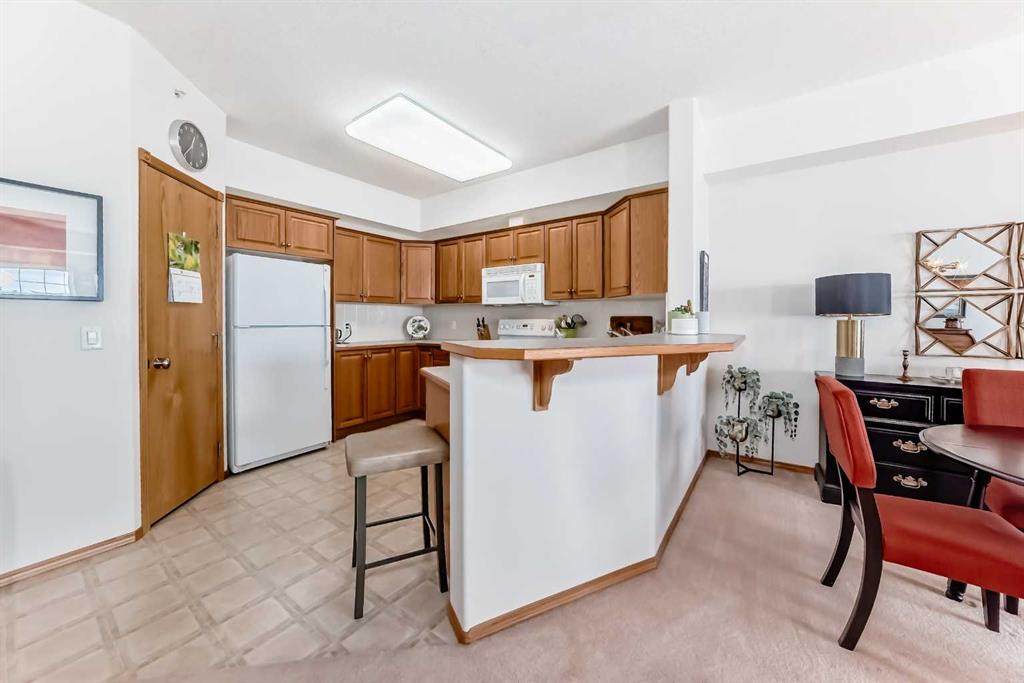 Looking to downsize but thinking an apartment might be too small? At over 900 sf this immaculate top floor unit offers plenty of space for all your furniture including the dining room set! The spacious entry has a double closet for all your exterior clothes. The spacious large living room has an electric fireplace, large windows and plenty of options for furniture placement. The separate dining area will accommodate a cabinet and there’s room to stretch out the family dining room table. The kitchen features a corner pantry, good counter space, and a raised eating bar, ideal for casual meals or entertaining.