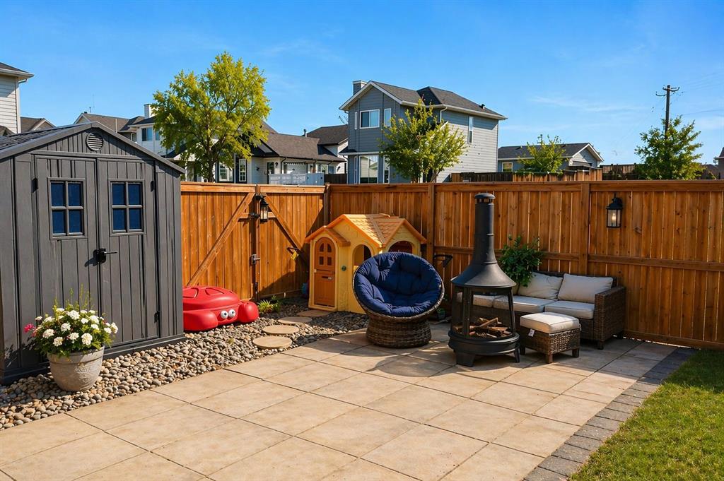 Step outside to enjoy your own private oasis in the **fully fenced and landscaped backyard**, complete with a deck, concrete patio, and a dedicated area for a fire pit. The yard is designed for both relaxation and recreation, with double swinging doors providing convenient access for RV parking alongside ample storage in the sheds for tools and toys.