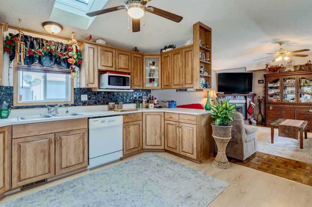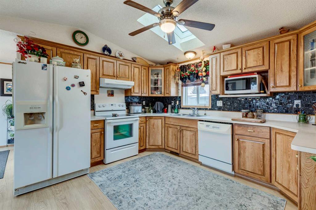 The bright, sun-filled kitchen is equally inviting, showcasing oak cabinetry, tile backsplash, generous counter space, and large windows that bring the outdoors in. The home has been exceptionally well maintained, with key updates over the years including: hot water tank (2024), roof (2021), skirting and heat tape (2019), sliding patio door (2015), and toilets (2014), offering peace of mind for years to come.