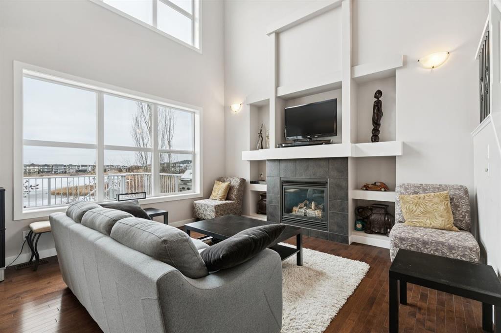 The impressive living room features an OPEN-TO-ABOVE CEILING, a cozy FIREPLACE, and custom BUILT-IN FEATURES that add both style and function.