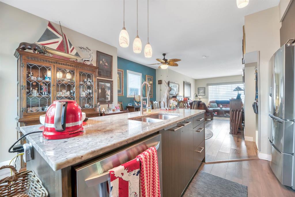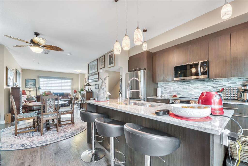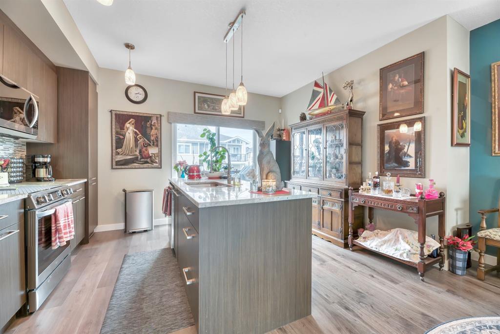 Experience carefree living with all of Chestermere’s amenities just steps from your front door. Walk to shopping, restaurants, bars, gyms, the library and of course – the lake, beach and the many picturesque parks and pathways Westmere has to offer including an a huge off leash dog park! This end unit townhome is immaculate, move in ready and thoughtfully laid out over 3 levels giving you both open plan living perfect for entertaining and gathering as well as quiet intimate spaces for work or relaxation. On the main level is a private office space that is perfect for anyone who is looking to work or study from home. There is even a 2 pc powder room conveniently located on this level. The main floor is open concept, flooded with natural light and boasts 9’ ceilings. The well equipped kitchen is complete with sleek European style cabinetry, newer stainless steel appliances including an induction stove, granite counters and an island with seating. A good sized dining area is located between the kitchen and the warm & welcoming living room. There is a great deck off the kitchen to enjoy some outdoor time.. 3 good sized bedrooms are found on the 3rd level including a primary complete with 3 pc ensuite bath with granite countertops as well as his and hers closets outfitted with Denca custom cabinetry. The main bath also has granite countertops and is ideally located right next to the second and third bedrooms and you’re going to love the convenience of upstairs laundry which is discreetly tucked into its own closet. Check out the Hunter Douglas thermal cell blinds keeping your home cool in summer and warm in the winter. Second floor blinds have remote control features which adds another level of privacy. New carpet has been added to both sets of stairs. The attached single car garage is insulated, heated and drywalled and comes with added shelving for storage. A fenced front yard is perfect for pets and kids to play because yes your fur babies are welcome in this pet friendly with board approval complex. But there’s no need to bring your shovel since snow removal and grounds maintenance is included. Whether you’re looking for your first home, a little more space for a growing family or downsizing for less maintenance and financial freedom this home fits the bill. You are going to love living in the vibrant community of Chestermere. Book your showing now.