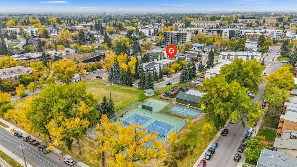 ** Open House, Sun, Jan 11, 11-1pm ** Prime townhome in a choice Bankview location across from a park, tennis courts and community center. Thoughtful architectural design boasts a spacious, 2 bedroom, 2.5 bathroom floor plan complete with gourmet kitchen, dining area, & great room. The main floor accommodates an open concept featuring quarter-sawn mahogany hardwood floor throughout. The central kitchen has a large cabinet style pantry, dark-stained full maple cabinets, and elegant quartz countertops complemented with stainless steel appliances. Each of the two bedrooms on the second floor is equipped with a private ensuite, presenting polished marble countertops, & expansive vanity mirrors. This townhome is nestled in the heart of the city in one of Calgary’s oldest communities; a fantastic location that embodies both the charm of an established community and all the conveniences of urban living.
