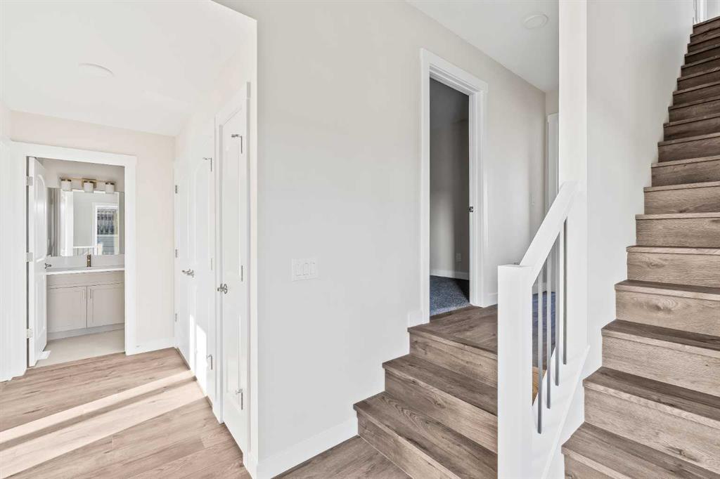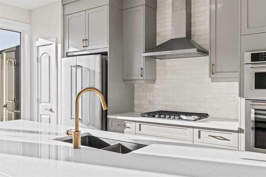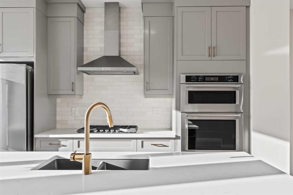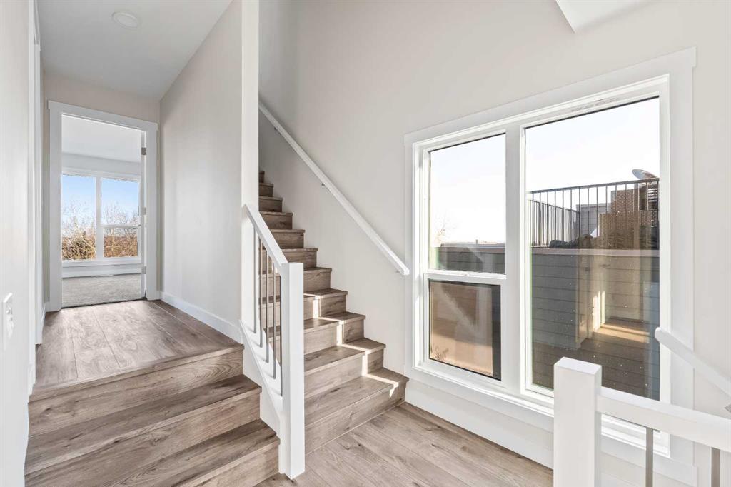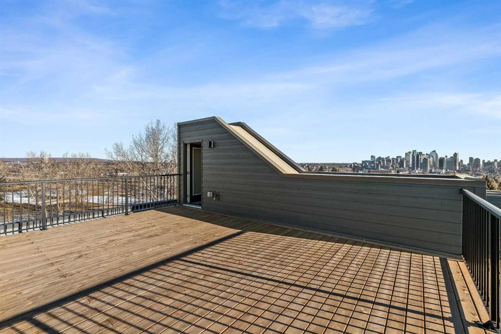 The crown jewel of Crown Park is now available. This exceptional end-unit Stanley townhome presents a rare opportunity to own one of the last remaining residences in this highly sought-after community, offering breathtaking, unobstructed views of Calgary’s downtown skyline while overlooking the Shaganappi Golf Course. At over 2,300 sq. ft. of thoughtfully designed living space, this brand-new urban townhome features 3 bedrooms, 2.5 bathrooms, a dedicated home office, a versatile flex space, and three expansive outdoor living areas, including an impressive 400 sq. ft. rooftop patio. The lower level welcomes you with a covered patio spanning the full width of the home, creating a private outdoor retreat overlooking green space and the street. Inside, a generous ~18’ x 14’ flex room with 10′ ceilings offers endless possibilities – ideal for a media room, home gym, studio, fourth bedroom, or additional office space. The main level is designed for effortless entertaining, showcasing a stunning open-concept layout enhanced by walls of windows that flood the space with natural light. The chef-inspired kitchen is beautifully appointed with a gas cooktop, built-in wall oven and microwave, chimney hood fan, and a large central island with seating. Flowing seamlessly into the spacious dining area and family room, the space is anchored by a striking fireplace with a full plaster surround extending to the soaring 11’ ceilings. Step outside to the ~175 sq. ft. balcony, spanning the width of the home and overlooking tranquil green space. The upper level has been intelligently designed with privacy in mind. The luxurious primary suite is positioned at the front of the home and features a wall of windows with green-space views, a large walk-in closet, and a spa-inspired 4-piece ensuite with dual sinks and a tiled walk-in shower. Two additional bedrooms, a full bathroom, upper-level laundry, and a den complete this floor. The rooftop patio is truly an entertainer’s dream – equipped with gas lines and ample room for both lounge and dining areas – offering the perfect setting to host guests while enjoying spectacular downtown skyline views. Completing this home is a private double attached garage and additional storage space to keep your vehicle and valuables safe all year long. This brand new home comes with full builder warranty and Alberta New Home Warranty – allowing you to purchase with peace of mind. This home is ideally suited for professionals, families, or investors seeking a brand-new property with space to grow in one of Calgary’s most desirable inner-city locations, just minutes from downtown.