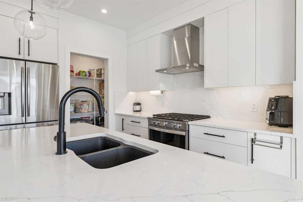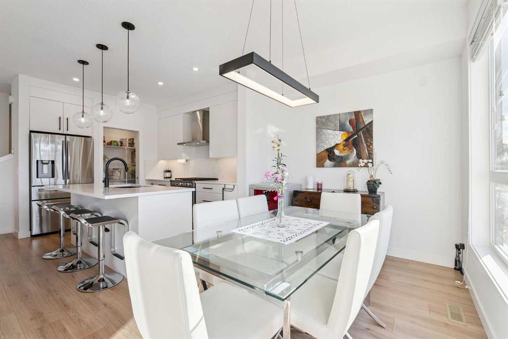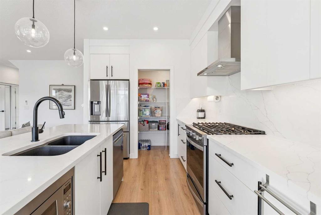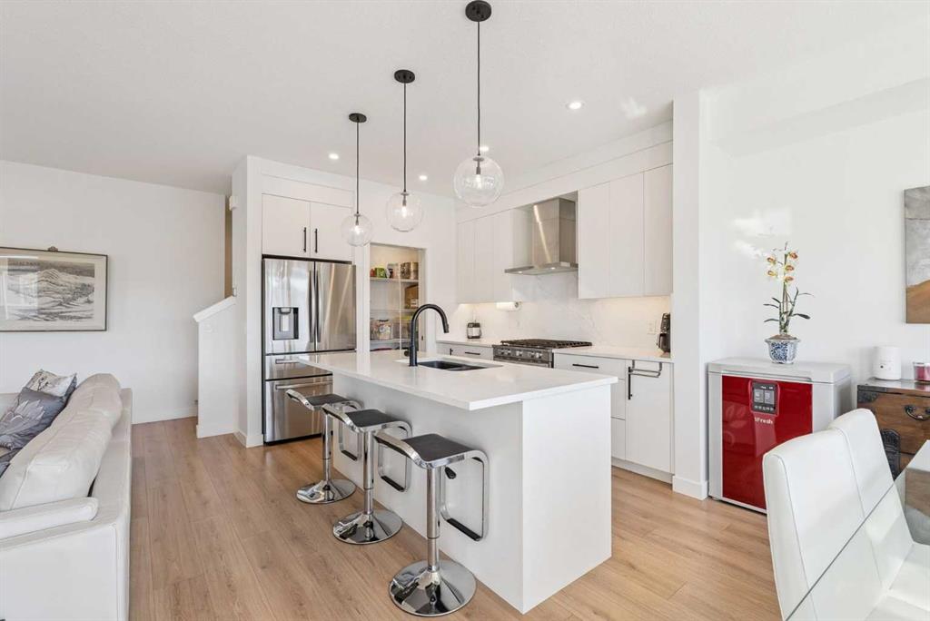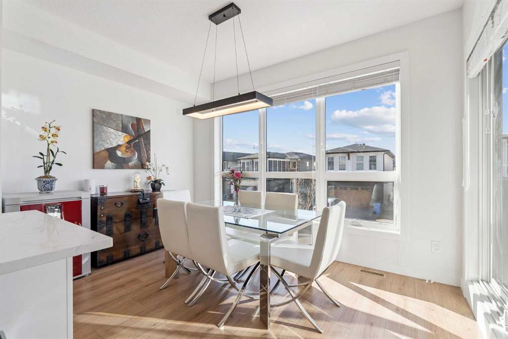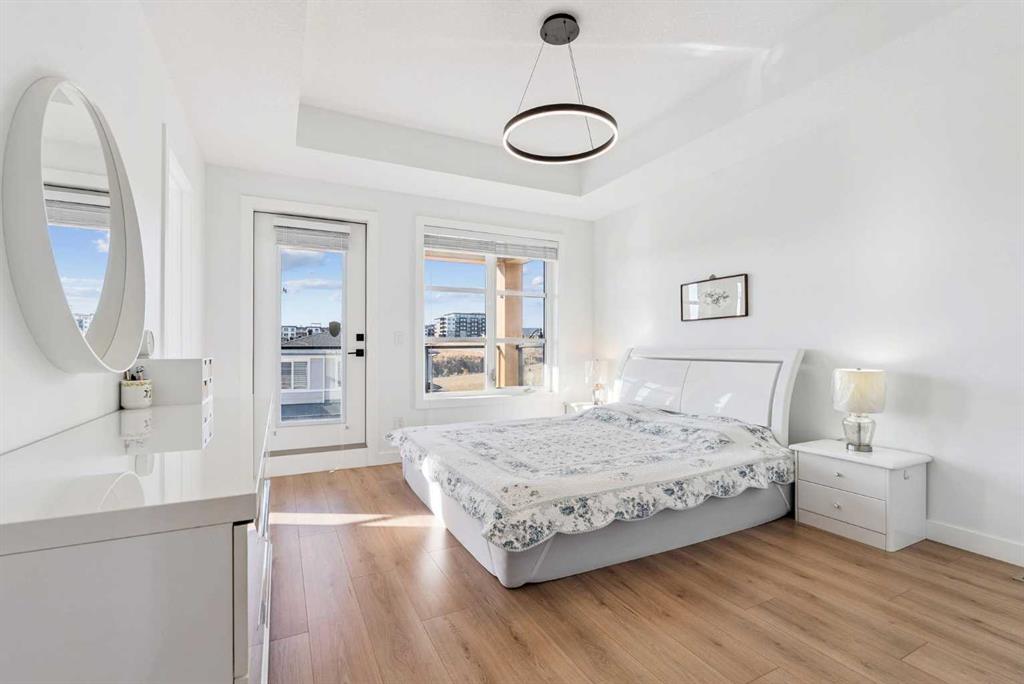*** OPEN HOUSE May 2 SAT 1:30pm-3:30pm & May 3 SUN 2:00pm-4:00pm. Absolutely the lowest price ever! Priced for a quick sale! This END UNIT luxury townhouse with over 2,400 sqft living space offers total 4 bedrooms, 3.5 bathrooms with fully developed walk-out basement, plus heated double (side-by-side) attached garage. The ARCOLA by Truman, a contemporary community, is more than just a typical townhouse, but it is a luxury lifestyle home where you can enjoy convenience without compromising its style and square footage. As you enter the home, the gorgeous tiled foyer welcomes you with an open-concept, 9ft ceiling, and designer finishes. Luxury vinyl plank flooring throughout all three levels, and no more ugly carpet here. The spacious living room is filled with natural light and provides ample space for relaxing and entertaining. The kitchen is showcasing quartz countertops, premium stainless steel appliances pkg, including a T-shaped chimney and gas stove, generous cabinetry, a spacious corner pantry, and a large central island with a breakfast nook. The dining area is surrounded by loads of windows, and a powder room completes the main level. Off to the balcony for morning coffee with your favorite books or alfresco lunch or evening wines. Upstairs, retreat to a spacious primary bedroom featuring a walk-in closet and a spa-inspired 5-piece ensuite with dual sinks and a deep soaker tub on a gorgeous tiled floor. Step out to a dedicated balcony from your bedroom to enjoy the mountain view and fresh breeze. Two more bedrooms are big enough for kids or adults, each with its own walk-in closet, and sharing a 4pc bathroom. There is a convenient upper-level laundry room with shelves. Fully developed WALK-OUT basement expands your living space with a 9 ft ceiling and a huge family room for a home theater, home office, and/or home gym. The 4th bedroom and another 4pc bathroom are perfect for overnight guests, teenage children, or to rent out for additional income. The heated double garage can fit two cars and still provides additional storage space for all your seasonal gear. For more comfortable living, value-added features are garburator, ceiling fan, and air conditioner. The layout of this home was one of the top sellers, and it does not come to the market very often. Not to mention – just a few minutes’ drive to the top-rated schools, Westside Rec Centre, parks, playgrounds, grocery shops, restaurants, cafes, major roads, and public transit to offer the ultimate balance of lifestyle and accessibility. Don’t miss this golden opportunity. Book your showing today