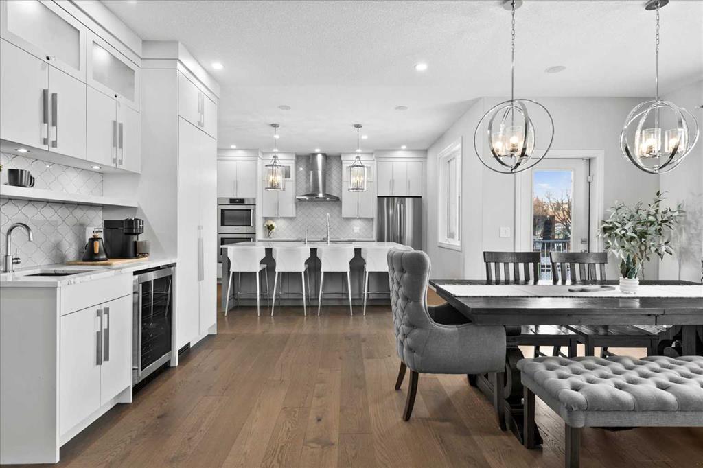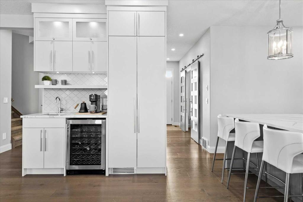 Beautiful two-storey family home in Gleneagles offering over 3,800 sq. ft. of developed living space on large fenced lot overlooking the 14th fairway. The heart of this home is the fully renovated contemporary kitchen, featuring a quartz central island, built-in cabinetry, central vac with kitchen sweep inlet, and stainless-steel appliances—perfect for everyday living and entertaining. A stylish coffee bar with new wine fridge sits adjacent to the kitchen, while the spacious dining area is surrounded by windows overlooking the expansive yard and golf course. The inviting living area showcases an updated fireplace mantel and tile surround. The main floor is complete with a large, bright front den, hardwood flooring throughout, and a fully renovated 2-piece bath. Note the spacious back entry cupbaords and customized built-in locker cubbies.