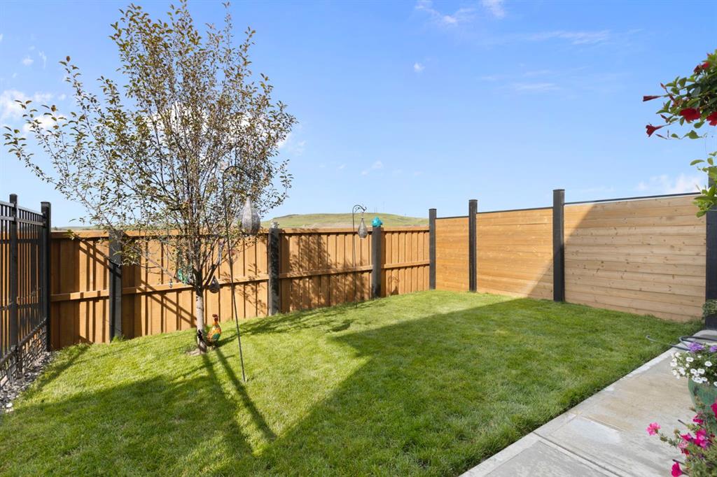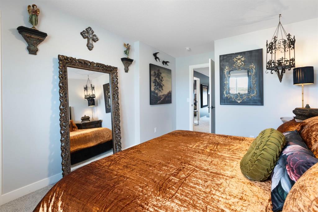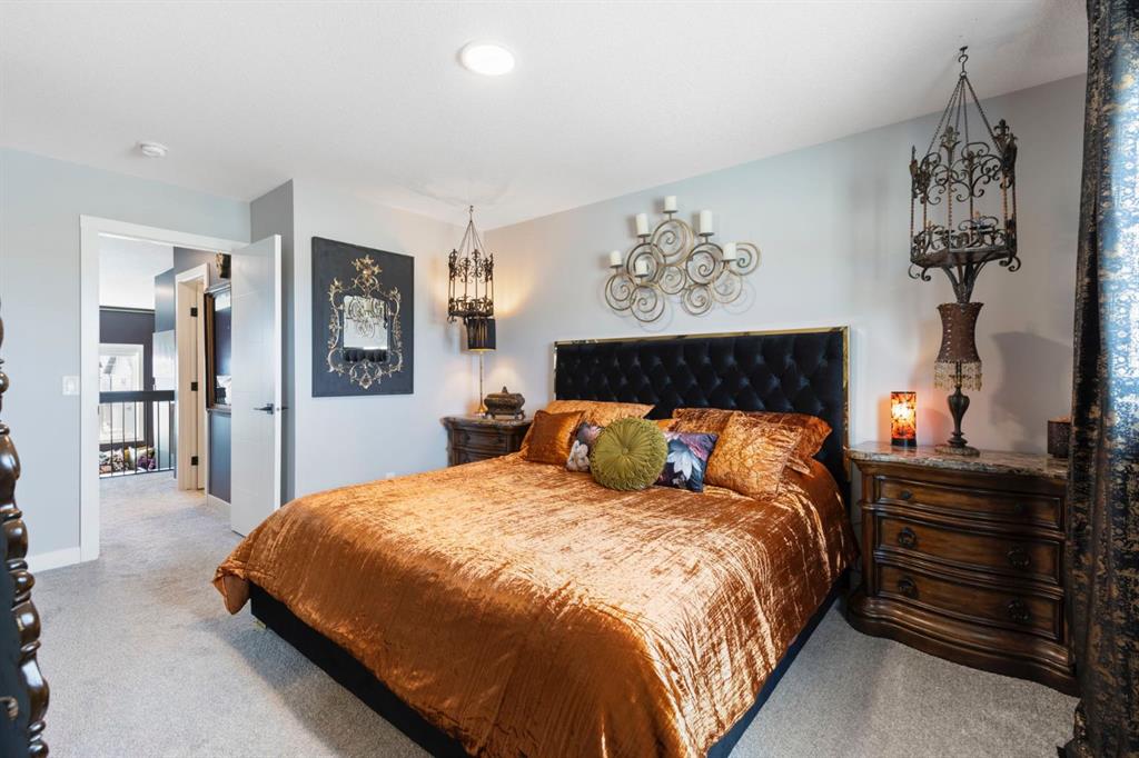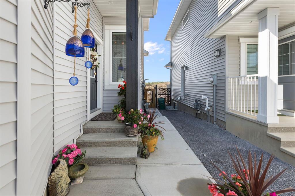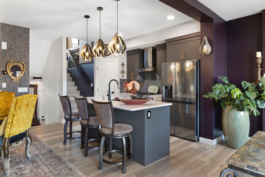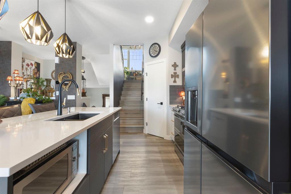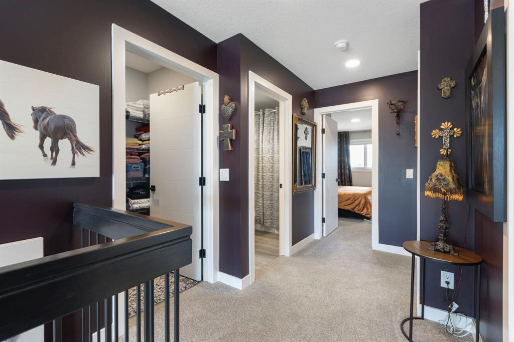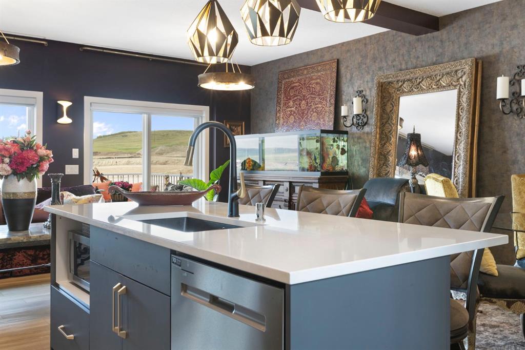 Welcome to this stunning semi-detached, 4-level split home located in the highly sought-after community of Heritage Hills in Cochrane. Offering 1,586 sq ft of developed living space, a walkout basement, and a double attached garage, this home blends dramatic architectural design with modern comfort — all framed by beautiful mountain views and unforgettable sunsets. From the moment you arrive, the impressive curb appeal sets the tone. Step inside to a spacious foyer with soaring ceilings that immediately create a sense of openness and light. The main level features an inviting open-concept layout anchored by a chef-inspired kitchen showcasing quartz countertops, high-end stainless steel appliances including a gas range, sleek modern cabinetry with elegant gold hardware, and designer Cartwright Lighting fixtures. The adjacent dining and living areas are equally impressive, highlighted by rich finishes, an electric fireplace, and oversized windows that flood the space with natural light. Patio doors lead to a 13-ft balcony complete with a gas line for your BBQ and a water hookup, making it the perfect spot to enjoy summer evenings and take in Cochrane’s stunning sunsets. Just a few steps up, the spacious bonus room provides an ideal space to relax, unwind, or enjoy family movie and game nights, with a gas line already in place for a future fireplace.