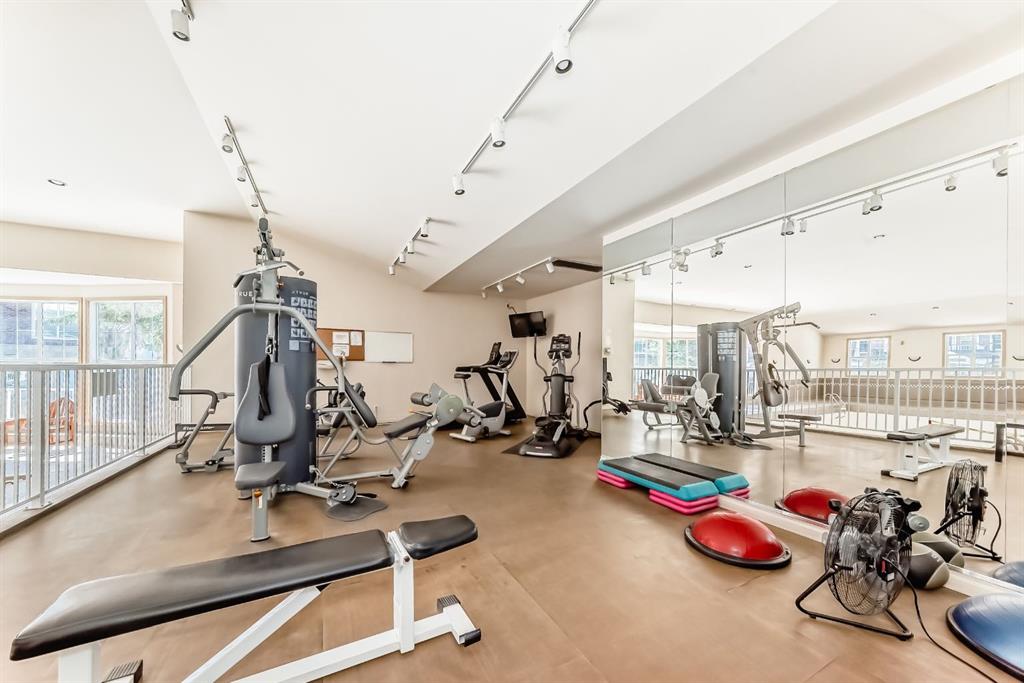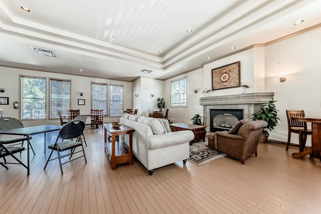 This very RARE 2 bedroom plus den 2 bath open concept condo offers 1600 sq ft of gracious living. When you enter this big sunny home with 9 ft ceilings, you will be greeted by a large kitchen with a pantry, lots of cabinet space and a long peninsula which could seat 4 or 5 guests. It opens to the spacious Living/Dining rooms which feature a two sided gas fireplace. Two doors lead to two (appox. 70 sf each) separate South facing balconies which overlook a green space. The park with a variety of mature trees makes you feel that you are in the country not in the heart of vibrant walkable Garrisonwoods with all of its services, restaurants and shopping. Each of the 2 bedrooms have 4 piece en-suite. Both have large linen closets, double sinks and one has a big corner soaker tub – the other a FIAT steam shower. A cozy den/office shares the fireplace. A built in office cubby is conveniently located near the front hall and a large laundry room with even more storage space and A/C completes this unit. The two side by side parking spaces are beside the elevator as is the storage cage. The parkade is secure, heated and has a car wash and bike rack. You can walk to the entrance to the amazing amenities centre through the parkade or just pop out the front door. in the amenities centre, you will find a gym, showers, party/games room with a full kitchen and a great pool (just refurbished so will be refilled soon). Two guest suites can be rented at a reasonable price and visitor parking is out front. This is sought after quiet, well run and maintained adult (18+), pet friendly (dog or cat max. 20 pounds with approval) complex.