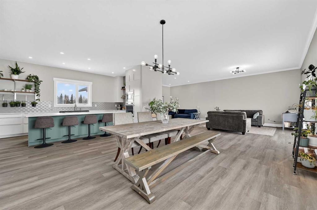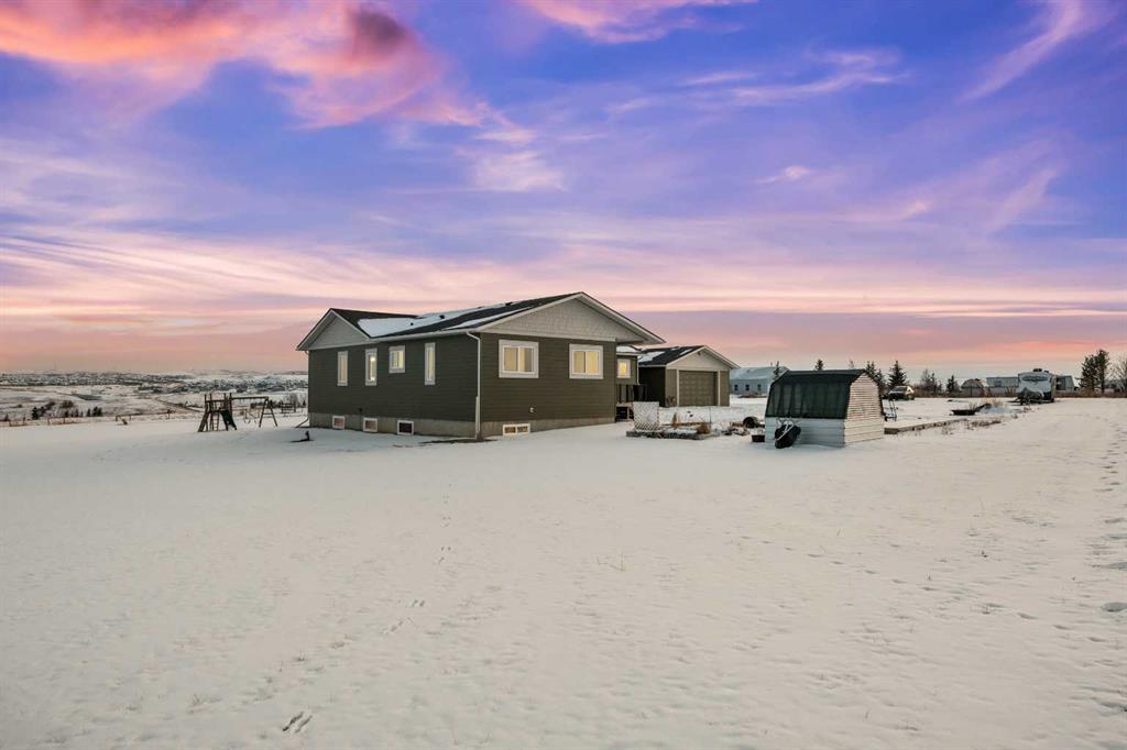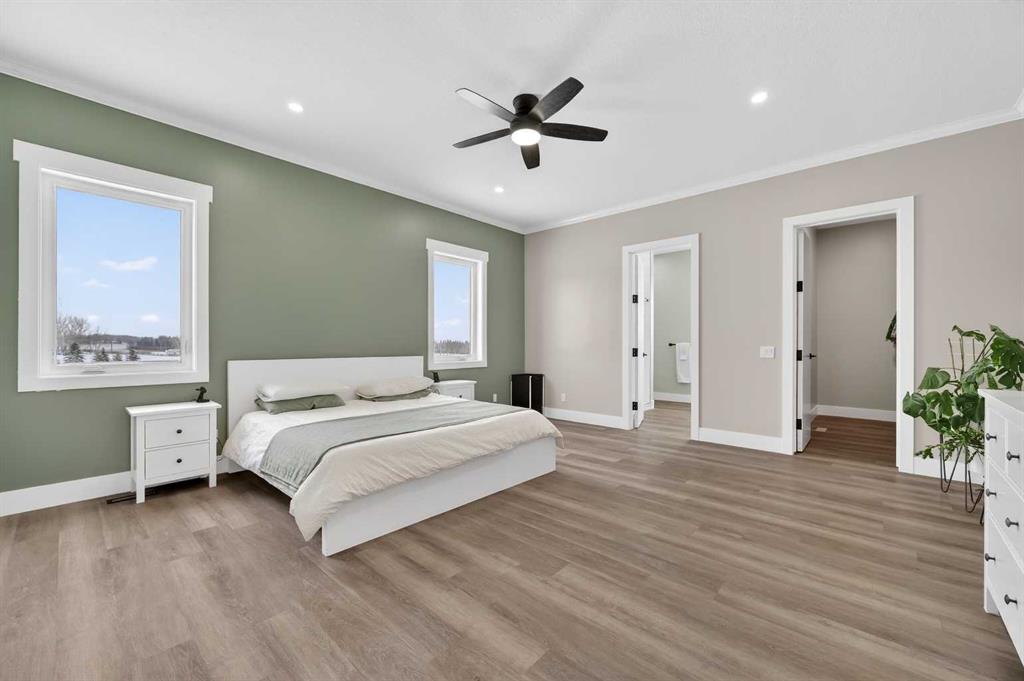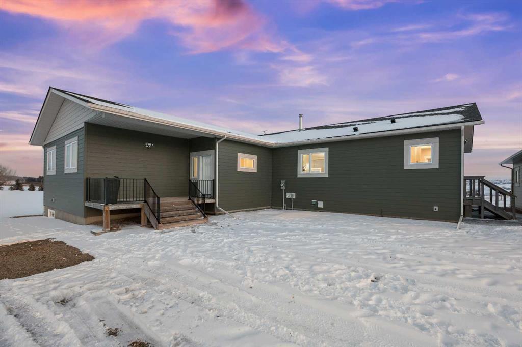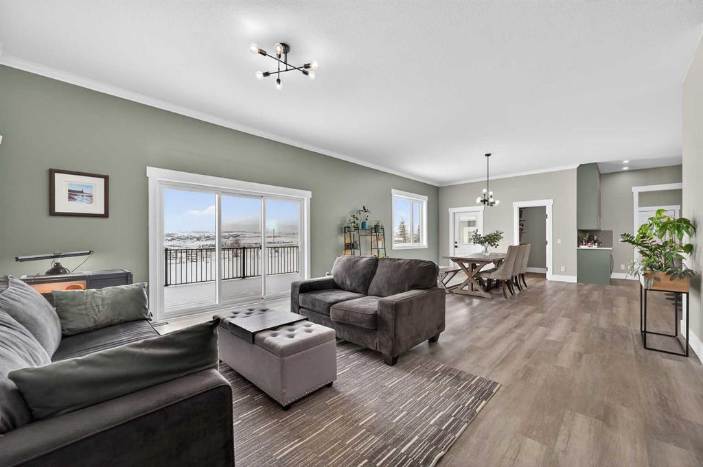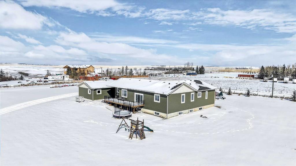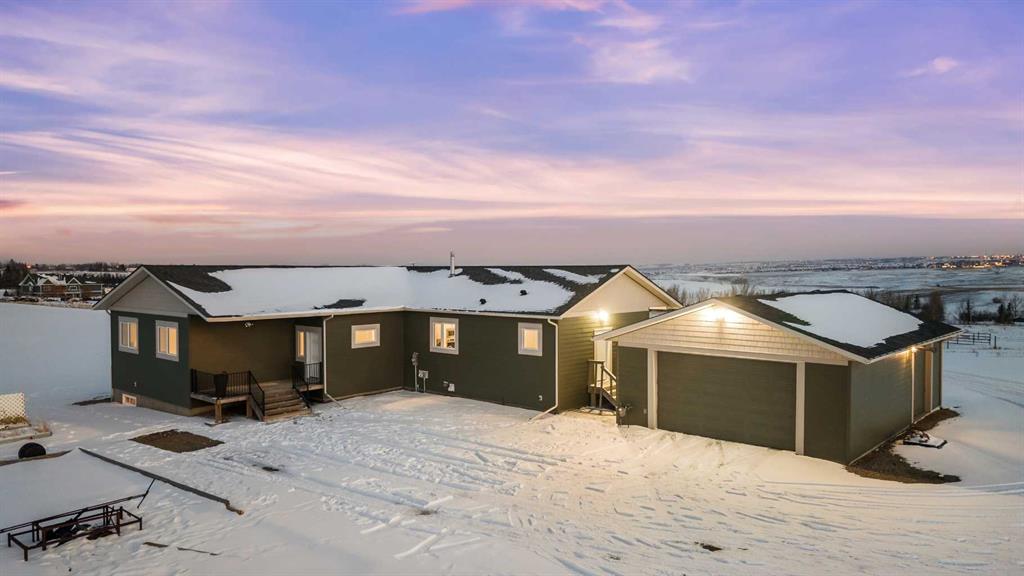 Experience modern luxury acreage living with breathtaking city views, refined design, and extensive upgrades, all set on 5+/- acres just minutes to Calgary, Airdrie, CrossIron Mills, and the airport. Offering 2623 sqft on the main floor, 3 beds, 3 baths, and a triple car garage with radiant heat, this property delivers the perfect blend of comfort, functionality, and elevated style. Step inside to a bright, welcoming entryway that opens into a thoughtfully designed layout featuring NEW vinyl plank flooring throughout and 10’ knockdown ceilings with crown molding across the main floor. Expansive NEW windows throughout the home capture incredible natural light while showcasing the surrounding landscape and distant city skyline. The chef-inspired kitchen is a true focal point, complete with quartz countertops throughout, SS appliances, a flush gas cooktop with downdraft ventilation, reverse osmosis, wall oven and microwave, under-mount farmhouse SS sink, and a spacious walk-in pantry. The impressive 8’ centre island with eating bar and additional storage is ideal for both everyday living and entertaining. A stylish coffee station/dry bar with beverage cooler, floating shelves, and extensive cabinetry further elevate the space. The open-concept living room is anchored by a stunning custom feature wall with built-in cabinetry, creating warmth and architectural interest. The generous dining area is flooded with sunlight from large south-facing windows and offers seamless access to the NEW deck, where panoramic views provide the perfect backdrop for relaxing evenings or hosting. The primary retreat is exceptionally spacious and designed for comfort, featuring a luxurious 4-piece ensuite with a fully tiled floor-to-ceiling walk-in shower, oversized quartz vanity with dual sinks, and modern finishes. Two additional bedrooms are both generously sized and include built-in closets. The 5-piece main bath offers a spa-like feel with a stand-alone tub, second fully tiled walk-in shower, and another oversized dual-sink quartz vanity. Function meets convenience with a laundry room and 1/2 bath located off the garage entry, along with a well-designed boot room featuring built-in cabinetry, drawers, coat hooks, and bench seating. The unfinished basement with 9’ ceilings provides incredible potential for future development, whether you envision additional living space, a home gym, or entertainment area. Extensive upgrades ensure peace of mind and efficiency, including NEW triple pane windows throughout the main floor, NEW basement windows, NEW Hardie board siding, NEW Class 4 shingles, and the complete absence of Poly B plumbing. The home is also a proud recipient of the Greener Homes Grant, adding further value and energy efficiency. Outside, the property is beautifully established and thoughtfully landscaped.This is a rare opportunity to own a turnkey acreage that offers space, style, and convenience—all in one exceptional location with stunning views and easy access to the city.