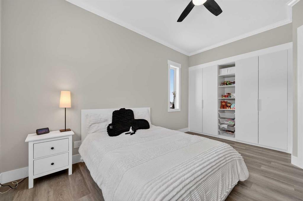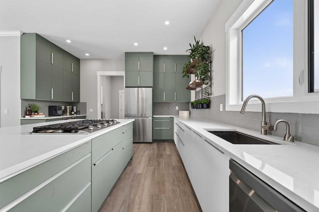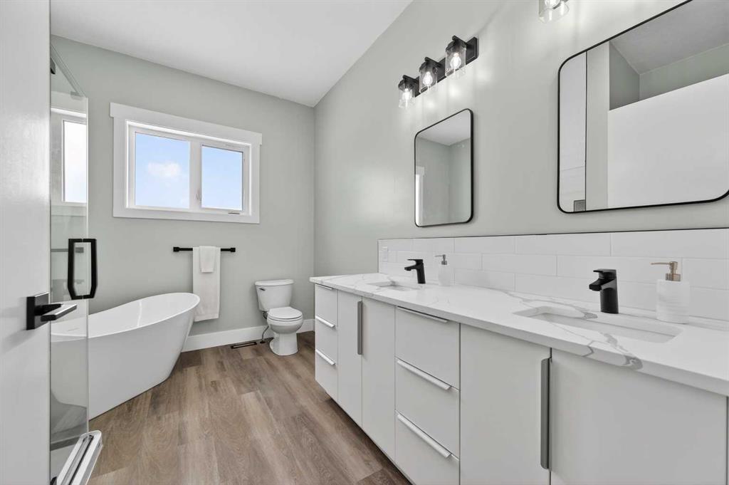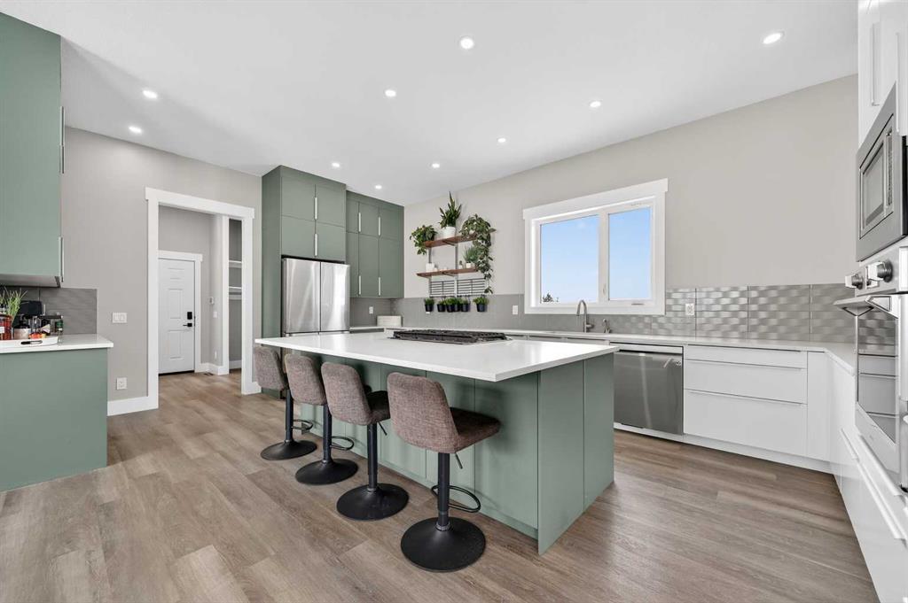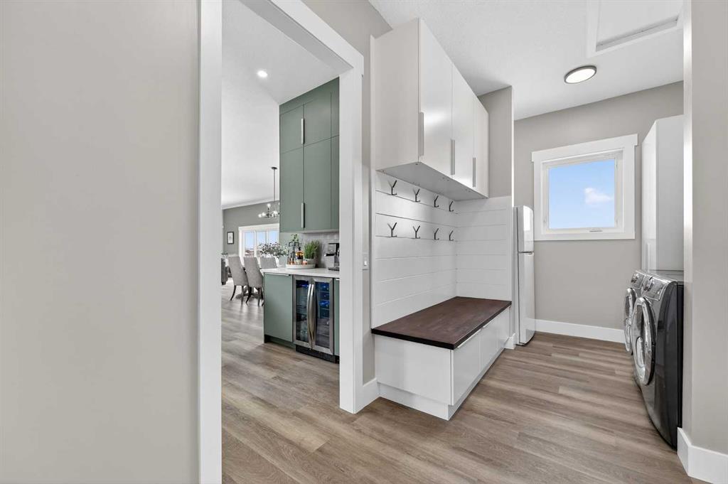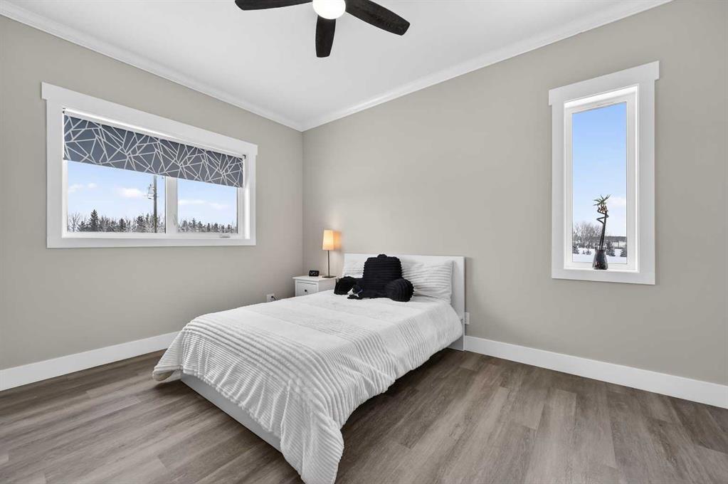 Experience modern luxury acreage living with breathtaking city views, refined design, and extensive upgrades, all set on 5+/- acres just minutes to Calgary, Airdrie, CrossIron Mills, and the airport. Offering 2623 sqft on the main floor, 3 beds, 3 baths, and a triple car garage with radiant heat, this property delivers the perfect blend of comfort, functionality, and elevated style. Step inside to a bright, welcoming entryway that opens into a thoughtfully designed layout featuring NEW vinyl plank flooring throughout and 10’ knockdown ceilings with crown molding across the main floor. Expansive NEW windows throughout the home capture incredible natural light while showcasing the surrounding landscape and distant city skyline. The chef-inspired kitchen is a true focal point, complete with quartz countertops throughout, SS appliances, a flush gas cooktop with downdraft ventilation, reverse osmosis, wall oven and microwave, under-mount farmhouse SS sink, and a spacious walk-in pantry. The impressive 8’ centre island with eating bar and additional storage is ideal for both everyday living and entertaining. A stylish coffee station/dry bar with beverage cooler, floating shelves, and extensive cabinetry further elevate the space. The open-concept living room is anchored by a stunning custom feature wall with built-in cabinetry, creating warmth and architectural interest. The generous dining area is flooded with sunlight from large south-facing windows and offers seamless access to the NEW deck, where panoramic views provide the perfect backdrop for relaxing evenings or hosting. The primary retreat is exceptionally spacious and designed for comfort, featuring a luxurious 4-piece ensuite with a fully tiled floor-to-ceiling walk-in shower, oversized quartz vanity with dual sinks, and modern finishes. Two additional bedrooms are both generously sized and include built-in closets. The 5-piece main bath offers a spa-like feel with a stand-alone tub, second fully tiled walk-in shower, and another oversized dual-sink quartz vanity. Function meets convenience with a laundry room and 1/2 bath located off the garage entry, along with a well-designed boot room featuring built-in cabinetry, drawers, coat hooks, and bench seating. The unfinished basement with 9’ ceilings provides incredible potential for future development, whether you envision additional living space, a home gym, or entertainment area. Extensive upgrades ensure peace of mind and efficiency, including NEW triple pane windows throughout the main floor, NEW basement windows, NEW Hardie board siding, NEW Class 4 shingles, and the complete absence of Poly B plumbing. The home is also a proud recipient of the Greener Homes Grant, adding further value and energy efficiency. Outside, the property is beautifully established and thoughtfully landscaped.This is a rare opportunity to own a turnkey acreage that offers space, style, and convenience—all in one exceptional location with stunning views and easy access to the city.