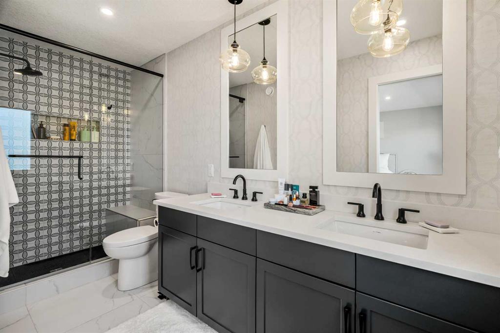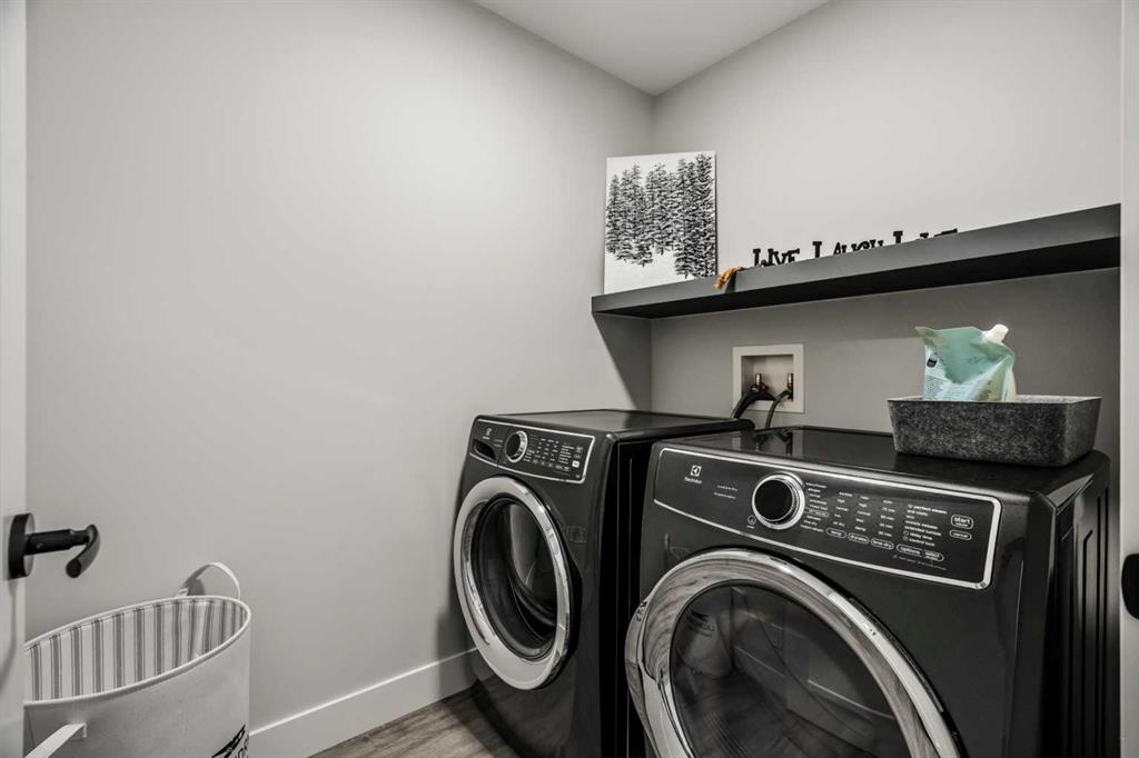 Upstairs, the home offers two generously sized bedrooms, including a comfortable primary retreat with walk-in closet and private ensuite featuring heated floors, creating a relaxing and spa-inspired atmosphere. A second full bathroom and upper-level laundry room provide added functionality and ease for daily living.