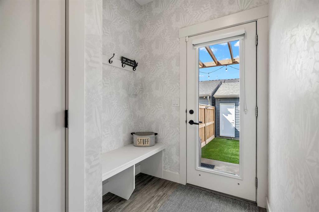 The main floor welcomes you with a bright open-concept layout enhanced by large windows and durable vinyl plank flooring throughout the primary living areas. The spacious living room features a cozy electric fireplace, creating a warm focal point for relaxing evenings or entertaining guests. The kitchen is both stylish and functional, showcasing quartz countertops, a gas stove, built-in oven, modern cabinetry, and ample counter space, ideal for everyday cooking and hosting. The adjoining dining area provides plenty of room for gatherings, while the practical mudroom adds organization and convenience.