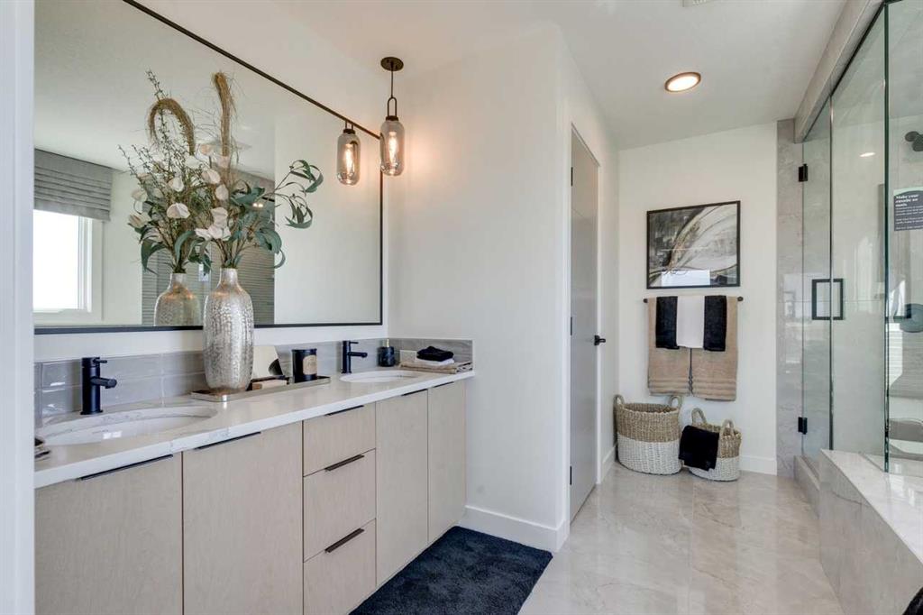 Welcome to The Amber – where luxury meets functionality in every detail. Built by a trusted builder with over 70 years of experience, this home showcases on-trend, designer-curated interior selections tailored for a home that feels personalized to you. Energy efficient and smart home features. This stunning home features a main floor bedroom and full bathroom, perfect for guests or extended family. The executive kitchen boasts built-in stainless steel appliances, gas cooktop, chimney hoodfan, and a showstopping waterfall island with pendant lighting. A separate spice kitchen offers a gas range, a french door, and ample pantry shelving. Soaring open-to-above ceilings in the great room highlight the floor-to-ceiling tiled electric fireplace and flood the space with natural light. Upstairs, retreat to the 5-piece ensuite with a soaker tub, tiled shower, and dual vanities with generous drawer space. With tile in upper bathrooms, LVP on the main floor, and windows throughout, The Amber blends elegance and comfort effortlessly. This energy-efficient home is Built Green certified and includes triple-pane windows, a high-efficiency furnace, and a solar chase for a solar-ready setup. With blower door testing, plus an electric car charger rough-in, it’s designed for sustainable, future-forward living. Featuring smart home technology, this home includes a programmable thermostat, ring camera doorbell, smart front door lock, smart and motion-activated switches—all seamlessly controlled via an Amazon Alexa touchscreen hub. Photos are representative.