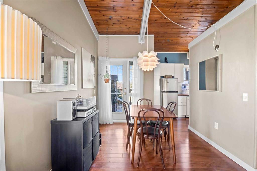 Tucked away in a quiet cul-de-sac in the established community of Braeside, this mid-century modern inspired bi-level duplex condo offers the perfect blend of style, comfort, and location. The main level is 534 sq ft and showcases beautiful natural wood vaulted ceilings, engineered hardwood floors, and an open, airy layout filled with natural light. The newly renovated kitchen features cutting board–style countertops, stainless steel appliances, and flows seamlessly into the spacious dining and living areas — highlighted by large windows and a striking metal egg-shaped wood-burning fireplace. Step out from the dining area to your private deck overlooking a peaceful park with mature trees and a playground — an ideal spot to relax or entertain. A tastefully updated 4-piece bathroom completes this level. The lower level is 460 sq ft and offers two bright bedrooms with large windows, a utility room with laundry, and ample storage space. Additional features include one assigned parking stall and plenty of visitor parking. Perfectly located close to Fish Creek Park, Glenmore Reservoir, Weaselhead Flats, schools, shopping, restaurants, medical facilities, and major roadways — offering easy access around the city or a quick getaway to the mountains. Don’t miss the opportunity to own this stylish, move-in ready home in the mature community of Braeside.