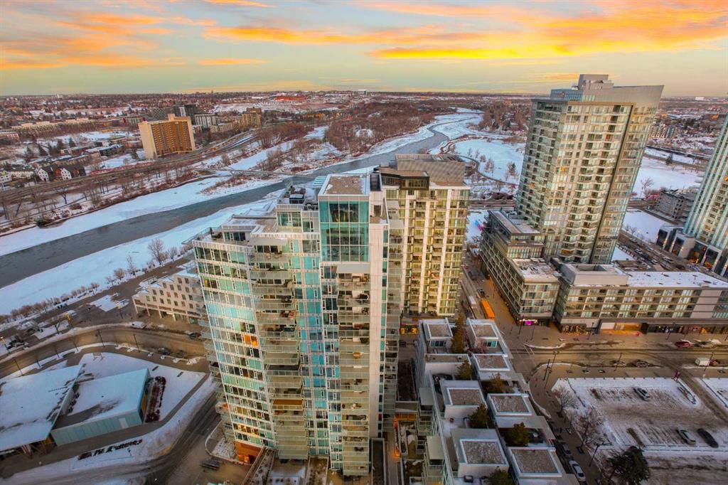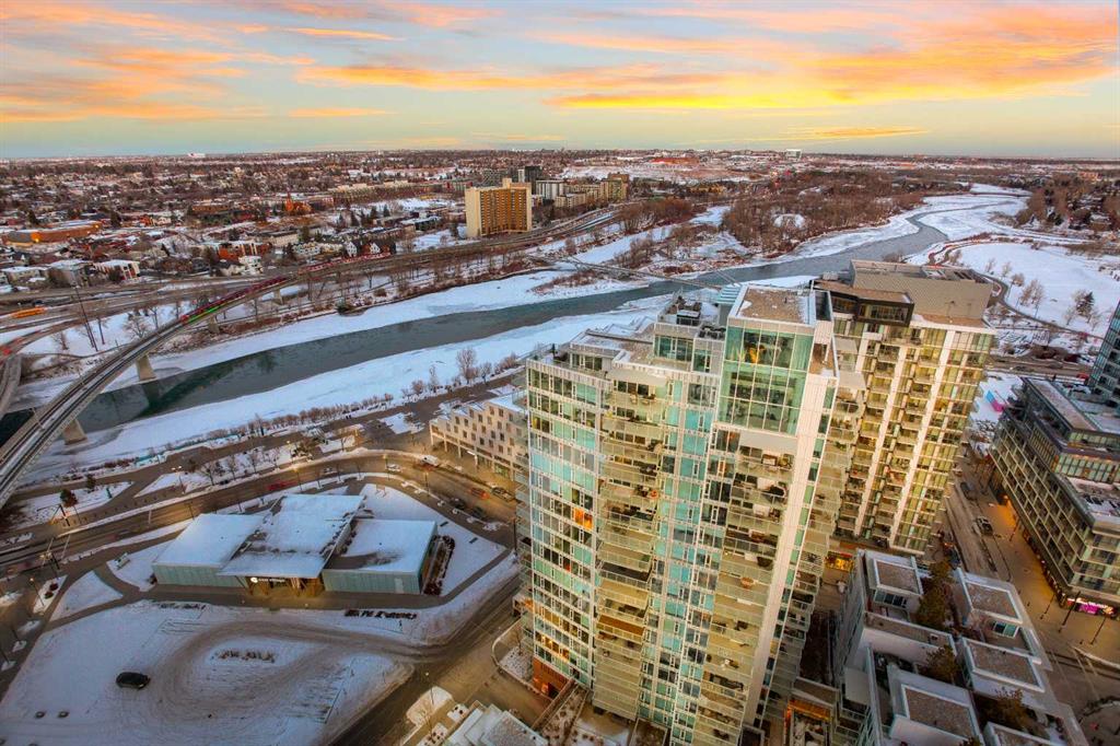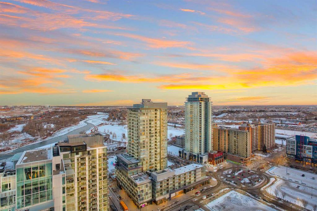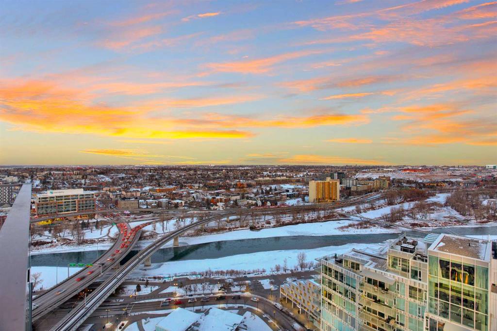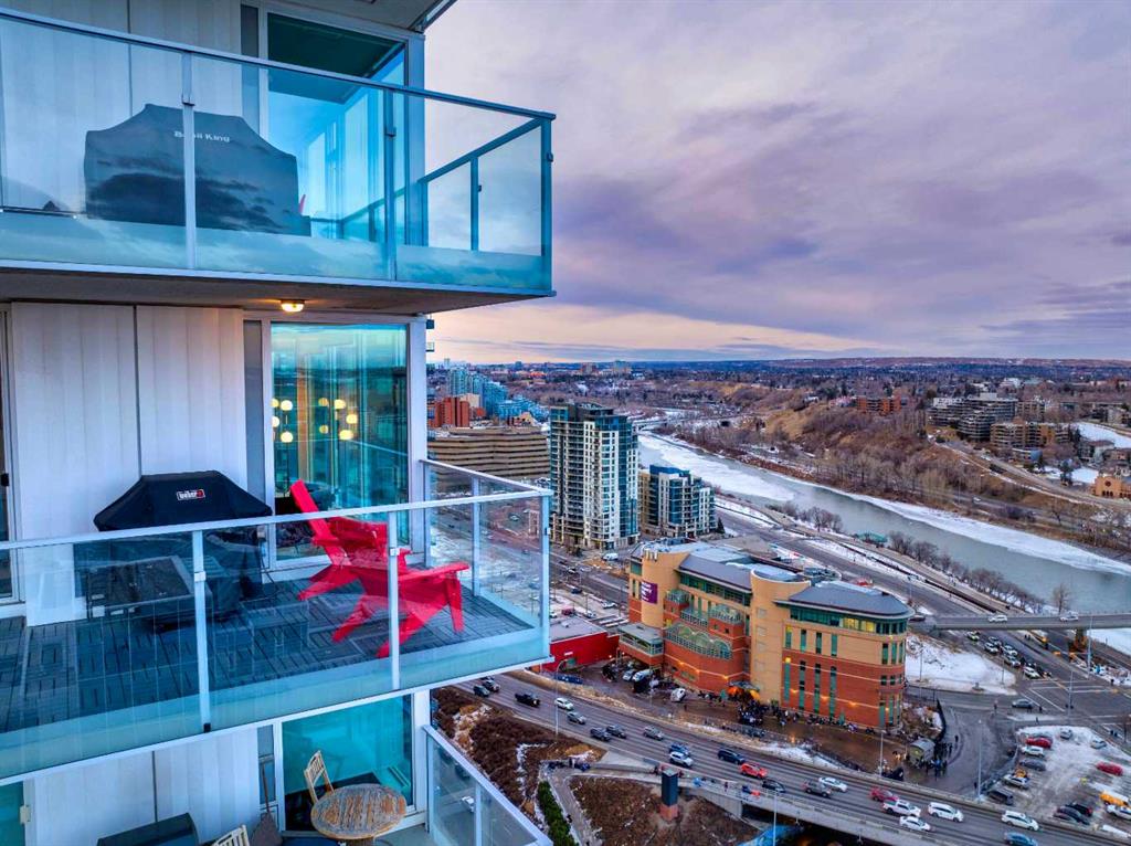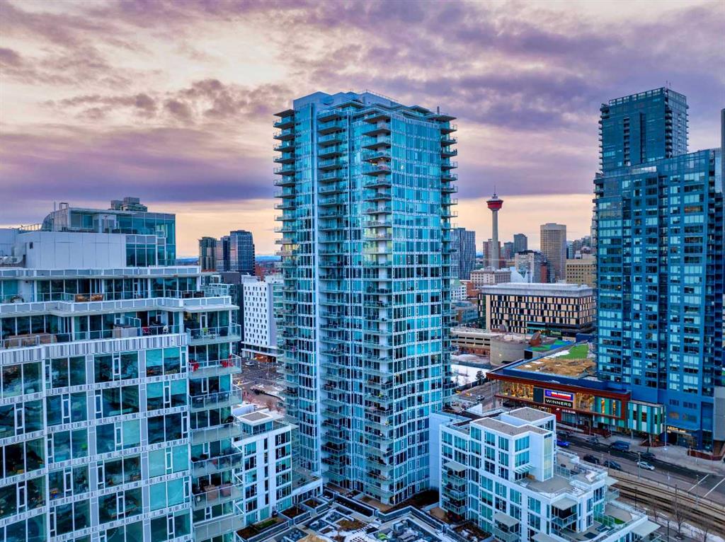 Open House, Sunday January 18, 12:00pm-2:00pm. Experience refined urban living with breathtaking panoramic views from this luxurious 27th-floor residence in the coveted Evolution tower, located in Calgary’s dynamic East Village. Offering over 1,100 sq. ft. of impeccably designed living space, this elegant home is bathed in natural light through floor-to-ceiling windows that frame sweeping city, river, and skyline views from the northwest to the southeast. The chef-inspired kitchen features granite countertops, premium stainless steel appliances, and a gas range, seamlessly flowing into the open living and dining areas—ideal for both everyday living and sophisticated entertaining. The primary retreat showcases stunning Bow River views, a walk-through closet, and a spa-like 5-piece ensuite. A spacious second bedroom, full bathroom, private office/den, ensuite laundry, and two titled parking stalls complete the residence. Residents enjoy an exceptional lifestyle with 24-hour concierge, fitness centre with sauna and steam room, and an exclusive rooftop patio with BBQ. Just steps from the RiverWalk, St. Patrick’s Island, Central Library, and the city’s finest cultural attractions, this is downtown luxury at its finest—where you drift off beneath the stars and awaken to the glow of the rising sun.