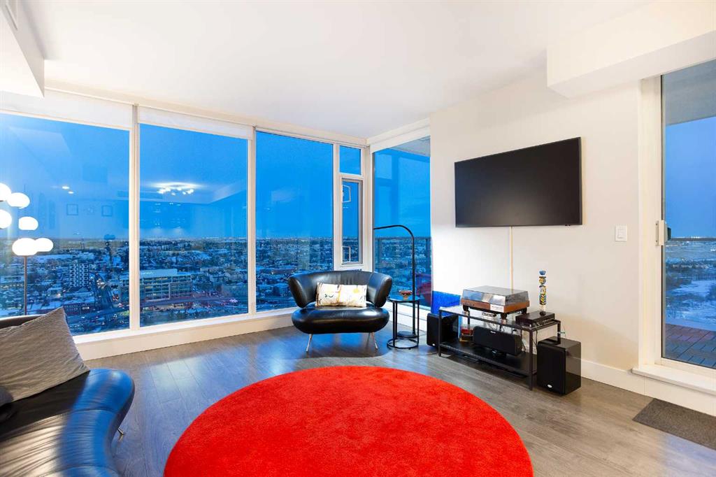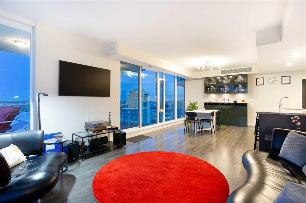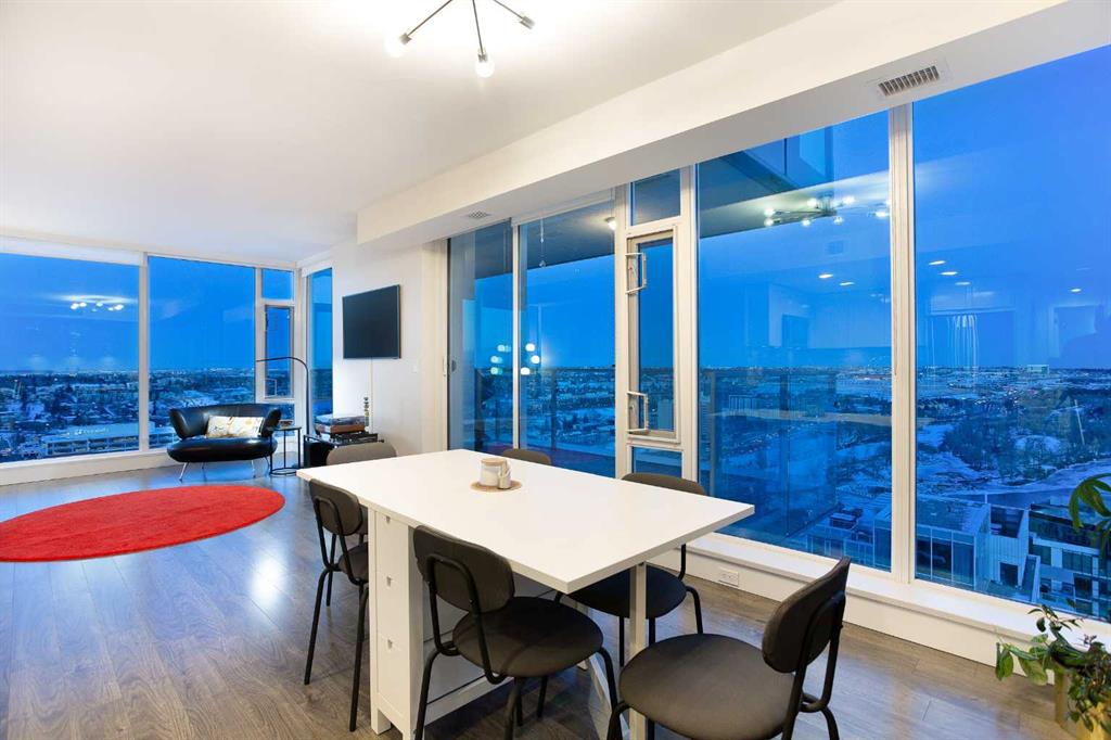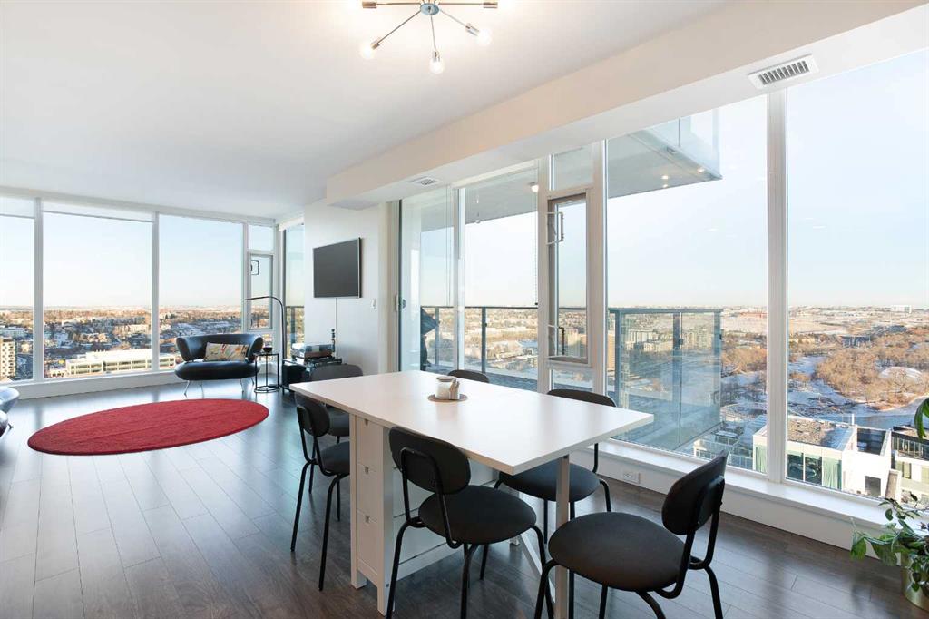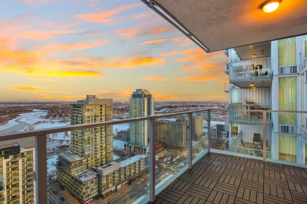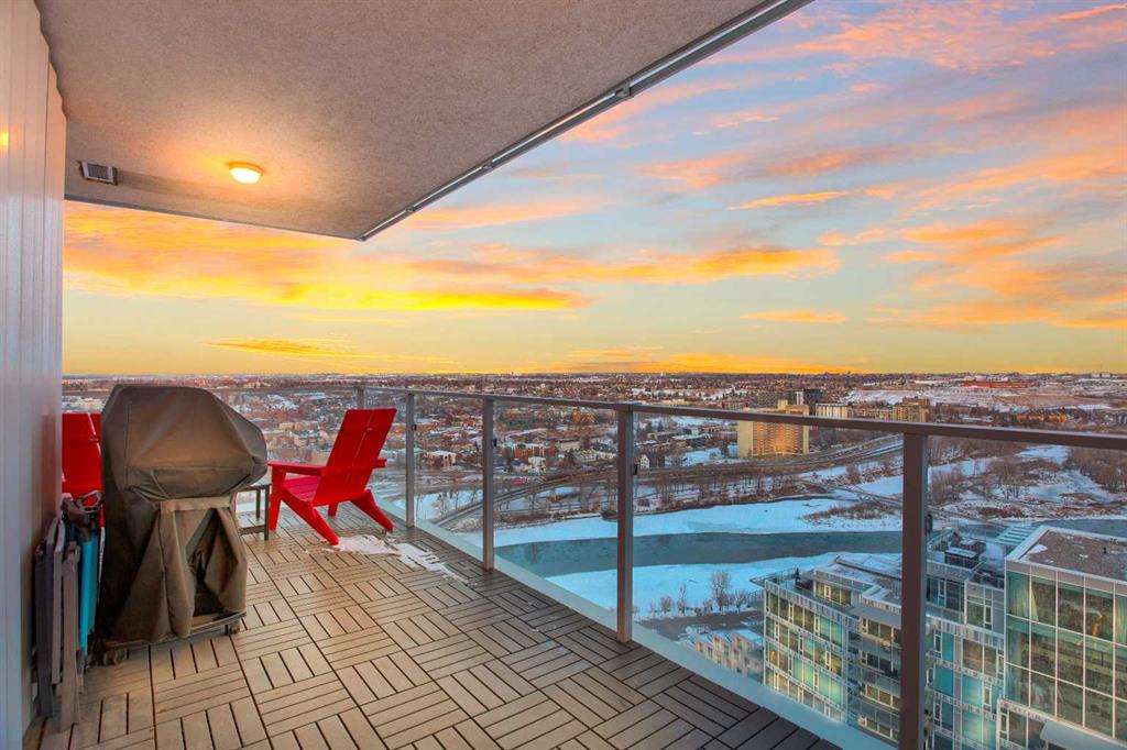 Open House, Sunday January 18, 12:00pm-2:00pm. Experience refined urban living with breathtaking panoramic views from this luxurious 27th-floor residence in the coveted Evolution tower, located in Calgary’s dynamic East Village. Offering over 1,100 sq. ft. of impeccably designed living space, this elegant home is bathed in natural light through floor-to-ceiling windows that frame sweeping city, river, and skyline views from the northwest to the southeast. The chef-inspired kitchen features granite countertops, premium stainless steel appliances, and a gas range, seamlessly flowing into the open living and dining areas—ideal for both everyday living and sophisticated entertaining. The primary retreat showcases stunning Bow River views, a walk-through closet, and a spa-like 5-piece ensuite. A spacious second bedroom, full bathroom, private office/den, ensuite laundry, and two titled parking stalls complete the residence. Residents enjoy an exceptional lifestyle with 24-hour concierge, fitness centre with sauna and steam room, and an exclusive rooftop patio with BBQ. Just steps from the RiverWalk, St. Patrick’s Island, Central Library, and the city’s finest cultural attractions, this is downtown luxury at its finest—where you drift off beneath the stars and awaken to the glow of the rising sun.
