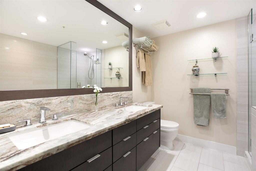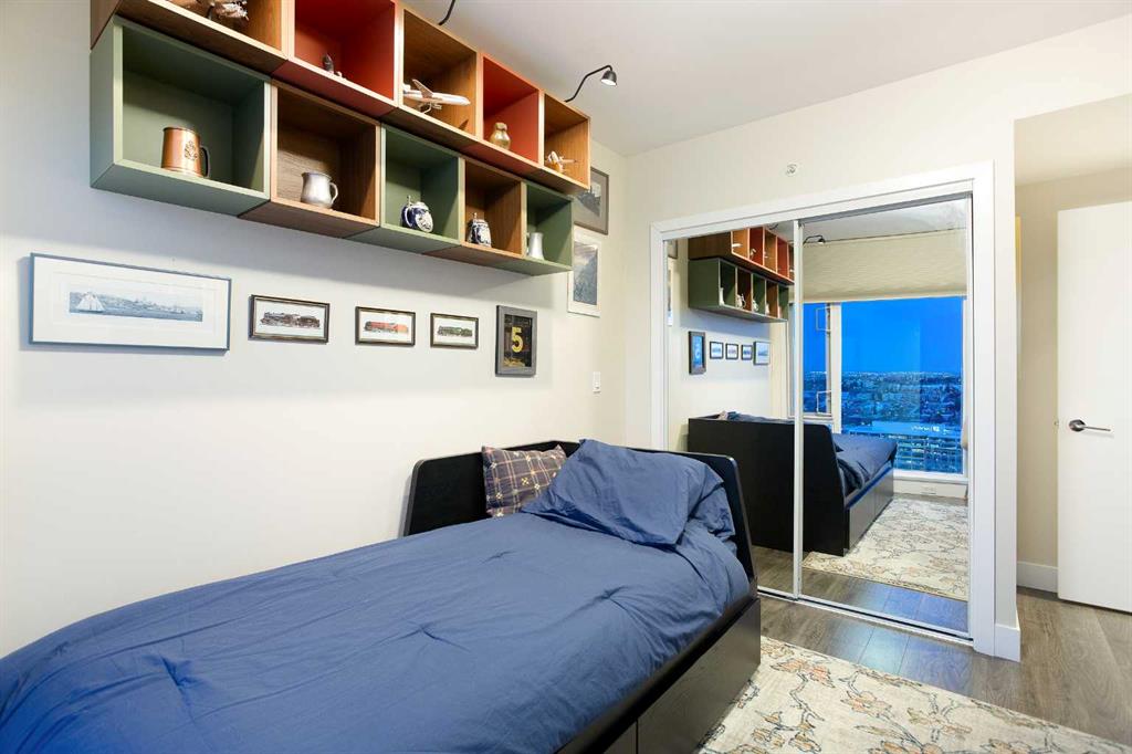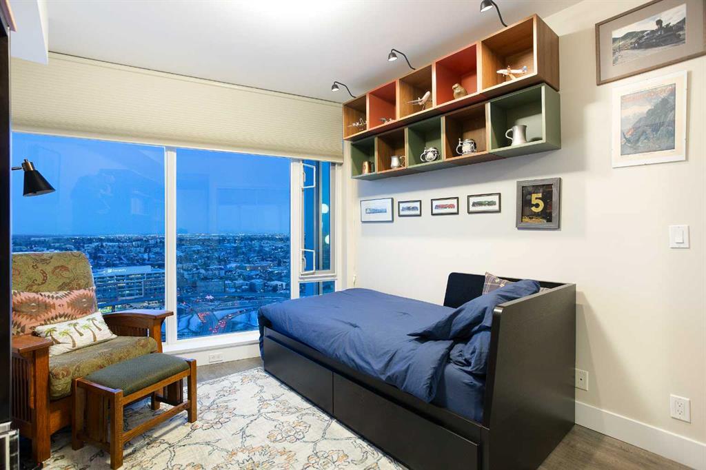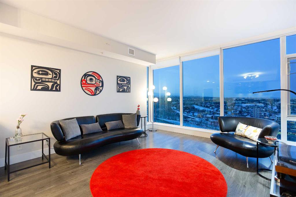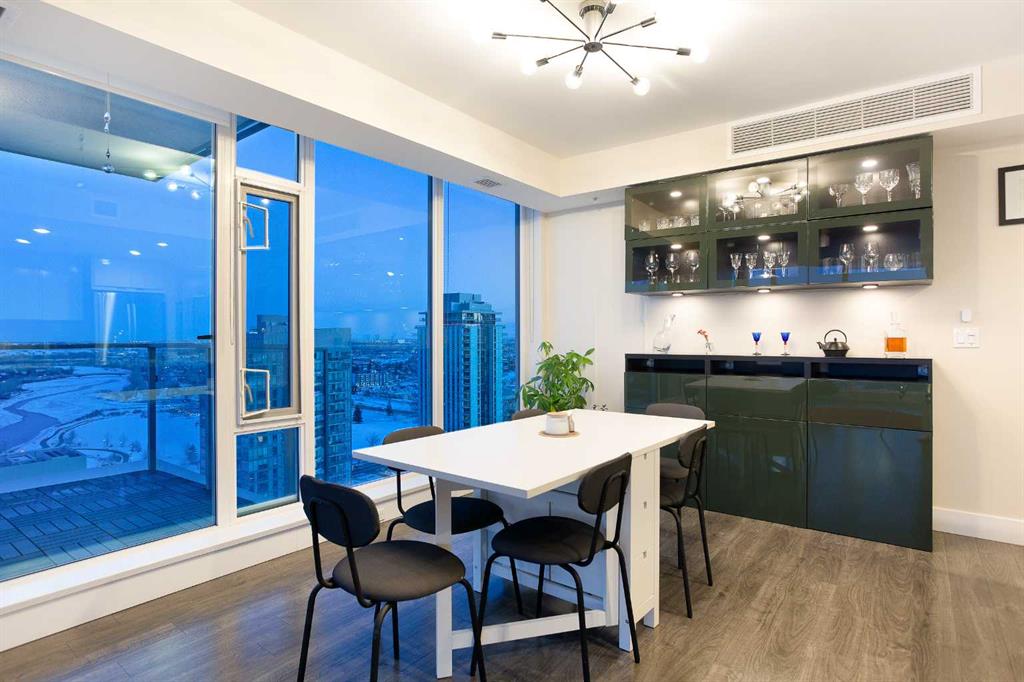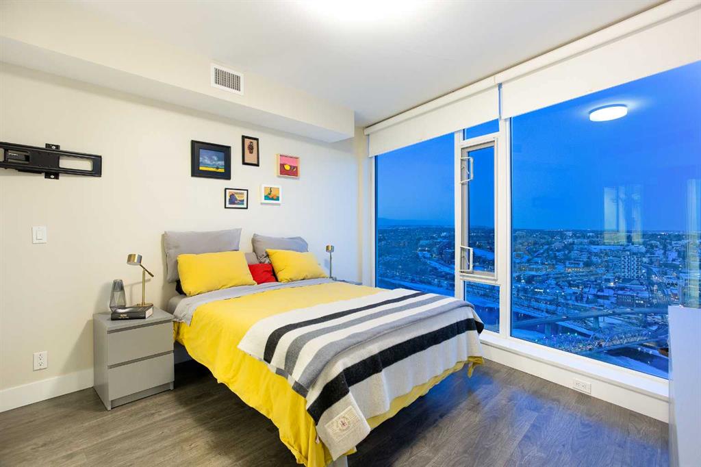 Open House, Sunday January 18, 12:00pm-2:00pm. Experience refined urban living with breathtaking panoramic views from this luxurious 27th-floor residence in the coveted Evolution tower, located in Calgary’s dynamic East Village. Offering over 1,100 sq. ft. of impeccably designed living space, this elegant home is bathed in natural light through floor-to-ceiling windows that frame sweeping city, river, and skyline views from the northwest to the southeast. The chef-inspired kitchen features granite countertops, premium stainless steel appliances, and a gas range, seamlessly flowing into the open living and dining areas—ideal for both everyday living and sophisticated entertaining. The primary retreat showcases stunning Bow River views, a walk-through closet, and a spa-like 5-piece ensuite. A spacious second bedroom, full bathroom, private office/den, ensuite laundry, and two titled parking stalls complete the residence. Residents enjoy an exceptional lifestyle with 24-hour concierge, fitness centre with sauna and steam room, and an exclusive rooftop patio with BBQ. Just steps from the RiverWalk, St. Patrick’s Island, Central Library, and the city’s finest cultural attractions, this is downtown luxury at its finest—where you drift off beneath the stars and awaken to the glow of the rising sun.