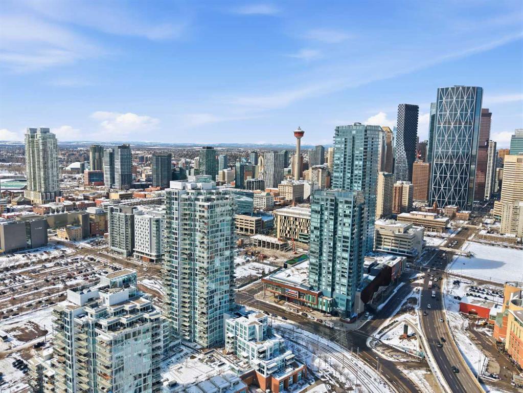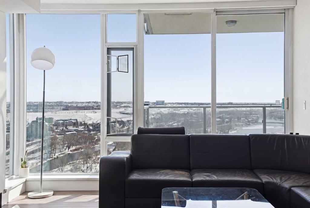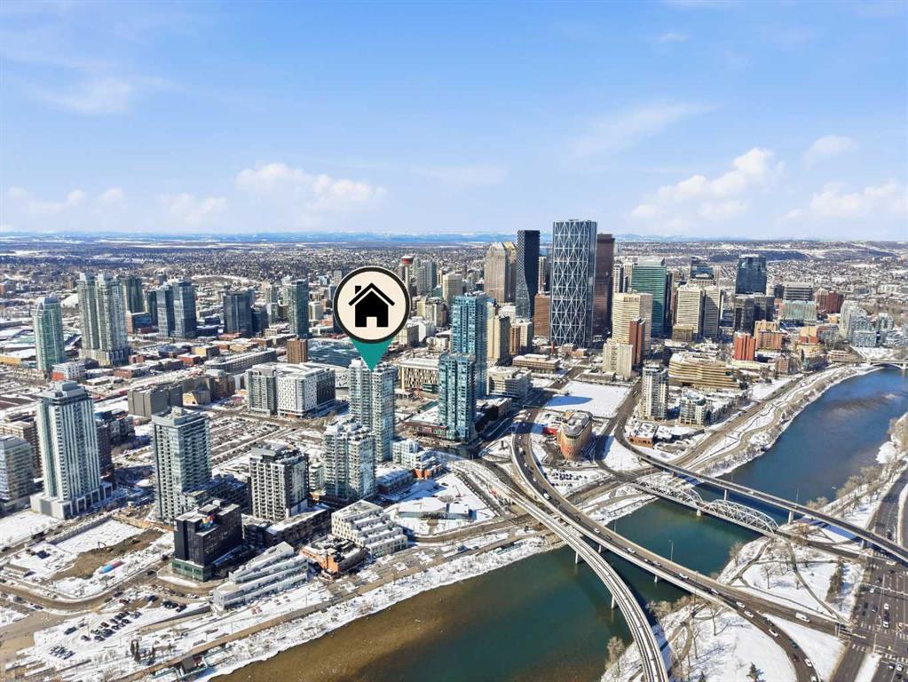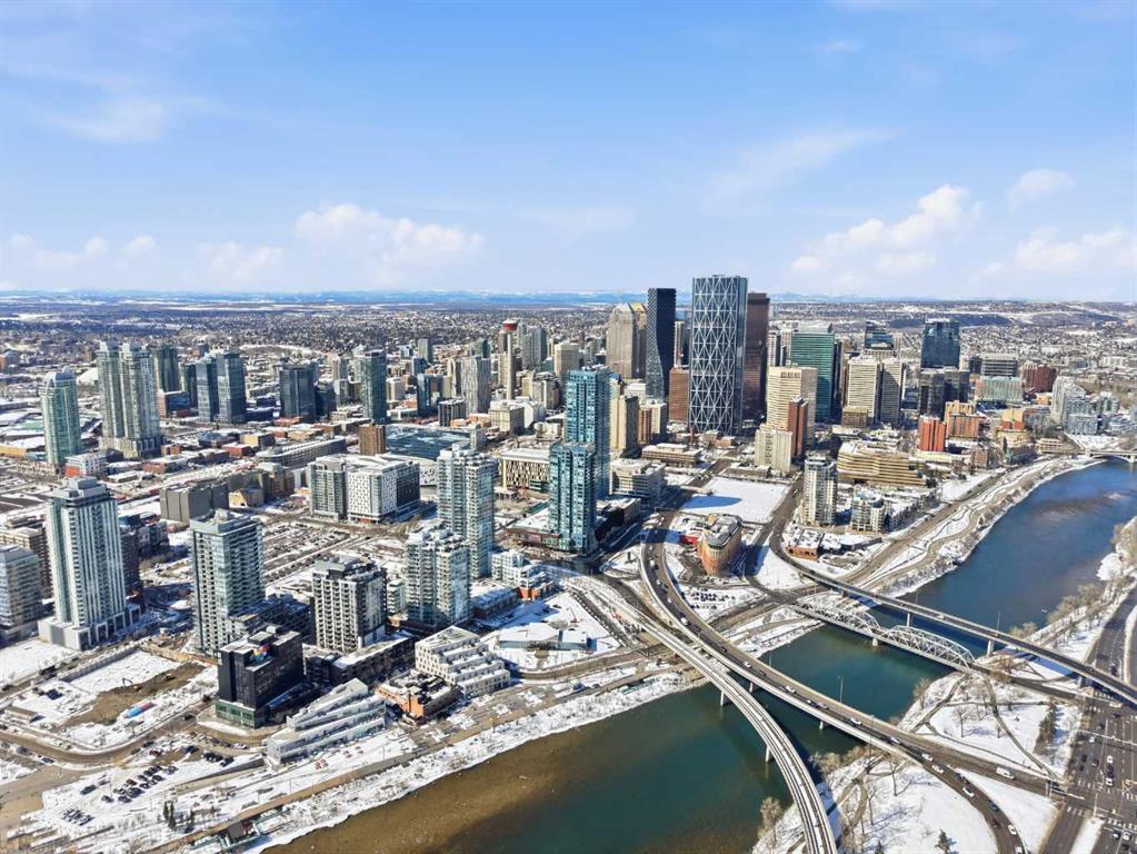 Exceptional and stunning three-view panorama from the 27th floor, showcasing the Mountain, Bow River, and Downtown skyline. This luxurious, generously proportioned two-bedroom, two-bath residence offers an open-concept 1,200+ SF of living space with floor-to-ceiling glass that reveals dramatic vistas throughout the day. The morning sun pours through the east-facing, air-conditioned suite, waking a generous living-dining space that flows into a gourmet kitchen—granite island and backsplash gleaming beside a pantry and top-tier stainless steel appliances, including a five-burner gas stove and under-cabinet lighting. A master retreat awaits with a walk-in closet and a five-piece ensuite warmed by in-floor heating, while a second bedroom offers in-floor heating and convenient laundry with a second bath. This is one of the tower’s largest units, with tandem underground parking for two and extra storage. Beyond the walls, the building invites: a gym, steam room, sauna, and a social lounge with a kitchen; a second-level terrace and rooftop garden for al fresco gatherings; 24-hour concierge and ample visitor parking. Step outside to riverfront strolls, parks, C-Train access, a library, Superstore, and a chef’s lineup of dining options. An expansive 140+ SF east-facing balcony frames panoramic views, redefining downtown luxury living at its finest.