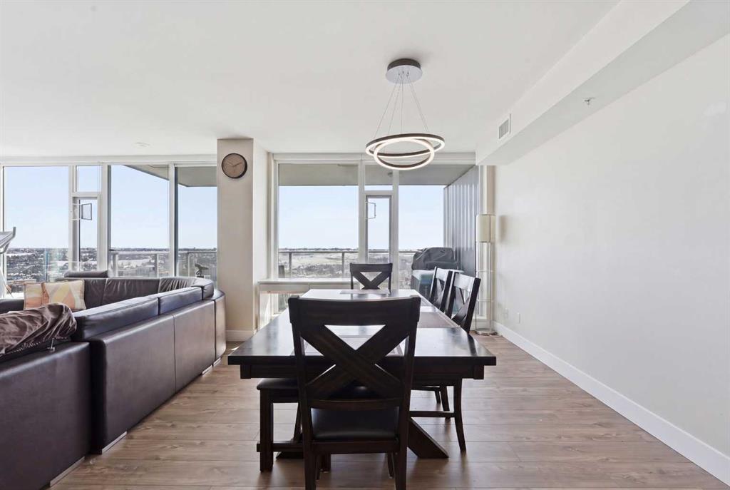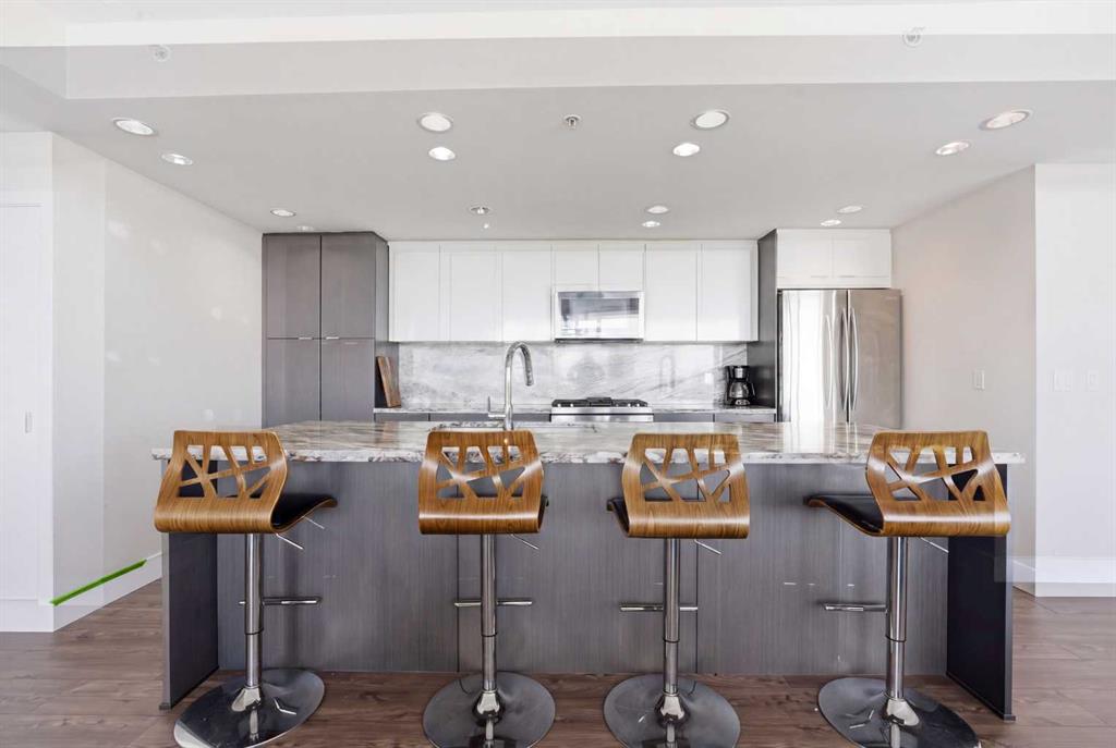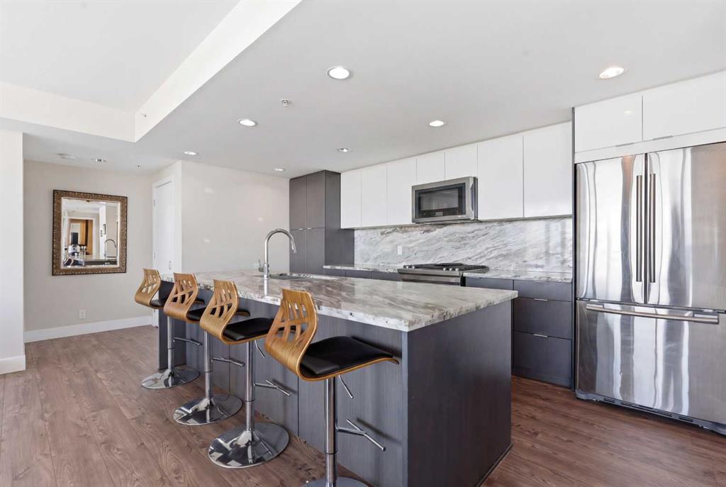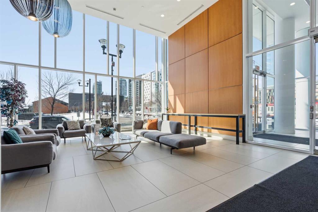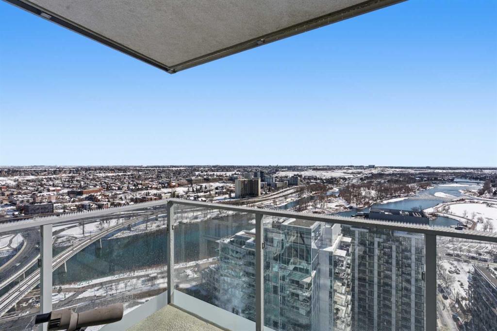 Exceptional and stunning three-view panorama from the 27th floor, showcasing the Mountain, Bow River, and Downtown skyline. This luxurious, generously proportioned two-bedroom, two-bath residence offers an open-concept 1,200+ SF of living space with floor-to-ceiling glass that reveals dramatic vistas throughout the day. The morning sun pours through the east-facing, air-conditioned suite, waking a generous living-dining space that flows into a gourmet kitchen—granite island and backsplash gleaming beside a pantry and top-tier stainless steel appliances, including a five-burner gas stove and under-cabinet lighting. A master retreat awaits with a walk-in closet and a five-piece ensuite warmed by in-floor heating, while a second bedroom offers in-floor heating and convenient laundry with a second bath. This is one of the tower’s largest units, with tandem underground parking for two and extra storage. Beyond the walls, the building invites: a gym, steam room, sauna, and a social lounge with a kitchen; a second-level terrace and rooftop garden for al fresco gatherings; 24-hour concierge and ample visitor parking. Step outside to riverfront strolls, parks, C-Train access, a library, Superstore, and a chef’s lineup of dining options. An expansive 140+ SF east-facing balcony frames panoramic views, redefining downtown luxury living at its finest.
