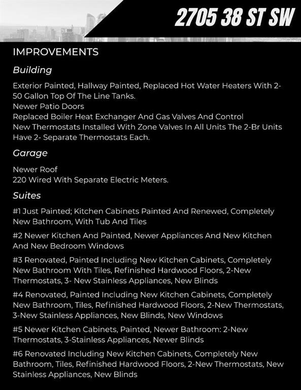 Ideal Multi-Family Investment Opportunity! Well maintained & updated 6 unit building conveniently located in Glenbrook. Comprised of 4 x 2 Bedroom and 2 x 1 Bedroom units, a maintenance room and laundry area. Located on a 77′ x 116′ corner lot providing ample tenant and/or visitor parking. There is a coin-a-matic laundry, adding to potential monthly revenue. All of the units have been updated or fully renovated. See photos for a list of improvements. There is a 6 space detached garage under separate title. Steps to parks, sports courts, schools and transit. Walking distance to restaurants, pharmacies and other amenities. Minutes to Mount Royal University, Westhills, all the amenities of 17th Ave W and the Downtown Core.