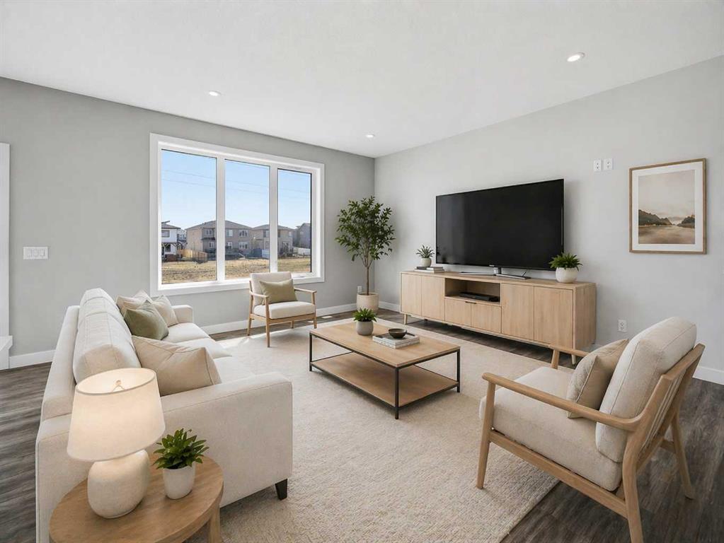 Welcome to this brand new duplex in the sought-after community of Dawson’s Landing in Chestermere, offering exceptional curb appeal and thoughtful design throughout. From the moment you arrive, you’ll appreciate the large attached double car garage and modern exterior finishes that set this home apart.