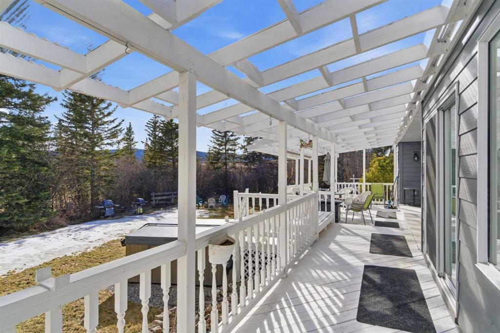 This beautiful Victorian style 1 & ½ storey home was built in 1989 and sits on 20 acres with trees & pasture land. It was updated in 2012 with interlocking metal roof (with transferable 50 year warranty) and Hardy board siding in 2022 on both the house and detached triple garage. The covered deck wraps around most of the house. The large fenced in yard (1 acre) is perfect for keeping young children and dogs close by. This fenced in yard includes a hot tub, pond, green house (c/w power & heat) & garden. The entrance features double French doors with a closet & ceramic tile flooring leading into the huge living room. This room boasts a vaulted ceiling, brick surround wood burning fireplace with mantle, a cozy alcove on the north side with 2 bay windows & picture windows & double doors leading to the deck on the south side. Off the living room is a bright inviting solarium with 4 skylights and a sliding glass door to the deck on the south side. On the west side of the house is an updated kitchen with cream cabinets, granite countertops, tile backsplash & a deep bay window over the double kitchen sink. There is a reverse osmosis system on the kitchen sink faucet. The appliances include a refrigerator, the oven & microwave are both built in, the dishwasher (new in 2025), the gas stove top with 4 burners & grill has a downdraft fan. Off the kitchen is a formal dining room with a bay window & built-in china cabinet. The laundry room presents upper cabinet storage, a pantry, laundry tub & washer and dryer (new in 2024). The spacious primary bedroom is on the main level with a linen closet & 5 piece ensuite. The ensuite has a double sink vanity with granite countertops, a free standing claw foot tub, large steam shower, plus both a storage & walk-in closet. The main level boasts stained Hickory hardwood floors, ceramic tile & Pergo laminate flooring. The upper level has 2 extensive bedroom with large closets c/w organizers. The bonus area has built-in shelving. A 3 piece bathroom completes this level. The flooring in natural stained Hickory hardwood & ceramic tile. The basement is insulated & drywalled. It is partially finished with a huge rec room area with built-in storage, dry bar & storage room. The workshop & utility rooms both include built-in shelving. The furnace & hot water tank were new Oct ’25. The 32’ x 24’ 3 car detached garage is insulated & drywalled. The double garage door has a remote opener. The 40’ x 30’ barn is insulated & plywood paneled with tack room, 3 full sized stalls, storage & utility room (c/w hot water tank & heater). The barn is on it’s own well. The panels & water troughs are included. Only 15 minutes from Cochrane on paved roads. A beautiful & serene property to call home.