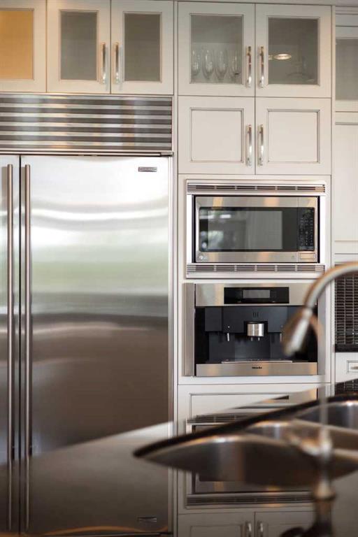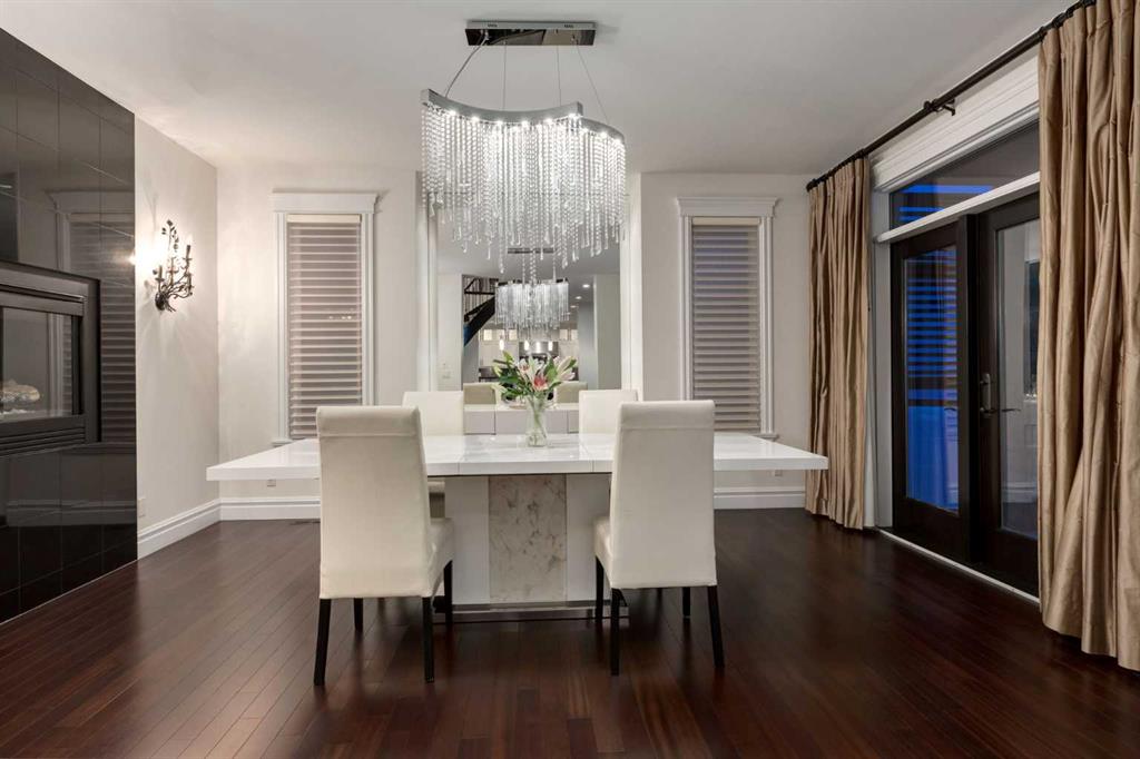 Balanced with natural light, this beautifully crafted family home captures breathtaking West-facing views of the Rocky Mountains, set against a serene, tree-lined backdrop. A timeless custom maple front door creates a warm first impression, complemented by natural stone detailing. Thoughtfully designed with custom-built cabinetry throughout, the home blends elegance with everyday functionality. Inside, a vaulted sitting room immediately draws the eye. Expansive windows frame the views while a sleek floor-to-ceiling fireplace adds contemporary architectural presence. Just off the foyer, a private executive office with French doors and coffered ceilings connects seamlessly to the formal dining room through a double-sided fireplace. The kitchen features Sub-Zero, Wolf, and Miele appliances and flows into a bright breakfast nook that opens onto the west-facing deck—ideal for alfresco dining. Overlooking the private, treed backyard, the pergola-covered deck includes stairs leading to the spacious yard below. A generous walk-through pantry connects to a fully equipped mudroom with extensive storage, a sink, and access to the triple garage. The grand curved wood staircase leads upstairs to three spacious bedrooms and a large flex room. The primary suite offers a private terrace with sweeping Rocky views, his & her custom closets, and an expansive ensuite with heated floors, his & her vanities, and a dedicated vanity area. Above the garage, the inviting flex room features its own fireplace and ample space for media & games. Two additional bedrooms share a 5-piece Jack-and-Jill bathroom with a double vanity, ideal for siblings. A well-appointed laundry room with built-in cabinetry, a sink, and hanging space completes the upper level. The fully developed walkout basement features travertine flooring and radiant in-floor heating throughout. A double-sided fireplace connects the interior family room to the covered exterior deck. This level is designed for versatility, offering a theatre room, bright home gym, additional bedroom, and a 4-piece bath with a steam shower. With a wet bar and private backyard access from two points, the lower-level functions beautifully as a retreat for growing or multigenerational families. Ideally located near Calgary’s top private and public schools—including Rundle College, Webber Academy, and Ernest Manning High School—this home also offers quick access to Westside Rec Centre, Aspen Landing Shopping Centre, and Highway 1 for easy escapes to Banff.