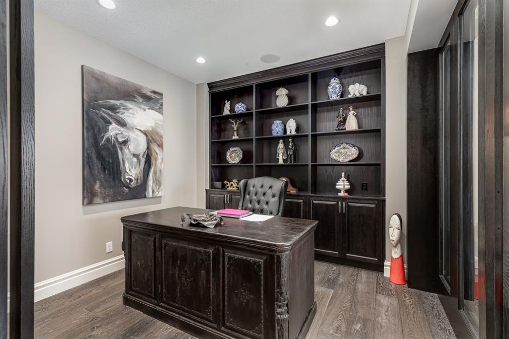 Soaring 9-ft ceilings and engineered hardwood floors create an open, airy feel. The chef-inspired kitchen boasts Ogee bevelled granite countertops, full-height two-tone cabinetry, a walk-through pantry with window, and a premium appliance package with gas cooktop, built-in oven, French-door fridge, and chimney hood fan. The adjoining dining area flows seamlessly into the sun-filled living room, anchored by custom millwork and an upgraded electric fireplace with heat blower. Additional upgrades include 8-ft doors, Heritage casings, knock-down ceilings, premium hardware, and a private den with custom glass barn doors—ideal for a home office or flex room.