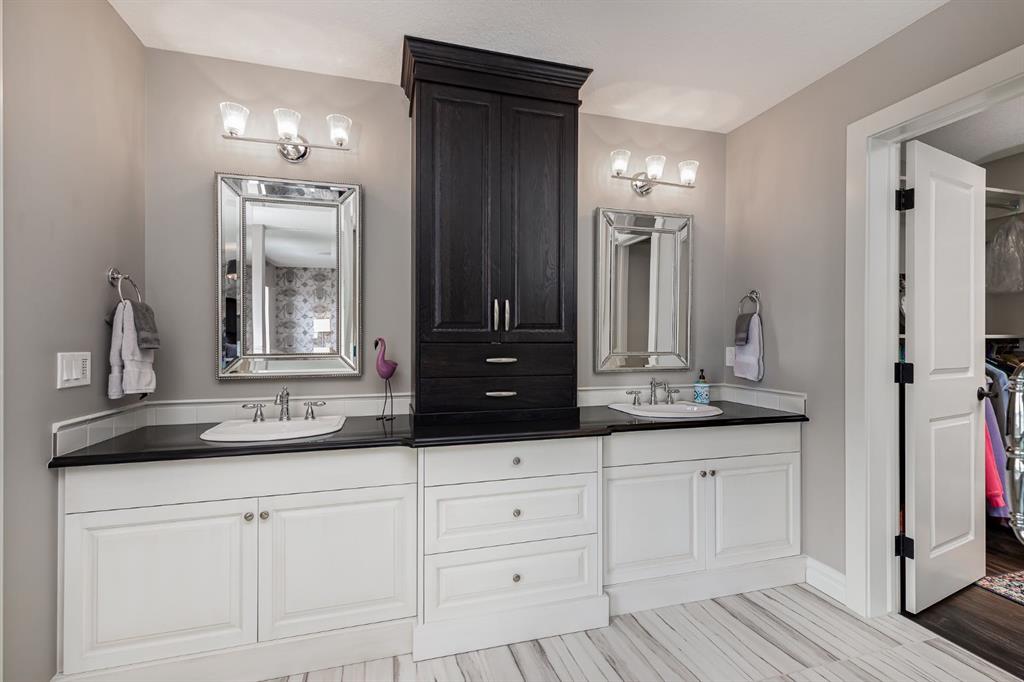 The west-facing vaulted bonus room impresses with added depth, ceiling height, and natural light—perfect for family movie nights or entertaining. The elegant primary suite features a large walk-in closet and a spa-inspired 5-piece ensuite with Kohler fixtures, dual sinks, deep soaker tub, fully tiled shower, and heated tile flooring with a dedicated control unit. Two additional bedrooms, a full bathroom, and an upper laundry room with added cabinetry complete the upper floor.
