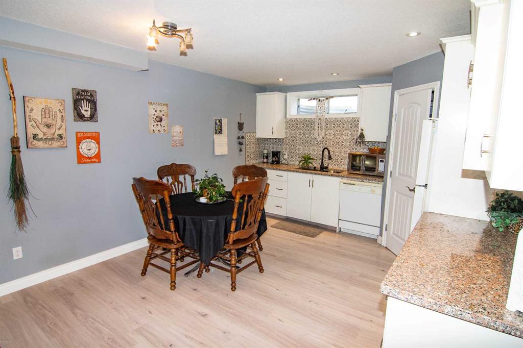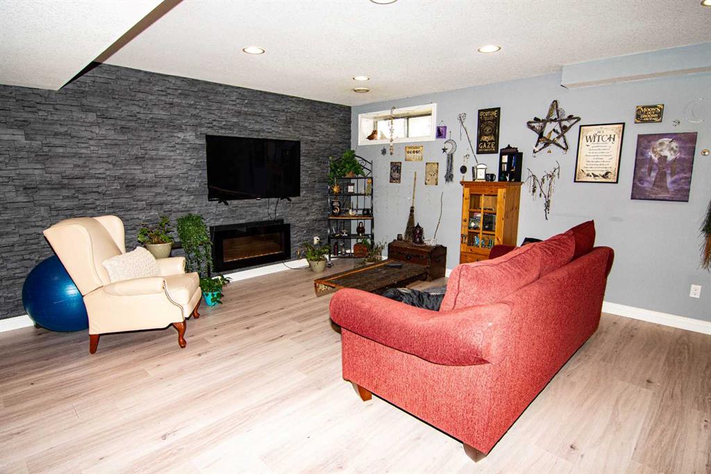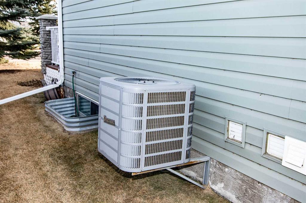 Sunny West-Facing Bungalow in Desirable “Greens at Woodside”! Air Conditioned! Open plan concept with vaulted ceilings! Upgraded kitchen with “Black Stainless Steel” appliances, Quartz Counters, white cabinetry with grey lower cabinets! The master suite is spacious and bright, with easy access to the main 4 piece bathroom. The second bedroom also is adjacent to bathroom and main level laundry. The basement has all permits for the development. It has a kitchen, feature wall with fireplace, heated floors in the bathroom, separate laundry. Double attached garage and rear deck with sunny west exposure. Bareland condo.