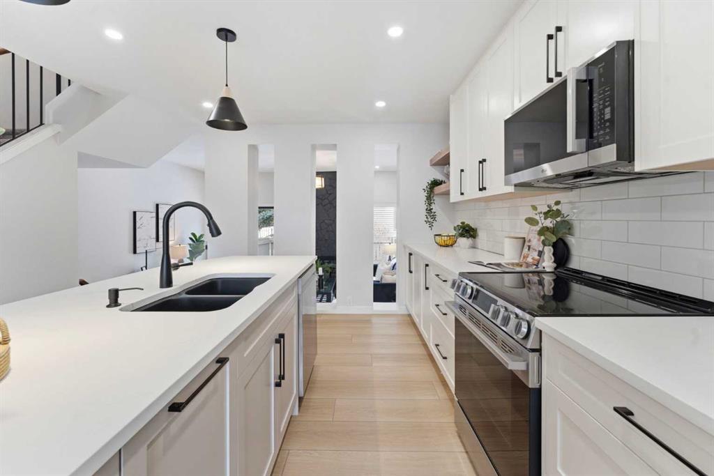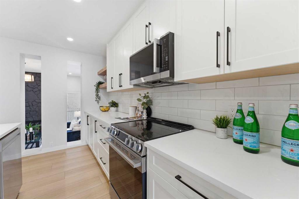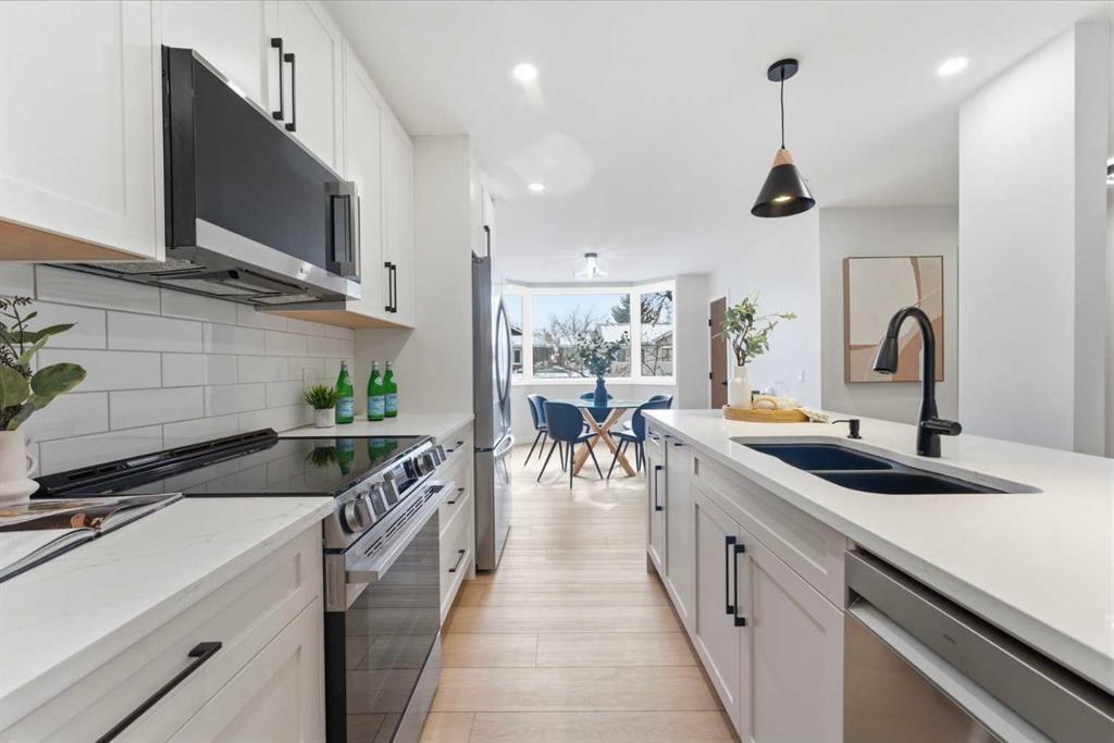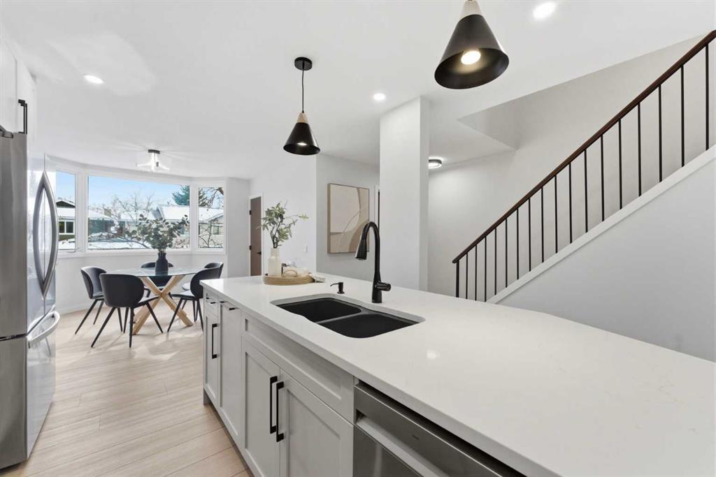 Infill luxury in a modern townhouse! Fully renovated and reimagined, this home stands out the moment you walk in. The main living space is elevated with vaulted ceilings, oversized windows, and a bold floor-to-ceiling stone fireplace that anchors the entire room. The expansive kitchen is bright, open and completely different from every other unit in this complex. It also has a full size island, a perfect gathering spot for guests & entertaining. The kitchen design features a modern look with two-toned organic colouring cabinetry, quartz countertops, new stainless steel appliances, tons of storage, and coffee nook with floating accent shelves. Flowing effortlessly into the dining area, it’s gives enough space for a 6-8 person table and is surrounded by windows and natural light. Upstairs offers 3 well-sized bedrooms, including a spacious master bedroom and large walk in closet with custom built-ins. The laundry has also been moved from the basement to the second level for added convenience. The bathrooms have also been updated with modern vanities, tiled bathtub, and custom cabinetry. The basement provides extra space for you to use your imagination with, workout space, rec room, lots of potential! The backyard is fully fenced, private, and usable. It’s the kind of space you’ll actually use: morning coffee, letting the dog out, and enjoying the summer evenings. An attached garage, quiet complex, and a location that puts you close to everything without feeling busy. Fully renovated, luxury townhouse living in this desirable lake community—this one hits different!