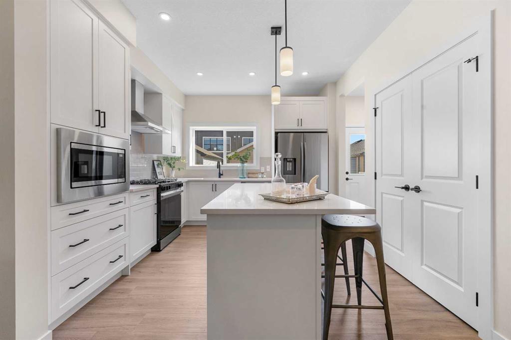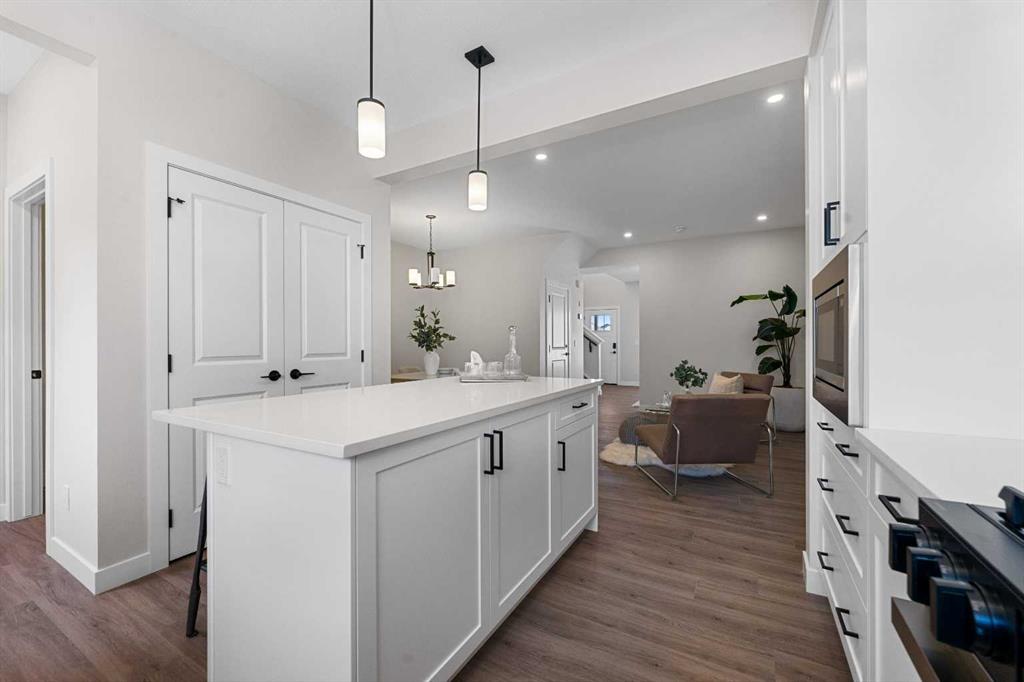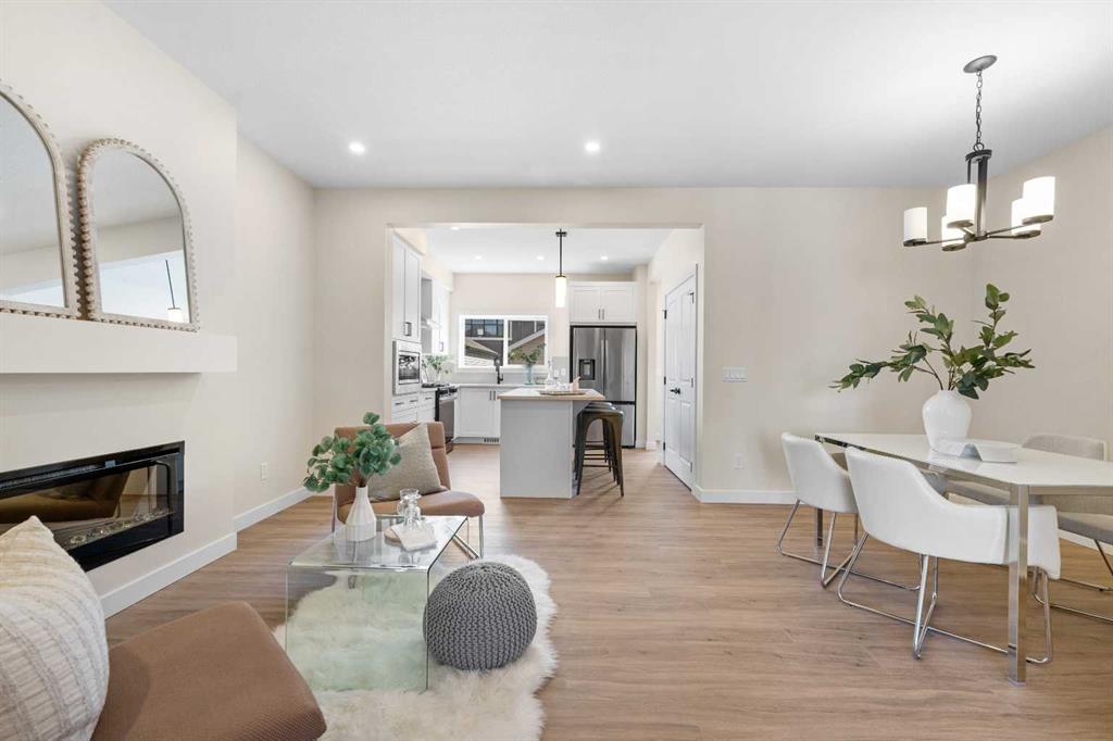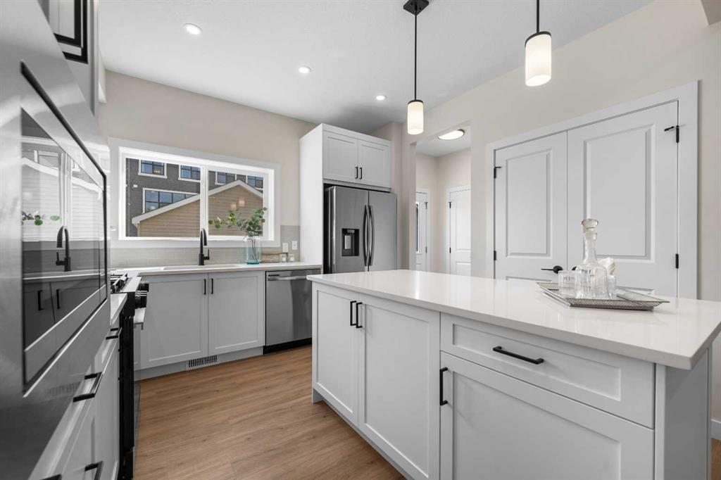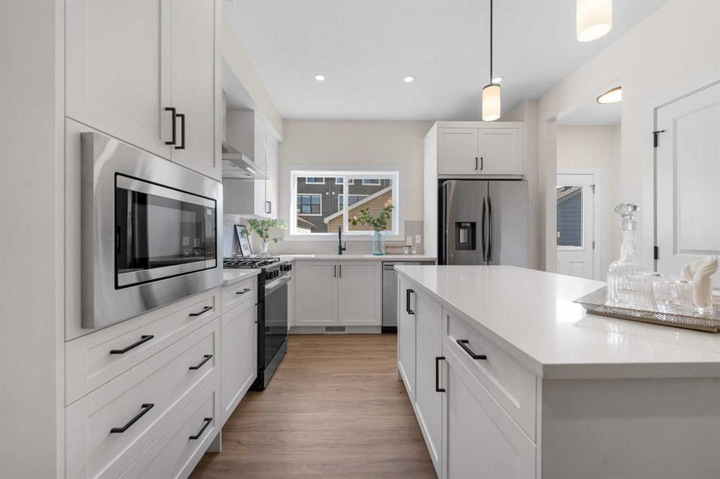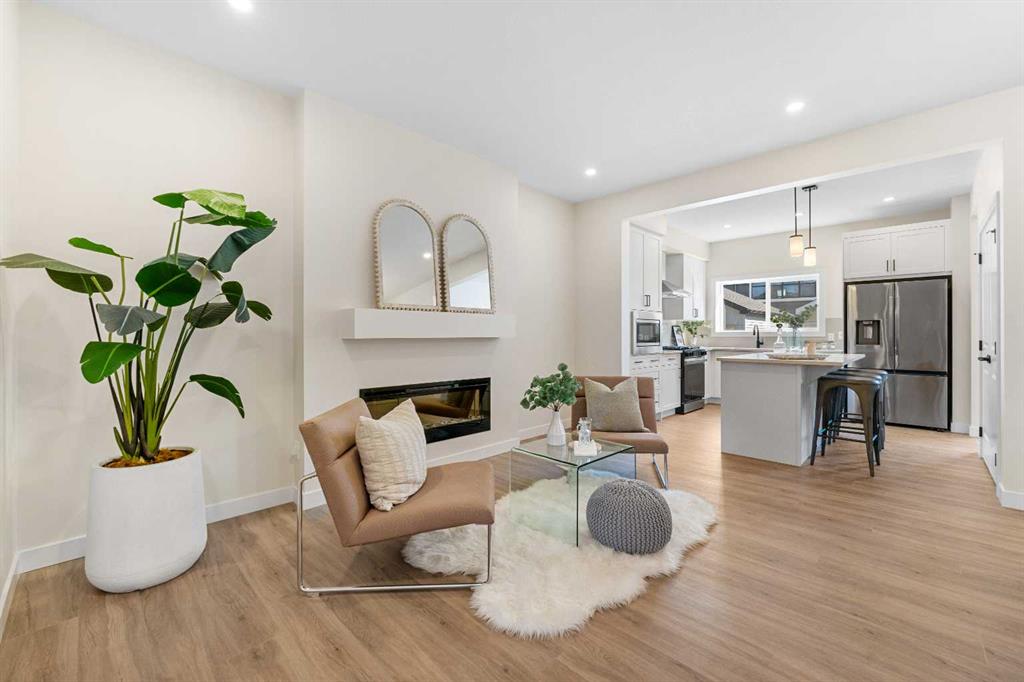 ** Brand New, Move in Ready Home built by Genesis Homes with a LEGAL 2 Bedroom Basement Suite ** The Amber | Stunning Open Floor Plan | Top of the Line Finishes | Sparkling Kitchen | Quartz Countertops | Stainless Steel Appliances | Kitchen Island | Barstool Seating | Pantry | 50″ Electric Fireplace | Wide Plank LVP Flooring | Recessed Lighting | Expansive Living Space | Main Level Flex Room | Upper Level Bonus Room | Upper Level Laundry | Totaling 5 Bedrooms & 3.5 Bathrooms | Legal 2 Bedroom Basement Suite | Separate Entry | Separate Laundry | 9Ft Basement Ceilings | Great Backyard | Double Detached Garage | Alley Access | Steps Away from the Future Park. Welcome to your brand new 2-storey family home boasting 1,610 SqFt throughout the main and upper levels with an additional 747SqFt legal 2 bedroom basement suite. Step inside to a foyer with open to below ceiling and views into the open floor plan main level. This home was designed with style and comfort at the forefront; wide plank LVP flooring, large windows, recessed lighting, high ceilings and more! The front flex room is ready for anyone with a work-from-home lifestyle or can easily be used as a day seating entertainment room. The great room is both spacious and comfortable plus has a stylish flare of a 50″ electric fireplace. Next are the kitchen, family and dining rooms. The kitchen is outfitted with a sparkling quartz countertop, stainless steel appliances, ample cabinet space and a centre island with barstool seating. The dedicated dining room is ready for you to enjoy all your family meals. At the rear of the home is a mud room with closet storage and a door to your back yard and rear double detached garage. The main level is complete with a 2pc bath. Upstairs you’ll find 3 sizeable bedrooms all with wide plank LVP flooring. The primary bedroom has its very own 3pc ensuite bath and a walk-in closet. Bedrooms 2 & 3 share the 4pc bath with a tub/shower combo. The upper level hall laundry is every home owner’s dream as its located steps away from all bedrooms! Downstairs, the LEGAL 2 bedroom basement suite has a separate entry and its own laundry facility making it a completely independent level to this home. This is great as a mortgage helper or for extended family. The basement has 2 sizeable bedrooms, each with great closet space. The open floor plan kitchen and rec room provide flexibility for living and dining. The kitchen is outfitted with quartz countertops, stainless steel appliances and full height cabinets. The 4pc bath on this level has a tub/shower combo and single vanity. Outside is a great backyard and rear double detached garage with alley access. Hurry and book a showing at this gorgeous brand new Genesis home today!