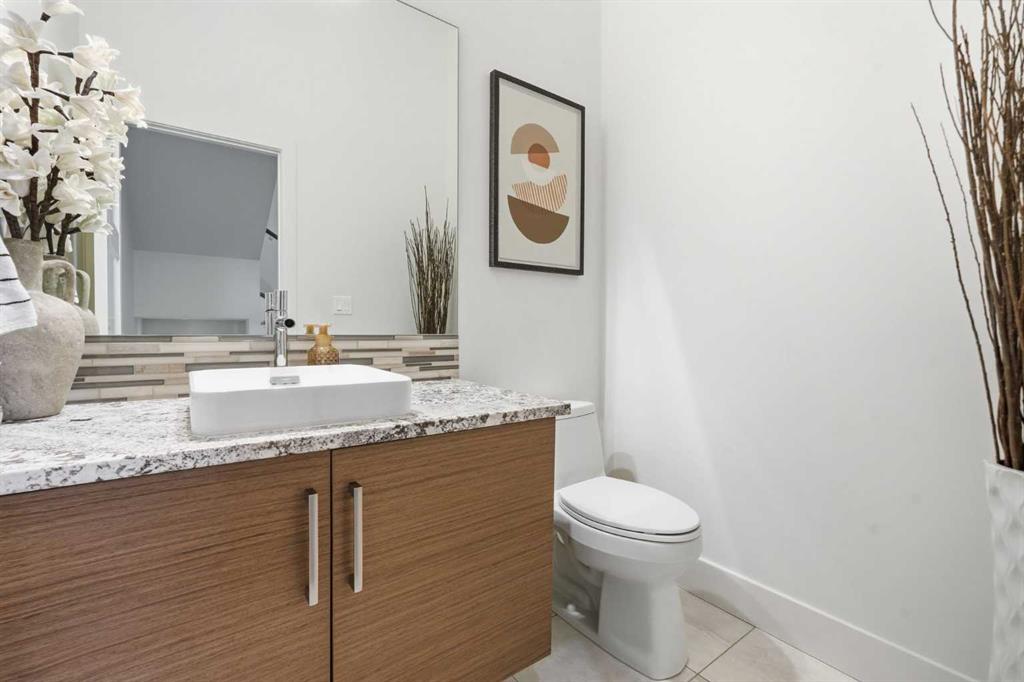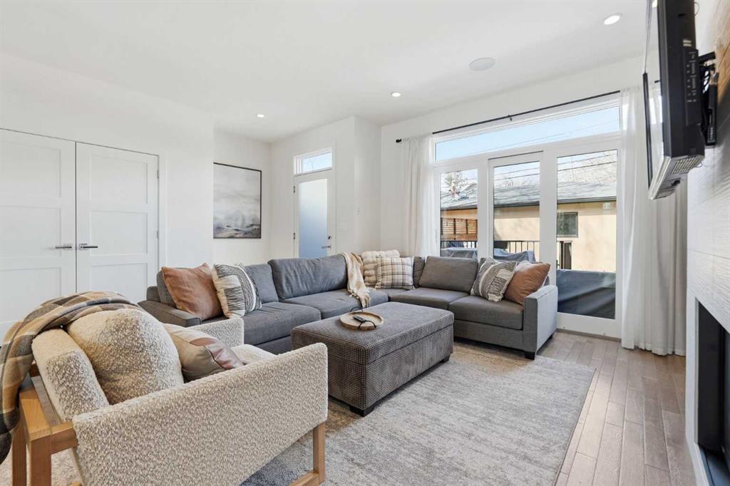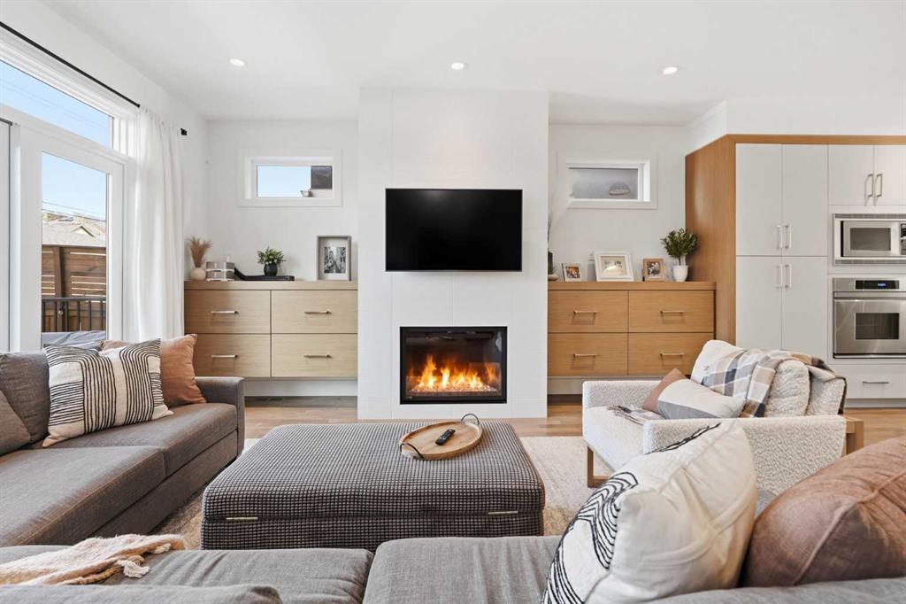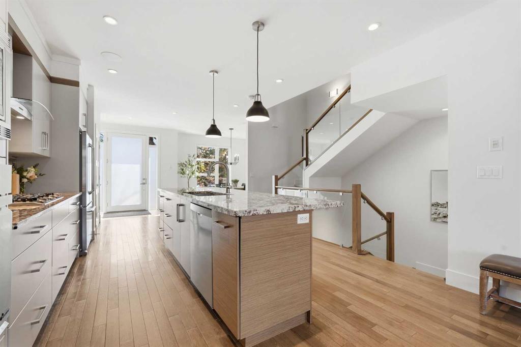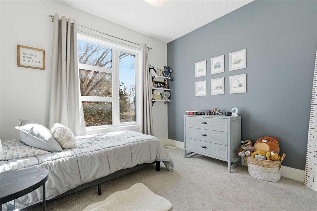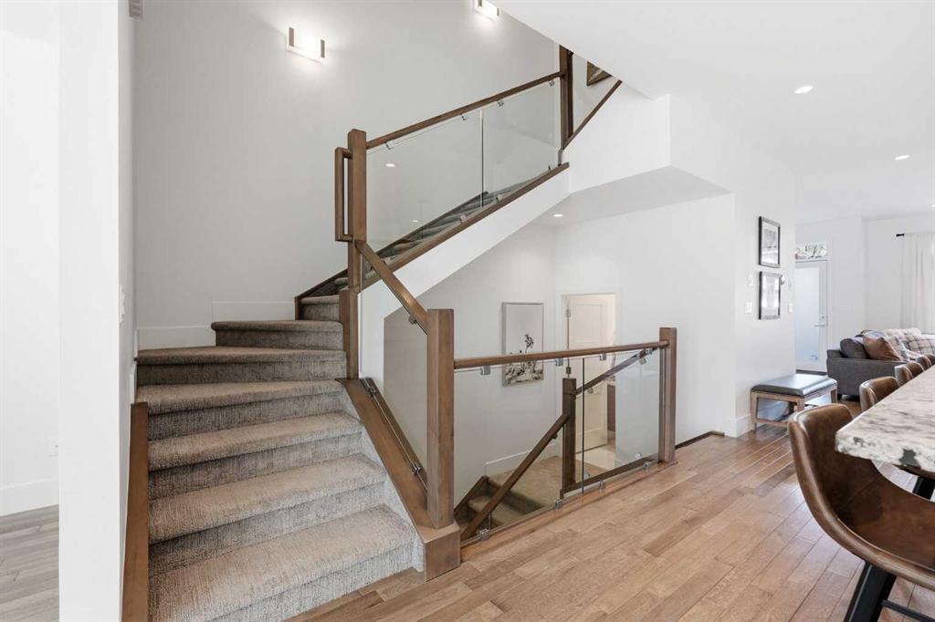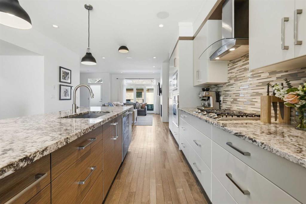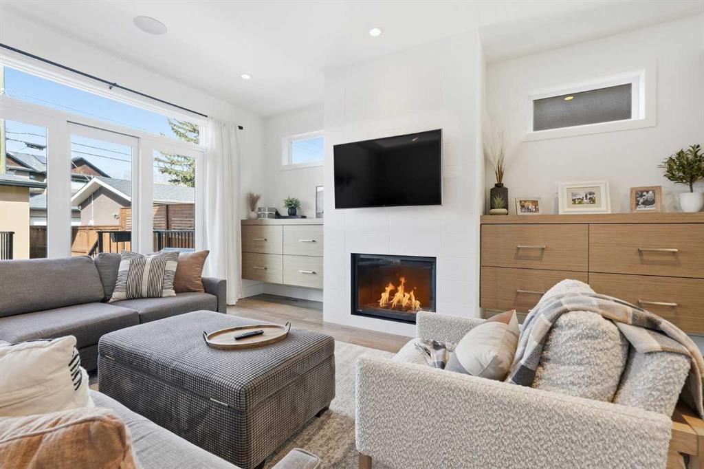 OPEN HOUSE SATURDAY, APRIL 18TH & SUNDAY, APRIL 19TH FROM 1-4 PM EACH DAY. Extreme pride of ownership is evident throughout this move in ready 3+1 bedroom home, offering over 2,700 sq ft of pristine, thoughtfully designed living space. The main level features hardwood floors and lofty ceilings, beginning with a spacious front dining room ideal for hosting family and friends. The dining area flows seamlessly into the beautifully appointed kitchen, complete with granite countertops, an island with eating bar, abundant cabinetry, and high end stainless steel appliances including a new Bosch dishwasher. The adjacent living room is anchored by a tiled feature fireplace and custom built ins. A stylish 2 piece powder room completes the main level. The upper level hosts three generous bedrooms and a 4 piece main bath. The primary retreat includes a walk in closet and a private 5 piece ensuite with in floor heat, dual sinks, a relaxing soaker tub, and a separate shower. A well appointed laundry room with sink and storage is also conveniently located on this level. The fully developed basement extends the living space with an office nook, large family/media room and a wet bar—perfect for movie nights or game day. A fourth bedroom, 3 piece bath, and dedicated storage room complete the lower level. Additional highlights include a guaranteed pet free home, central air conditioning, a 6 zone in home speaker system, custom sheer blinds on all windows, and TV mounts in both the living room and basement. Outside, enjoy a private west facing backyard designed for low maintenance living, featuring an extended deck, astro turf with a 3 hole putting green, an aggregate pathway to the garage, and an irrigated integrated planter. The double detached garage accessed from the paved back lane, is insulated, drywalled, and heated for year round comfort. This beautifully maintained home is ideally located close to schools, parks, shopping, public transit, and offers quick access to 26th Avenue, Richmond Road, and Crowchild Trail.