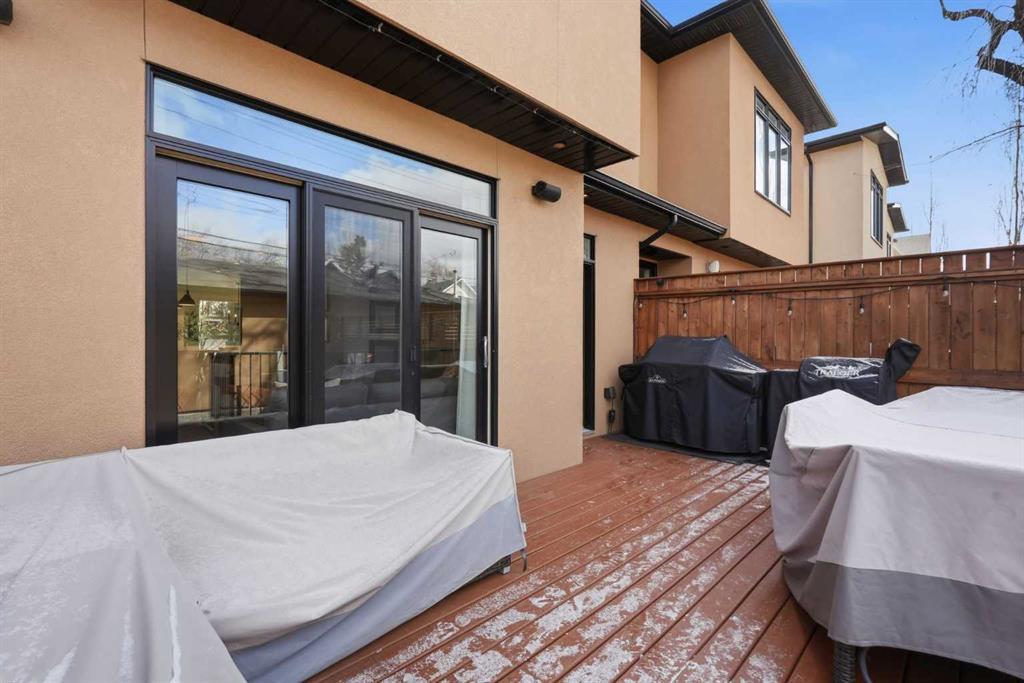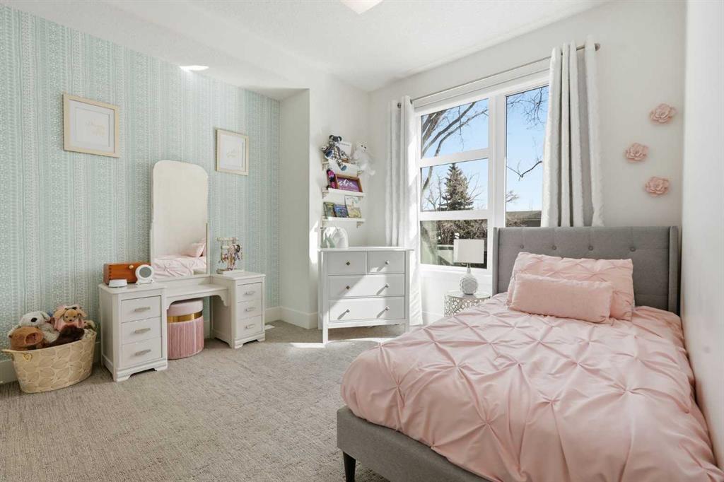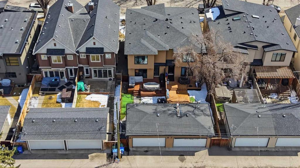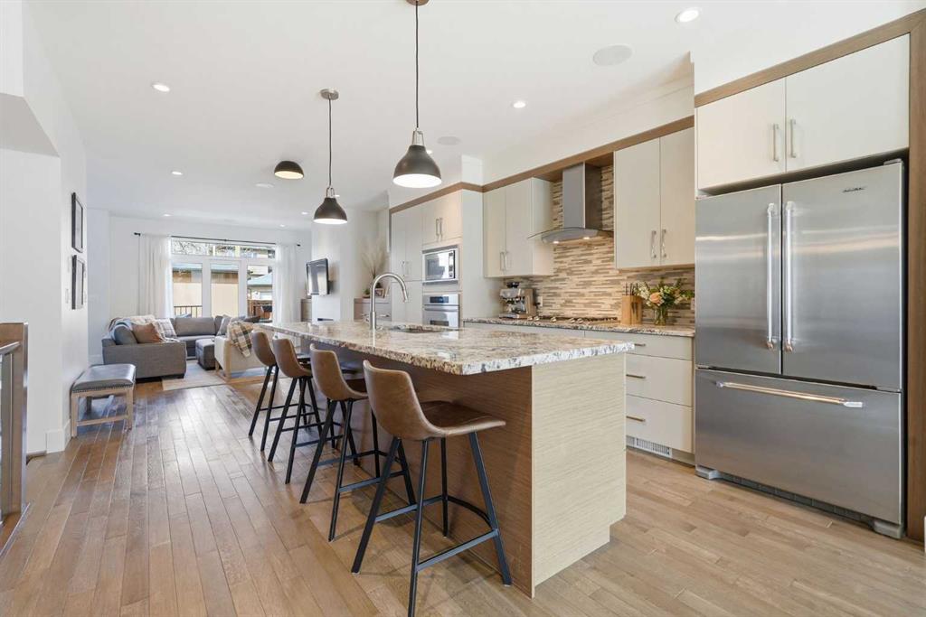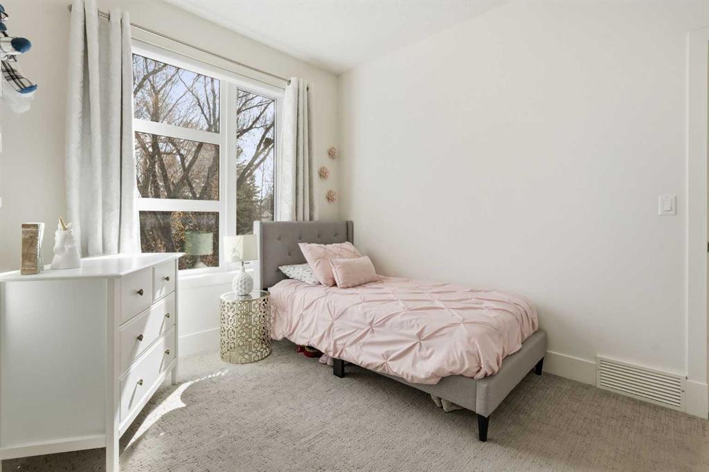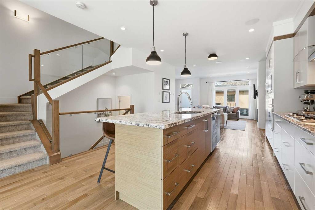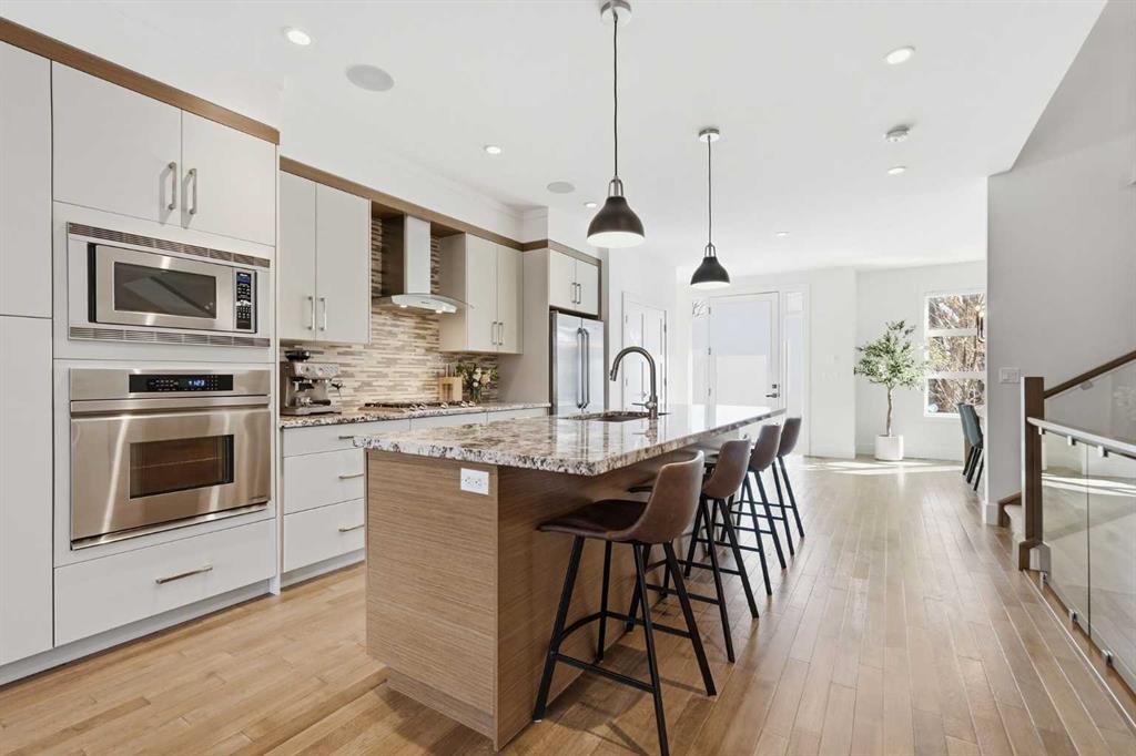 OPEN HOUSE SATURDAY, APRIL 18TH & SUNDAY, APRIL 19TH FROM 1-4 PM EACH DAY. Extreme pride of ownership is evident throughout this move in ready 3+1 bedroom home, offering over 2,700 sq ft of pristine, thoughtfully designed living space. The main level features hardwood floors and lofty ceilings, beginning with a spacious front dining room ideal for hosting family and friends. The dining area flows seamlessly into the beautifully appointed kitchen, complete with granite countertops, an island with eating bar, abundant cabinetry, and high end stainless steel appliances including a new Bosch dishwasher. The adjacent living room is anchored by a tiled feature fireplace and custom built ins. A stylish 2 piece powder room completes the main level. The upper level hosts three generous bedrooms and a 4 piece main bath. The primary retreat includes a walk in closet and a private 5 piece ensuite with in floor heat, dual sinks, a relaxing soaker tub, and a separate shower. A well appointed laundry room with sink and storage is also conveniently located on this level. The fully developed basement extends the living space with an office nook, large family/media room and a wet bar—perfect for movie nights or game day. A fourth bedroom, 3 piece bath, and dedicated storage room complete the lower level. Additional highlights include a guaranteed pet free home, central air conditioning, a 6 zone in home speaker system, custom sheer blinds on all windows, and TV mounts in both the living room and basement. Outside, enjoy a private west facing backyard designed for low maintenance living, featuring an extended deck, astro turf with a 3 hole putting green, an aggregate pathway to the garage, and an irrigated integrated planter. The double detached garage accessed from the paved back lane, is insulated, drywalled, and heated for year round comfort. This beautifully maintained home is ideally located close to schools, parks, shopping, public transit, and offers quick access to 26th Avenue, Richmond Road, and Crowchild Trail.