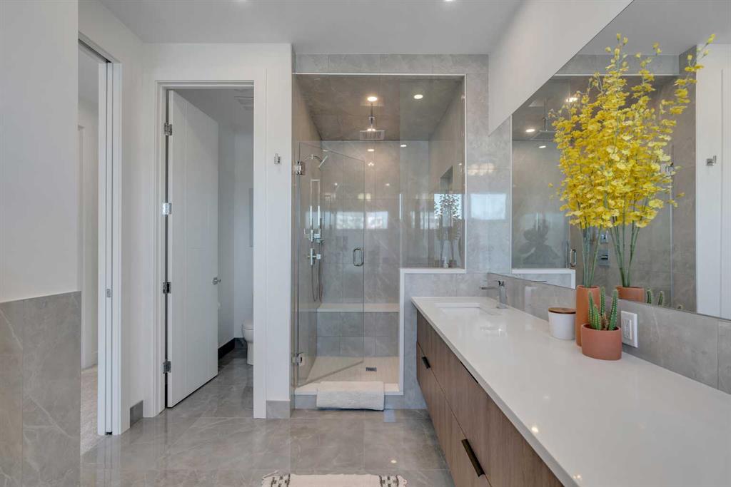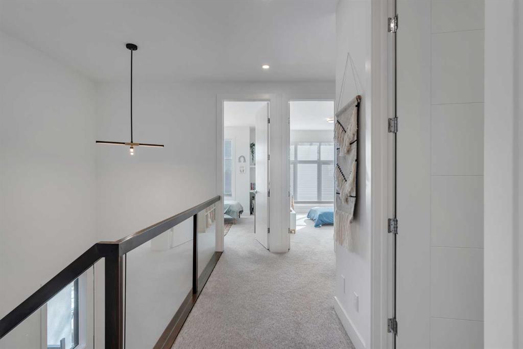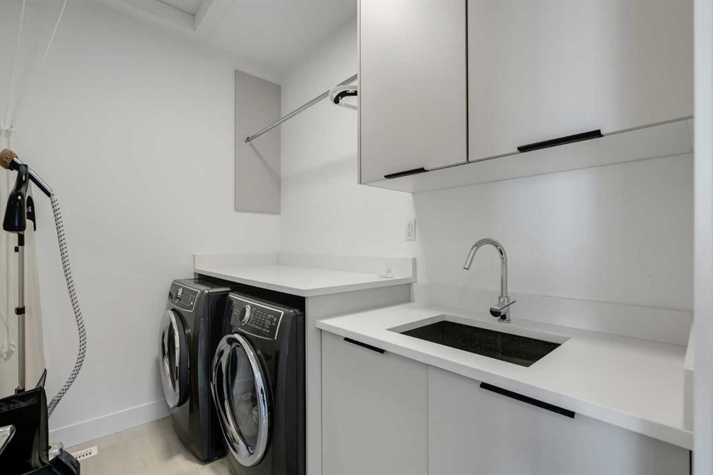 Upstairs boasts 3 spacious bedrooms, upper laundry with sink, a full 4-pc bathroom. The primary bedroom includes a walk-in custom closet with organizers, and a 5-pc spa-like ensuite featuring, heated tile floors, enclosed toilet area, a double vanity, oversized walk-in tiled shower. Skip the spa with upgraded rain shower fixtures, and a showstopping standalone soaker tub right in your own ensuite. Custom blackout window coverings in every bedroom and central AC throughout for those hot summer days.
