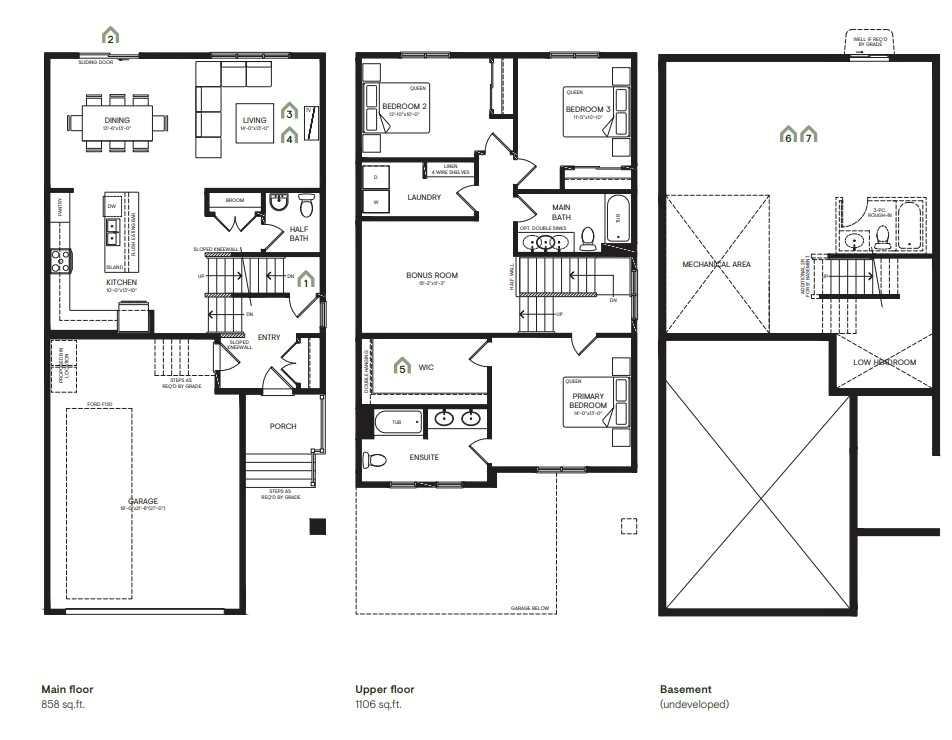 Welcome to the Marigold 3! This beautifully designed 4-bedroom, 2.5-bathroom home offers the perfect blend of comfort and style, ideal for growing families or those who love to entertain. The primary ensuite comes with a tiled standing shower, while the additional bonus room provides the flexibility for a home office, playroom, or media space. The open-concept main floor features upscale finishes, including a chimney-style hood fan, kitchen cabinets to the ceiling, a built-in microwave, gas rough in’s for the stove and railings leading to the second floor, adding a touch of elegance throughout. Thoughtfully laid out with both function and flow in mind, the Marigold 3 offers a modern living experience in every corner. Photos are representative.