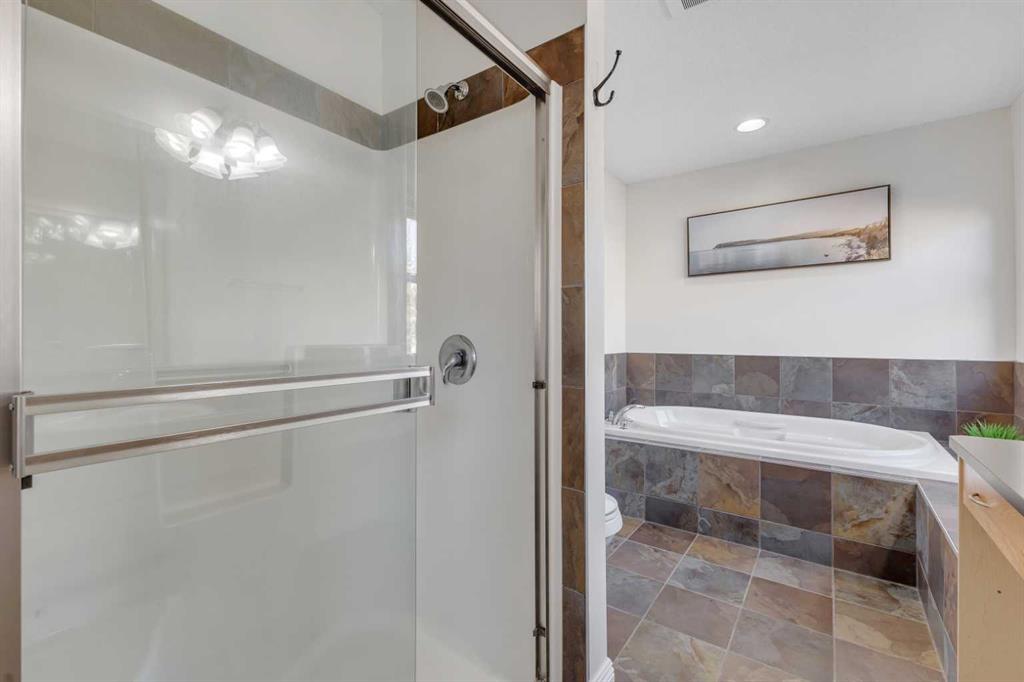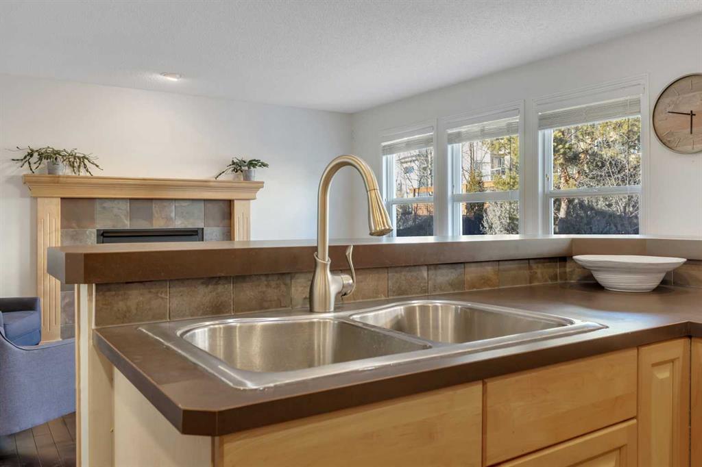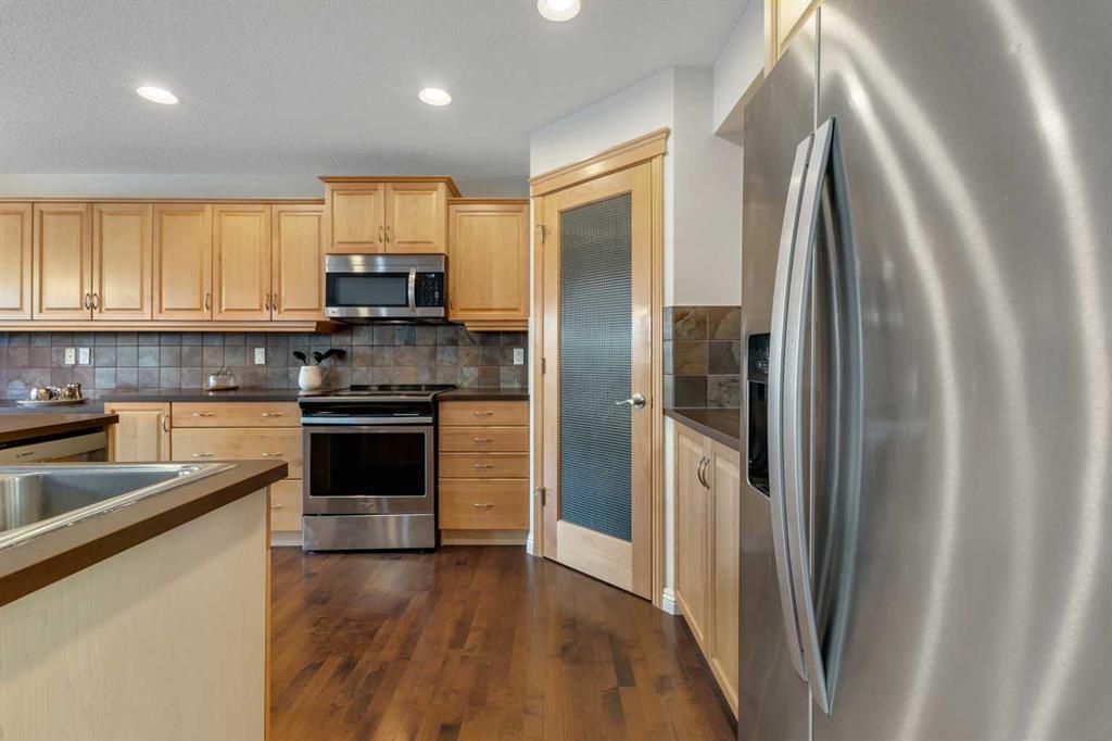 Cochrane’s popular Sunset Ridge has green spaces, walking paths, ravines, schools, shopping & more. This beautiful 2 Storey is close to Cochrane Ranch House, Sunset Pond, Sunset Park & St. Timothy Jr/Sr school. Stepping inside the home you will see natural light throughout. Tastefully remodeled, all 3 levels flow nicely with same color tones & design. The main floor flex room is the first room you see when you enter. Great space for home office, dining room, or sitting area. By garage entrance, leading from the laundry, there are 10 coat hooks for your family. The laundry room has stackable washer/dryer, counter space, broom closet & extra cabinets. Walking into the kitchen & family room area will impress you, all the counter space, kitchen island, work area etc. Kitchen has 9 drawers, 8 double cabinets, 3 single door cabinets & 1 corner cabinet. Corner pantry has 4 levels of wire racks. A great kitchen for the cook & baker. One area of the cabinets has a bit lower counter, where you can put a couple chairs. The kitchen nook is bright with a door(glass insert)leading to the back yard.The other 2 walls have double height windows, again natural light. Watch kids play in the yard while having your coffee or cooking. The island has plenty of room to fit 5 stools. If you are the family that gravitates to the kitchen, you will love this kitchen. Front room is adjacent to the kitchen. The gas fireplace has wooden moldings around the fireplace & rich brown toned tile, matching the kitchen backsplash. One side of family room looks to the back yard through the same size of windows the kitchen nook has. Soft colored walls, lighter colored wooden cabinets in the kitchen & around the fireplace, rich brown counter tops & dark hardwood floors, this home is tastefully renovated. Going up the stairs to the bedrooms, you are greeted with light flowing in from very high south facing windows. Newer light beige carpet in on the stairs. Where there is carpet, it is all the same. Reaching the top of the stairs, to the right you have a 4 piece main bath, large towel cabinet in bathroom behind the door, medicine cabinet on the wall by sink, toilet & tub/shower. All colors flow with the main level. 2 bedrooms face the front of the home. One has a walk in closet, the other has a regular closet. To the left of the stairs are 2 other large bedrooms, one the master & a 4th bedroom! The 5 pce. ensuite is very spacious with separate shower & a tile seat by the large soaker tub.The large walk in closet in the master bedroom has ample hanging & shelving space. Going to the basement we see a huge bright family room, an area for a gym or pool table & a built in play house. There is rough in for a bathroom & a storage area. The double attached garage is drywalled & has upper cabinets & work bench’s. At the side of the home is a small storage shed. The fenced back yard has a deck & patio stones. A perfect yard for the kids & adults to play. MOVE IN READY! GREAT PRICE/GREAT HOME!