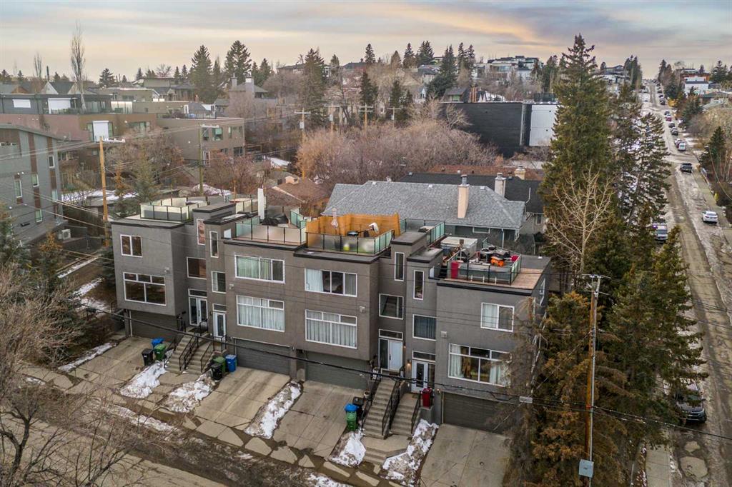 An iconic view from an unforgettable rooftop patio in the heart of Marda Loop. This 3 bedroom, 2.5 bathroom unit is walking distance to endless green spaces, local retail, and the weekly farmer’s market hosted at C-Space Art Collective half a block away. With tons of versatile space across 3 levels, this east facing home includes gleaming hardwood flooring, 2 gas fireplaces, and expansive windows that illuminate the entire main floor living area with natural light. The fully stocked chef’s kitchen features granite countertops, stainless steel appliances, a large island prep station, and dedicated food pantry, seamlessly integrating into the open concept living room that was specially crafted for entertaining. Wake up to the most beautiful sunrises with a full panoramic view from the primary bedroom upstairs, a spacious walk-in closet with built-in organizers, and a breathtaking ensuite that includes a jetted tub and rain shower with bench. The second level also boasts an additional large bedroom with its own independent ensuite for extra comfort and privacy. Indulge in plenty of storage space throughout the home, along with a third bedroom below that can be easily converted into a flex space to fit your unique lifestyle needs. The convenient double attached insulated garage is perfect for avoiding cold Calgary winters, while the ice cold A/C is ideal for beating the summer heat. Notable recent upgrades include paint throughout, newer flooring and torch-on membrane updating to the rooftop (which is fully fit for a hot tub). Situated in a highly coveted pedestrian-oriented community, walking distance to the South Calgary Outdoor Pool, shops along 33rd Avenue, and with quick access to 17th Ave SW, 14th Street and Crowchild Trail. This is being sold as an investment property and the lovely tenant in place has a lease that expires February 2029. The current rent is $3,100 per month and tenant is responsible for own utilities.