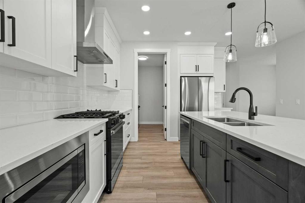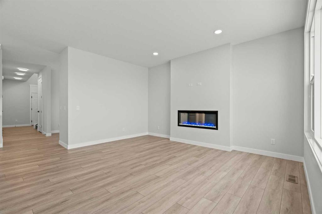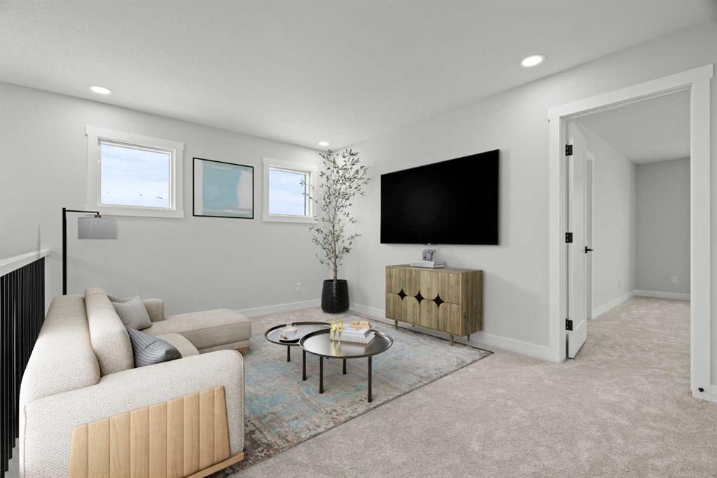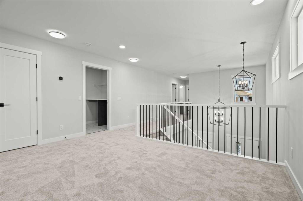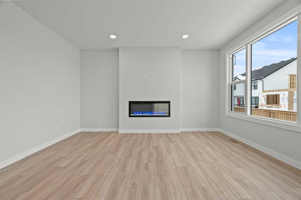 As with all Golden Homes builds, this home comes fully loaded with premium standards, including landscaping with full lot grading and loaming, sod to the side entry, and a front-yard tree; true 9′ ceilings on both the main floor and basement; tall 8′ doors on the main floor; a side entrance; a mosaic tile shower base; oversized triple-pane windows; matte black iron spindle railings and hardware; upgraded MDF shelving; upgraded carpet underlay; tankless hot water heater; smart home features and appliances; oversized quartz kitchen island; gas line to the deck; full-height painted kitchen cabinets; a complete HRV system; an electric fireplace; full-height wall tile in the ensuite shower; metal soft-close drawers; solar panel rough-in; tile flooring in all full bathrooms and laundry room; and gas line to deck.