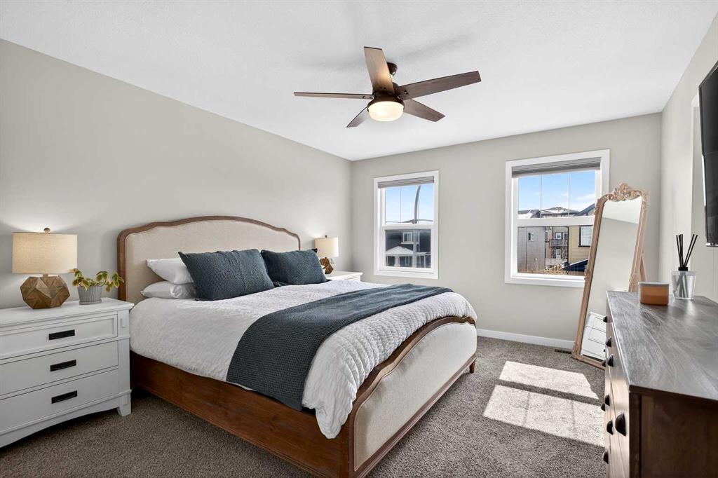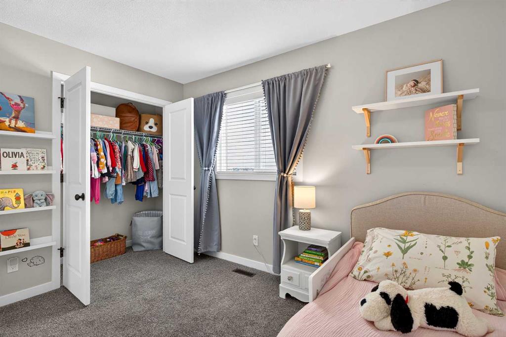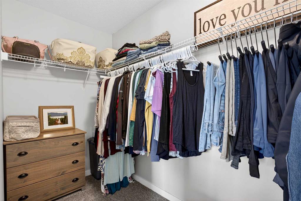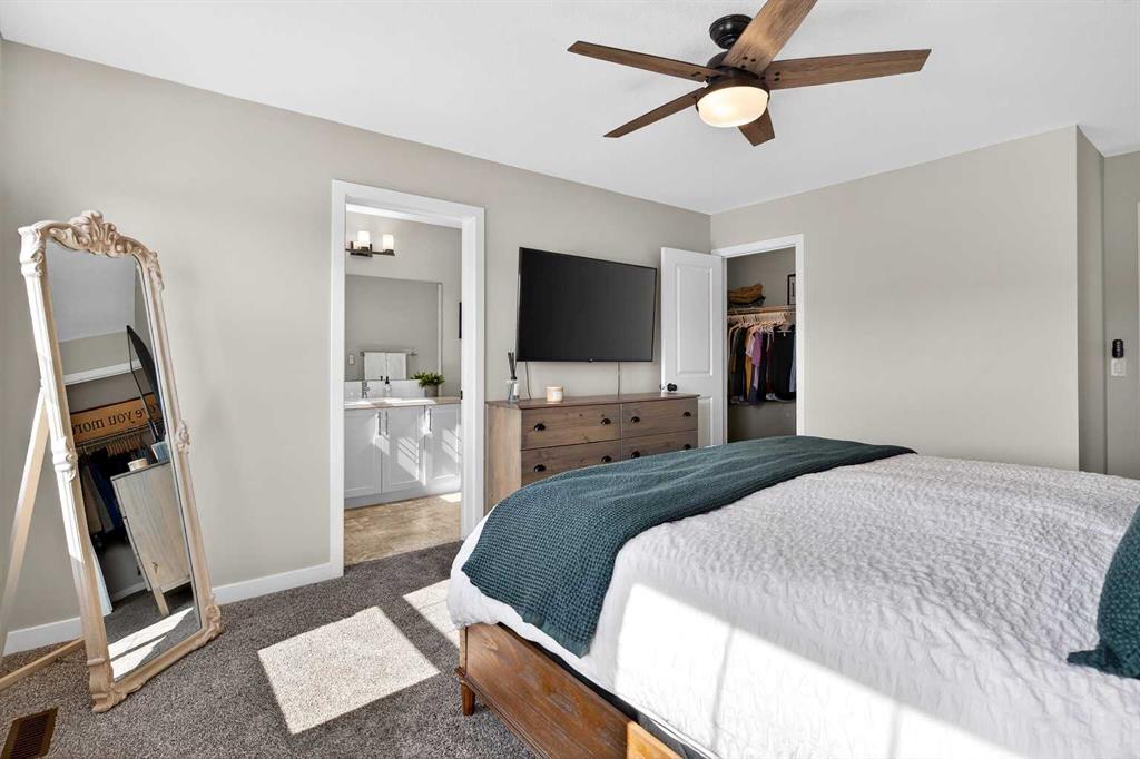 Upstairs, the bonus room sits right in the centre of the home, creating excellent separation between the primary suite and the kids’ bedrooms. The primary bedroom easily fits a king bed, features sunny windows, and a ceiling fan to keep the air moving. The ensuite includes an extra-long vanity, tidy shower, and bright window, while the walk-in closet is absolutely HUGE—you truly have to see it to appreciate it.