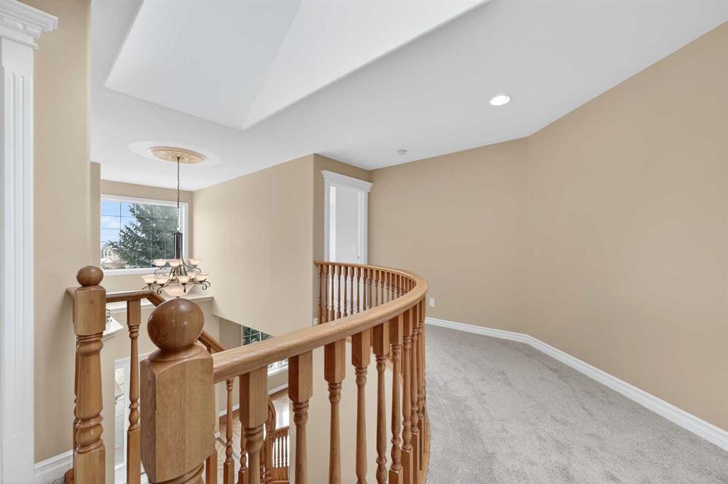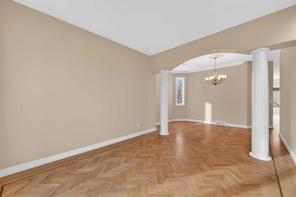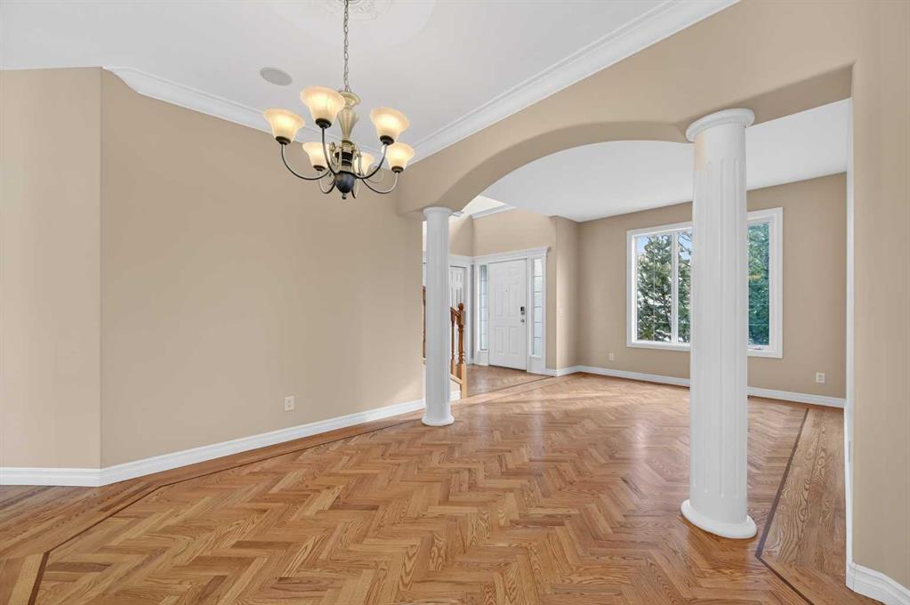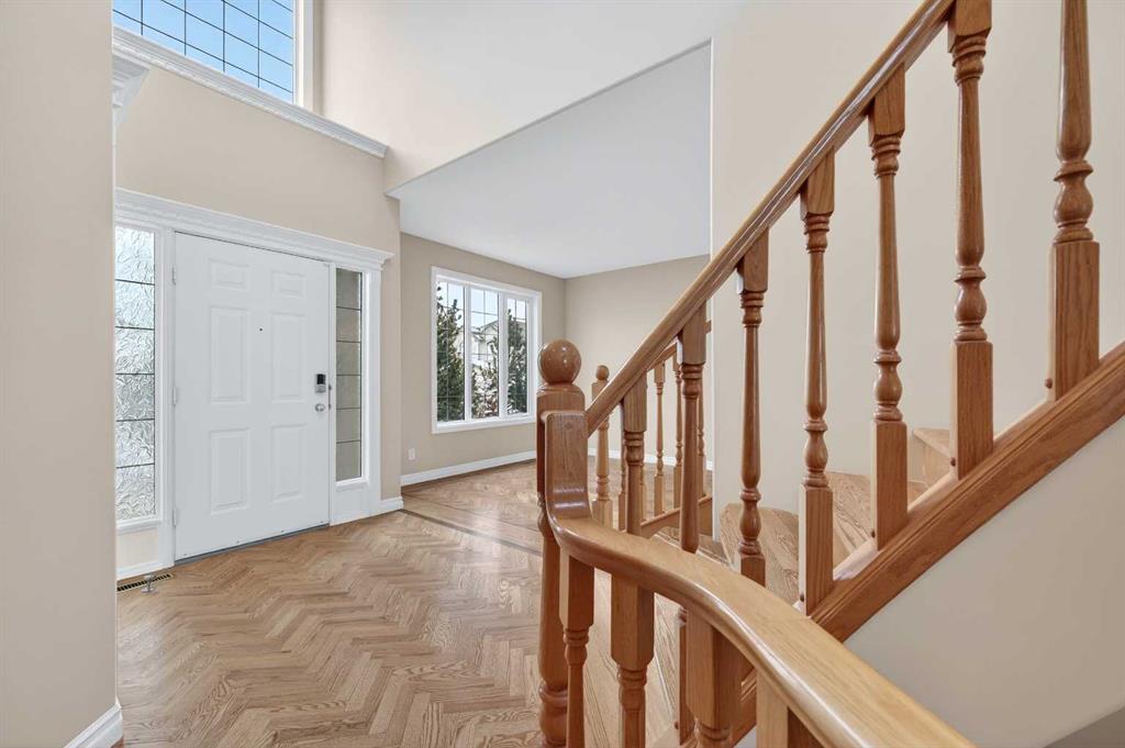 Welcome to your dream family home in the heart of the Hamptons, one of Calgary’s premier golf course communities. This stunning house makes a big impression as you enter with its soaring 18-foot ceilings, bright skylight, and beautiful curved staircase. You will love the high-end feel of the chevron-patterned hardwoods, fresh paint, and recently updated carpets throughout, and the roof was done in 2025. The main floor is perfect for family life, offering a sunny den or home office behind French doors and a formal dining area for holiday dinners.