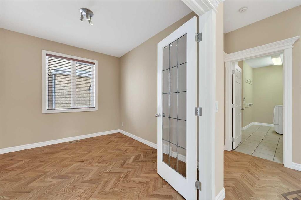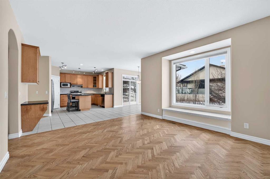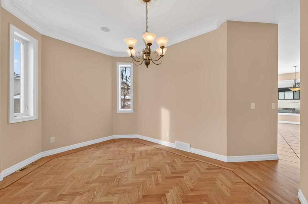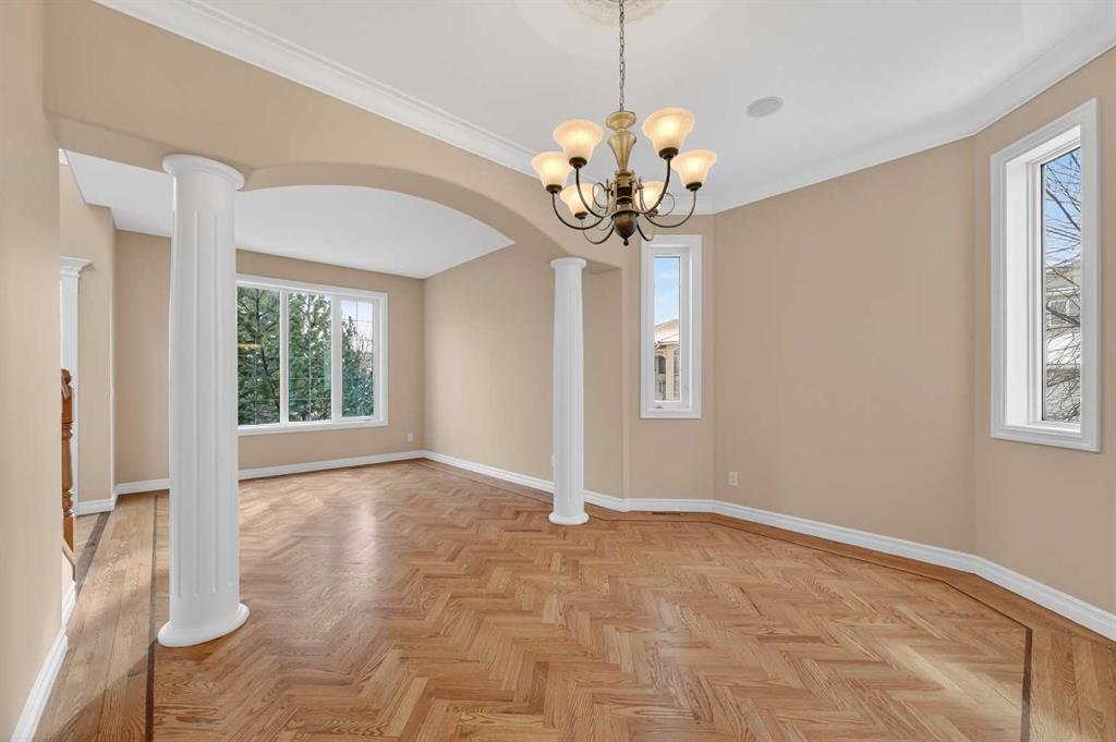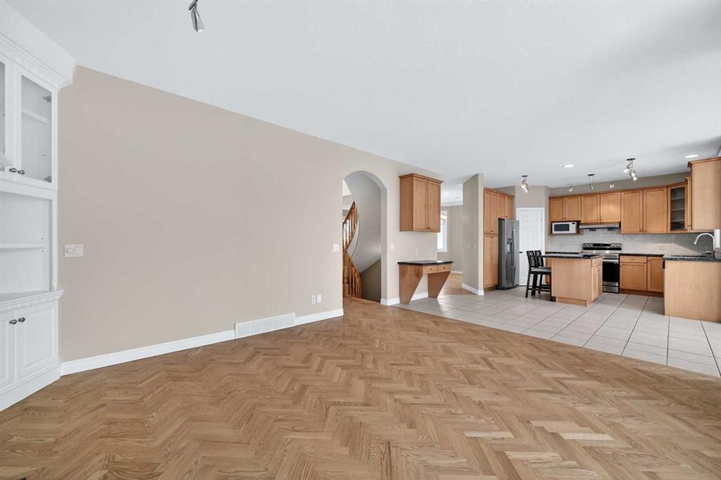 Welcome to your dream family home in the heart of the Hamptons, one of Calgary’s premier golf course communities. This stunning house makes a big impression as you enter with its soaring 18-foot ceilings, bright skylight, and beautiful curved staircase. You will love the high-end feel of the chevron-patterned hardwoods, fresh paint, and recently updated carpets throughout, and the roof was done in 2025. The main floor is perfect for family life, offering a sunny den or home office behind French doors and a formal dining area for holiday dinners.