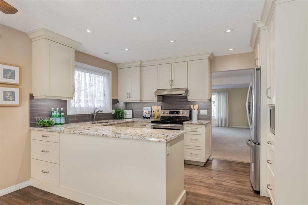 Welcome to this UPDATED and well-maintained OVERSIZED, fully finished WALK-OUT bungalow with kitchenette in the lower level, in the highly sought-after, family community of Hawkwood. This charming corner-lot home with double front attached garage offers 3 spacious bedrooms up, 3 full bathrooms, spacious south facing deck off the family room, over 2,900 Sq Ft of finished living space – perfect for family living and entertaining. You’ll love the spacious living and dining room, totally RENOVATED kitchen with an abundance of white cabinets, granite counters & stainless steel appliances. Adjacent to the kitchen is an expansive dining and family room featuring a gas fireplace – ideal for both everyday living and entertaining. Patio doors lead to the lovely south facing deck with newer vinyl covering (2020), with stairs to the backyard. Primary bedroom easily accommodates king-size furniture and features a bay window with bench, walk in closet and 4 piece ensuite bath. 2 additional bedrooms are both generously sized and 4 piece main bath completes the level. The fully developed walk-out basement includes a huge recreation room with cozy gas fireplace, kitchenette, two rooms (windows are not egress size), 4 pc bath and patio doors to the backyard. An ideal space for guests or extended family. The backyard offers a large green space with mature landscaping, planter boxes with many perennials – a beautiful space for your summer enjoyment! You’ll appreciate all the updates completed in the home over the years: Hardwood floors in the bedrooms (2008) and luxury vinyl plank flooring in kitchen & family room (2016), new flooring in basement (2009), all main floor windows and both patio doors replaced (2011), new shingles (2018), high efficiency furnace (2010), front and back landscaping redone over the past 5 years. Enjoy this convenient location with easy access to transit and main traffic routes. Don’t miss out on this fantastic opportunity – book your viewing today!