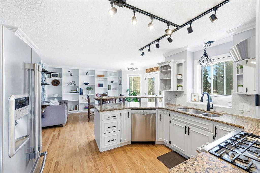 OPEN HOUSE Saturday April 18th, from 1:00-3:00 pm- Welcome to this beautifully updated and thoughtfully designed 4-bedroom walkout home, ideally situated on a quiet court in one of Cochrane’s most sought-after locations. Set on a generous, landscaped lot backing onto the 9th hole, this property offers the perfect blend of privacy, views, and everyday convenience—just steps to the Bow River pathways and a short walk to SLS Recreation Centre, and downtown amenities. From the moment you arrive, you’ll be captivated by the home’s inviting curb appeal, featuring an expansive front porch with updated glass railings—an ideal spot to take in the warm western sun and stunning evening sunsets. Inside, the bright and airy main floor is filled with natural light, showcasing rich hardwood floors, modern lighting, and a thoughtfully updated kitchen complete with granite countertops, a gas stove, stainless steel appliances, and unique touches like a dedicated coffee station and convenient built in shelving. The dining room and kitchen breakfast nook both open to the show-stopping enclosed screen porch—your three-season escape overlooking the golf course, perfect for enjoying peaceful, sun-filled mornings in a sheltered, wind-free extension of your living space. The sunroom also features a newly updated roof, allowing an abundance of natural light to pour into the home. Upstairs, the spacious primary suite offers a true sanctuary, complete with a beautifully renovated ensuite featuring quartz countertops, a spa-inspired tub, and a spacious new walk-in shower. A custom barn door enhances privacy, while additional features such as custom window coverings and a dedicated window A/C unit ensure year-round comfort. Two additional bedrooms and a full bathroom complete the upper level. The fully finished walkout basement expands your living space with a generous recreation and entertainment area, a cozy gas fireplace, a fourth bedroom with an expansive closet, a full bathroom, and flexible space ideal for a cozy home office or storage room Step outside to the covered patio, already wired for a hot tub, and enjoy seamless access to the backyard oasis. Outdoors, the property continues to impress with extensive low-maintenance landscaping, featuring a beautiful selection of shrubs and perennials for vibrant seasonal color. A charming garden shed, updated exterior lighting, and modernized deck skirting add both function and style. Additional highlights include a double attached garage with built-in loft storage, a dedicated insulated bike storage room, and a workbench with tool wall. The home also features a gas BBQ hookup, an operational security system with cameras (no contract), and recently serviced mechanical systems, including furnace, humidifier, hot water heater and recently cleaned vents. With incredible neighbours, a peaceful setting, and an unbeatable location just 400 metres to the river and pathways, this is a rare opportunity to own a move-in ready home that truly has it all!