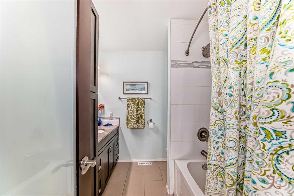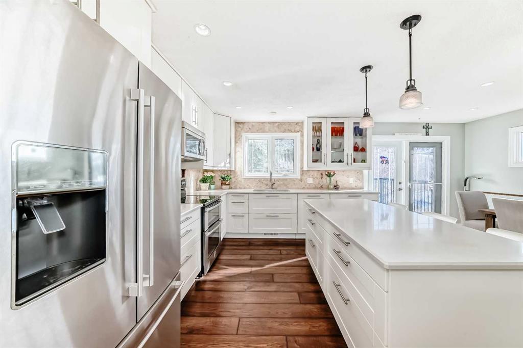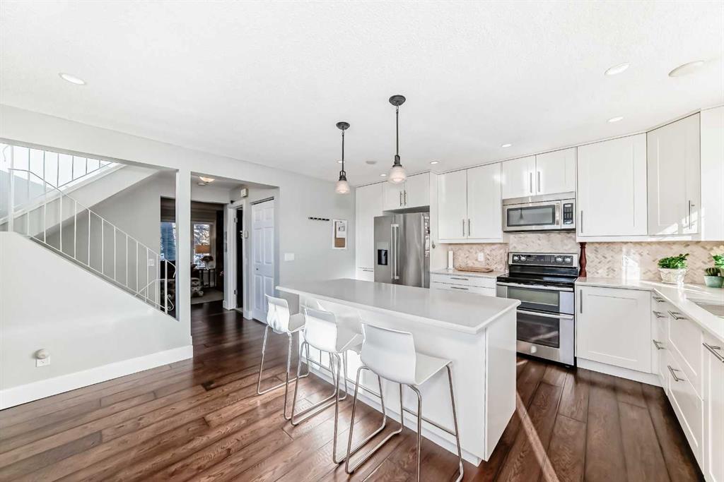 Beautiful walkout 2 storey half duplex with so many upgrades including a very bright kitchen with an array windows and an impressive display of modern floor to ceiling shaker style cabinets, Pantry with pull outs, more than 6 banks of drawers spread out between island and wall cabinets, uner mount lighting, large working island, recessed lighting, engineered Oak wood flooring throughout main floor, spacious dining area adjacent to kitchen with patio doors onto a very large new trex deck with metal railings. Upper level recently updated with laminate flooring, 4 pce bathroom fully renovated with granite tops, new cabinetr and frosted glass doors., large primary bedroom plus 2 secondary bedrooms on upper level. Long spacious family room with picture window and wood burning fireplace with log lighter. Walkout basement with 90% completed family room (needs flooring), rough-in and framed 3 pce bath, large mechanical room with new Furnace, Hot water heater, also doubles as laundry room. Newer maple cabinetry. Updated vinyl windows, Shingles, interlock sidewalk, and deck. Walkout lot could provide a great space to build a garage with roof top patio at same leve of walkout basement level.