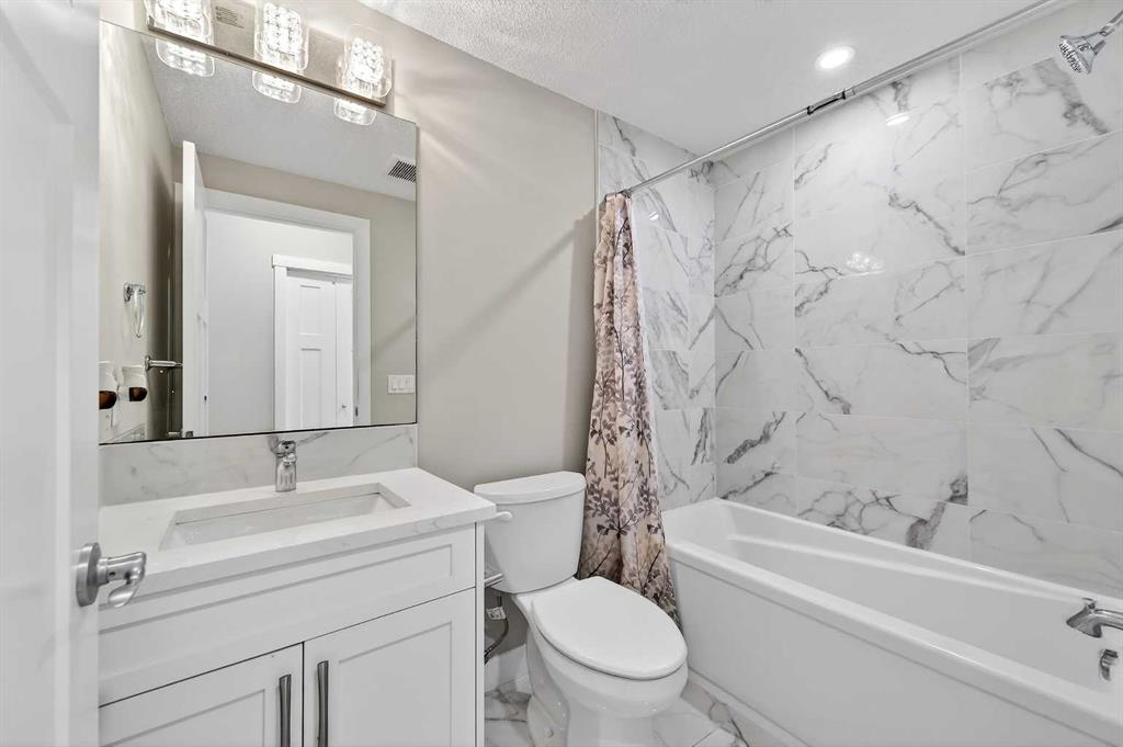 Beautifully designed 4 bedroom home offering over 2,000 sq. ft. of fully developed living space. With three bedrooms upstairs and one in the fully finished lower level, this thoughtfully laid out property combines modern finishes with functional design, perfect for families or those seeking flexible living space. A welcoming foyer opens to a bright, open concept main floor featuring 9 foot ceilings and luxury vinyl plank flooring. The stylish kitchen showcases an extended island, stainless steel appliance package, soft close cabinetry, and ample counter and cupboard space, ideal for everyday living and entertaining. Just off the dining nook, you will find access to the private back deck and fenced backyard, creating seamless indoor outdoor flow. A convenient 2 piece powder room completes the main level, along with access to the extra wide double detached garage. The fully developed lower level also features 9 foot ceilings and includes a spacious media or recreation room, versatile flex space perfect for a home office or gym, a large fourth bedroom with generous closet space, a 4 piece bathroom, and a dedicated laundry area with washer and dryer included. Upstairs, soaring ceilings and abundant natural light enhance the space. The primary suite offers a vaulted ceiling, large windows, a 4 piece ensuite, and an impressive walk in closet. Two additional bedrooms and another 4 piece bathroom complete the upper level. Adding to the home’s charm, a lovely front deck welcomes you as you walk up the front stairs, the perfect place to enjoy your morning coffee. Ideally located close to some of Calgary’s top rated schools, parks, pathways, shopping, dining, and everyday amenities, this home offers the perfect balance of lifestyle and convenience. Thoughtfully finished across all three levels, it delivers space, style, and functionality in an exceptional setting.