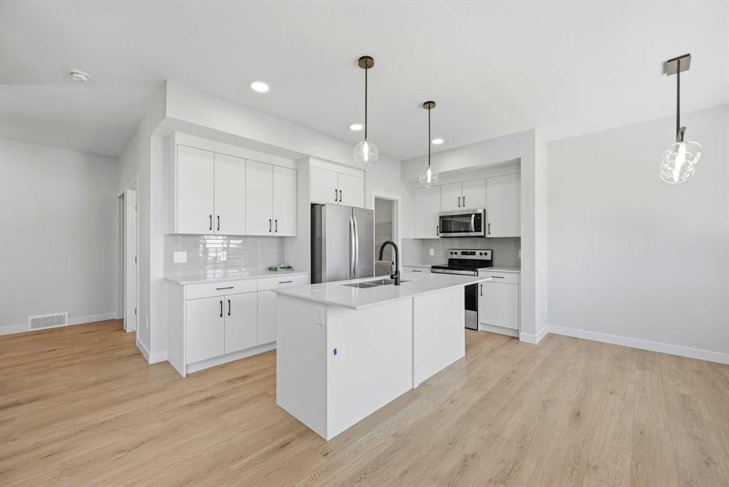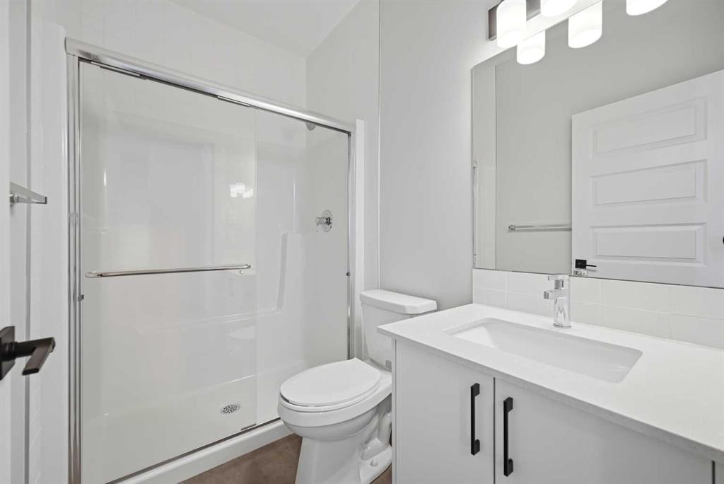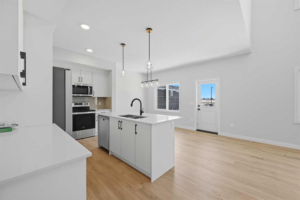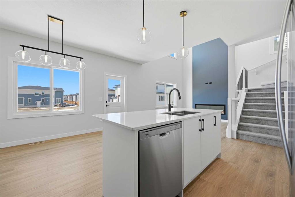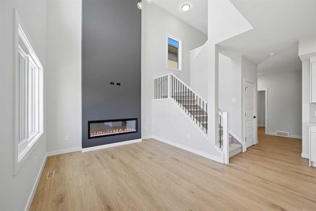 YOUR SEARCH ENDS HERE – HARD TO FIND THIS SIZE OF FRONT GARAGE SEMI-DETACHED IN CHESTERMERE AT THIS PRICE WITH FEATURES LIKE OPEN TO ABOVE, WALKOUT BASEMENT WITH DECK, MAIN FLOOR FULL BED & BATH and much more! Welcome to your new home in Waterford! Experience modern elegance in this sprawling almost 2000 Sq. Ft. home, thoughtfully designed with the modern family in mind. The main floor invites you in with a seamless open layout, highlighted by a STUNNING “OPEN TO ABOVE” LIVING ROOM featuring a custom accent wall and a sleek electric fireplace. Designed for ultimate versatility, the main level includes a RARELY FOUND FULL BEDROOM AND BATHROOM WITH A STANDING SHOWER—perfect for elderly parents, guests, or a quiet home office. The chef-inspired L-SHAPED KITCHEN BOASTS A WALKTHROUGH PANTRY leading to a highly functional mudroom. The decent sized 19X10 Ft. deck comes with a BBQ gas line and provides a perfect space for summer gatherings and a morning coffee. Upstairs, discover a spacious bonus room bathed in natural light from the open-to-above, a convenient laundry room, and three generous sized bedrooms. The primary bedroom features a DOUBLE VANITY ENSUITE, much needed walk-in shower, and a spacious walk-in closet. The unfinished BRIGHT WALKOUT BASEMENT is prepared for future development, FEATURING A SEPARATE REAR ENTRY, EXTENDED 9 FT. HEIGHT, 2 DECENT SIZED REAR WINDOWS, and a mechanical room tucked away to maximize floor space. Situated on the southwest edge of Chestermere, Waterford offers a peaceful “Lake City” lifestyle with a quick commute to Calgary via easy access to Glenmore Trail and 17th Ave. You are a few minutes away from Rainbow Creek Elementary and Chestermere Lake Middle School, as well as local groceries and popular restaurants. Move-in ready and just minutes from the water—your lakeside retreat awaits! View the 3D tour and book your showing today.