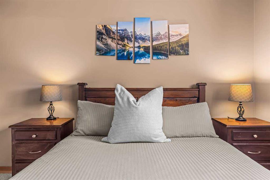 With a 4.95 star rating and generating amazing revenue in 2025 with opportunity for more, this two bedroom unit provides an excellent opportunity as a short term rental property. It has an open concept kitchen and living area with a stone faced gas fire place, abundant natural light from large windows and access to a spacious deck, boasting breathtaking views of East End of Rundle and Ha Ling Peak. The bedrooms are integrated, connected by a walk through ensuite equipped with a vanity, walk in shower, tub and heated flooring. Completing the suite are an additional 2 piece bathroom and stacked laundry. The complex offers rooftop hot tubs, an indoor hot tub, fitness facilities, secure entry with elevator access, titled heated underground parking and a storage cage. Situated in Canmore Crossing, conveniently positioned in central Canmore, surrounded by amenities such as shopping, restaurants and easy access to the downtown creek/river side trail system. Its coveted tourist zoning allows for flexible ownership options, whether for full time residency or potential revenue through short term rentals.