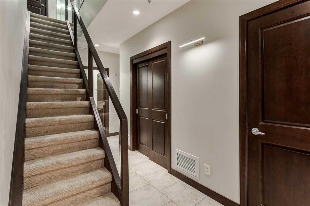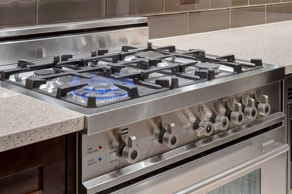 The main level opens with a WELCOMING FOYER, in-suite storage, + a 2 PC BATHROOM, all enhanced by HEATED PORCELAIN TILE FLOORS that elevate both comfort + style. The OPEN-CONCEPT LIVING ROOM is framed by TOWERING NORTH-FACING WINDOWS, while an INTEGRATED WET BAR elevates your ENTERTAINING EXPERIENCE – perfect for hosting Friends + Family. NATURAL LIGHT floods the space, highlighting the SEAMLESS CONNECTION between the living, dining, + kitchen areas. The CHEF-INSPIRED KITCHEN features a BERTAZZONI PROFESSIONAL SERIES GAS RANGE, BOSCH REFRIGERATOR, BOSCH BUILT-IN MICROWAVE, BOSCH DISHWASHER, sleek cabinetry, + a PANTRY WITH WOOD SHELVING for added functionality. Casual dining is easy at the BREAKFAST BAR. OVERSIZED GLASS DOORS open to a 20’10” x 6’5″ PRIVATE BALCONY w/ GAS LINE – your front-row seat to PANORAMIC DOWNTOWN VIEWS, glowing sunsets, and Calgary’s iconic skyline.